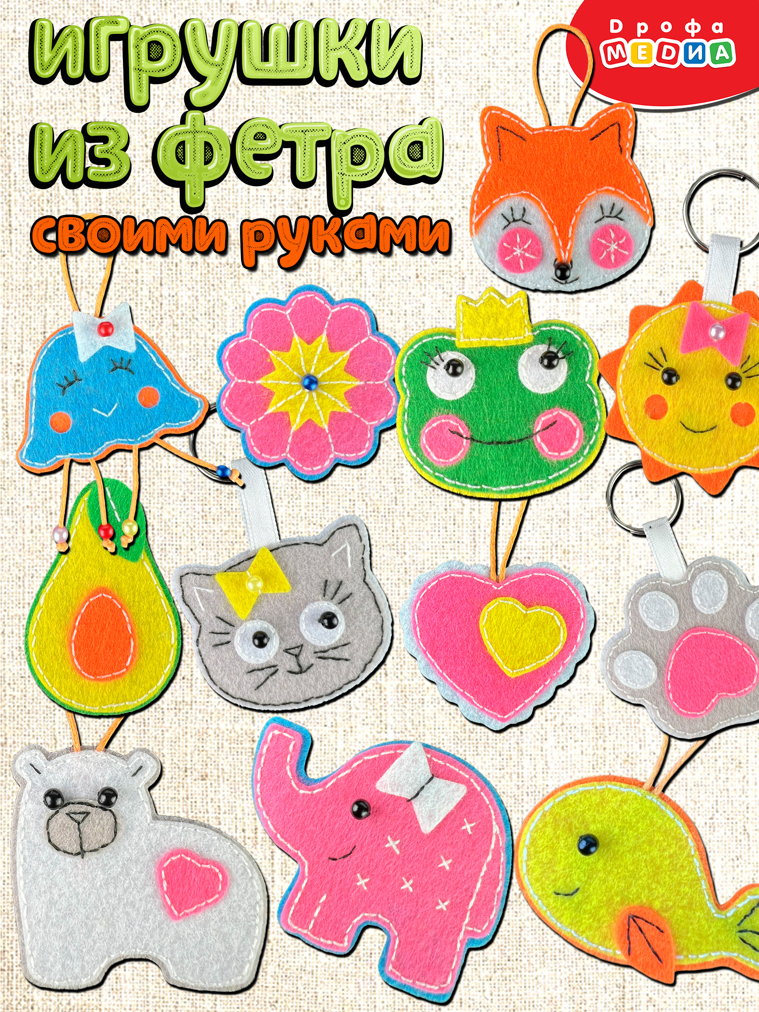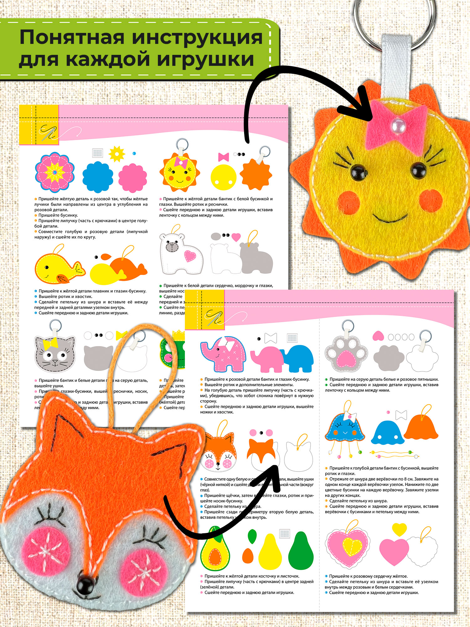 Поделки простые, доступные для изготовления детьми от 5 лет. Понятная инструкция для каждой игрушки. В наборе для творчества есть всё для создания 12 игрушек: вырезанные детали из тонкого мягкого фетра ярких цветов (8 листов), нитки и декоративные бусинки, металлическое кольцо для брелоков (3 шт.), атласная лента, шнур, липучка «велькро», инструкция. Игла в комплект не входит! Работа с иглой производится под наблюдением взрослых!