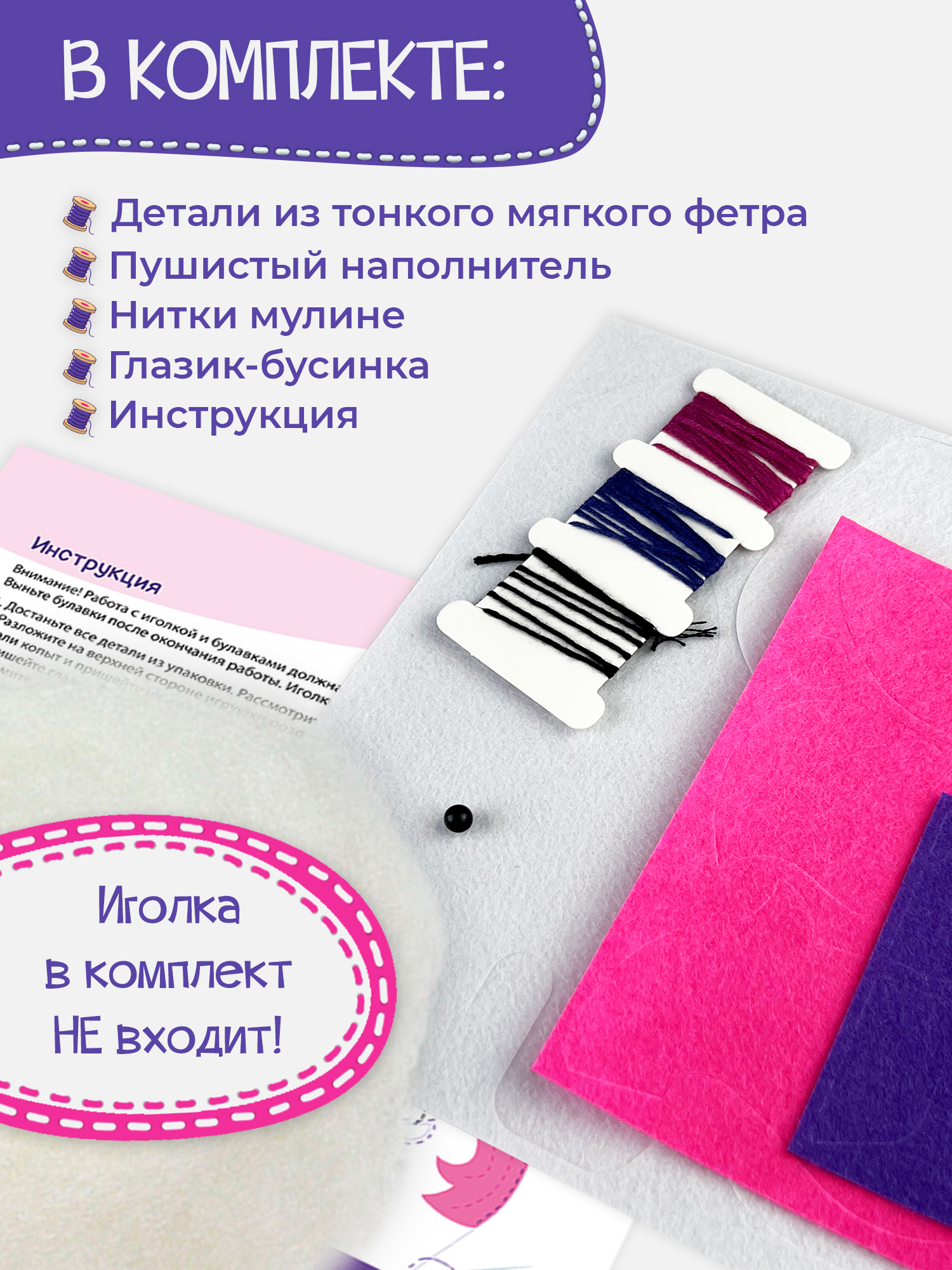 В комплекте: фетр, нитки, бусинка, наполнитель. Иголки и булавки в комплект не входят!