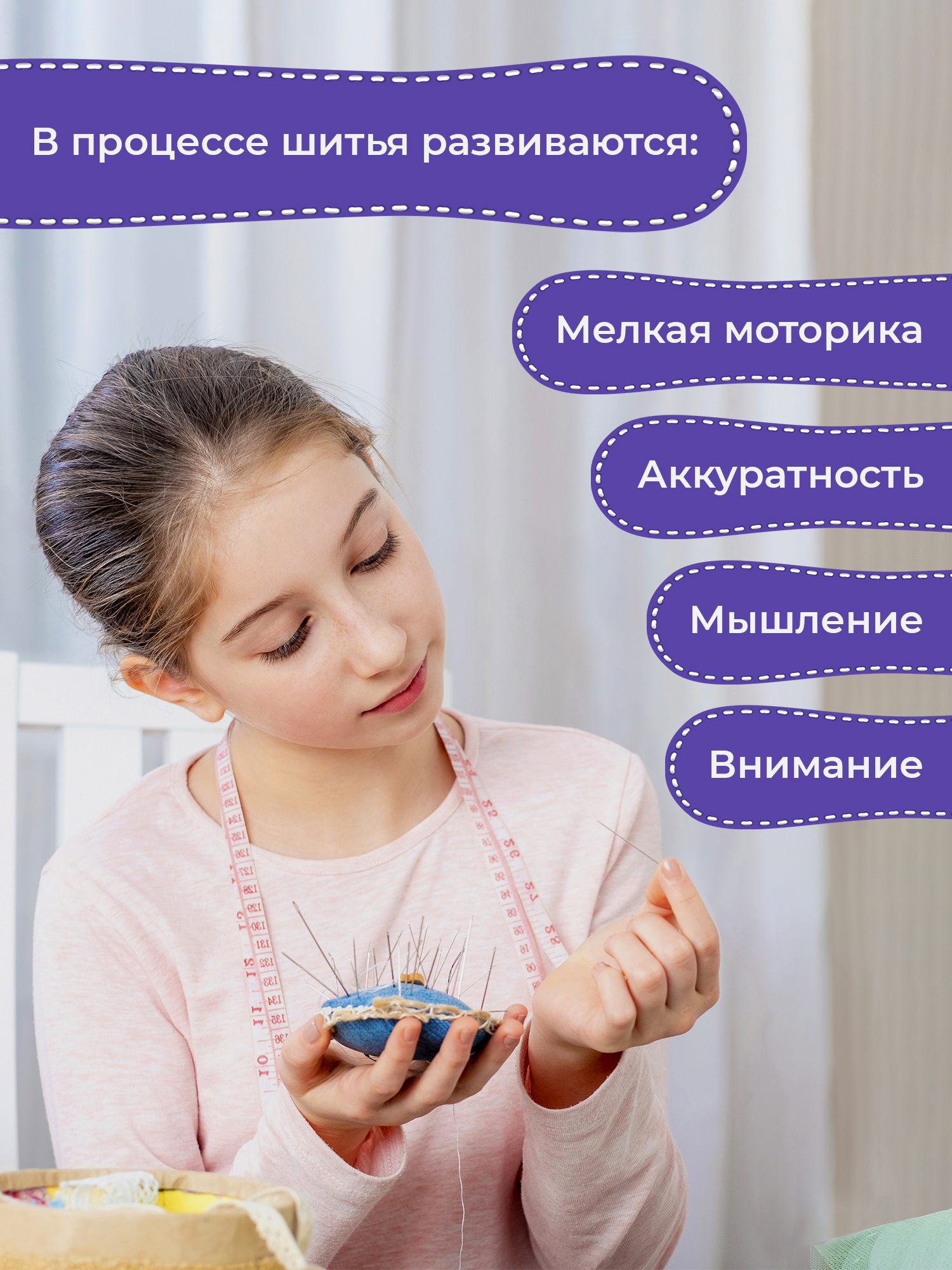 Творчество способствует развитию воображения, учит внимательности и усидчивости. В процессе шитья развивается внимание, мышление, аккуратность и мелкая моторика.