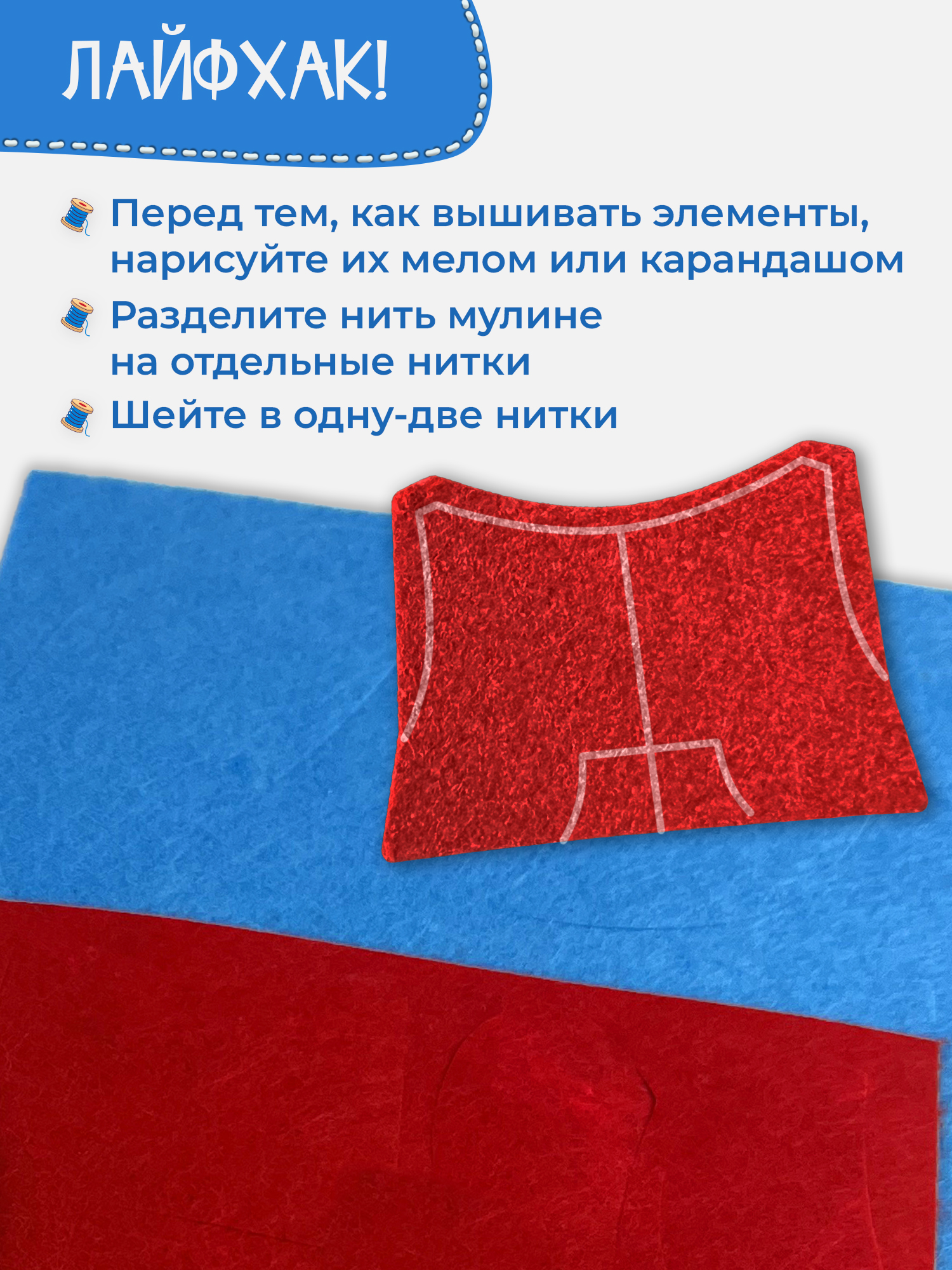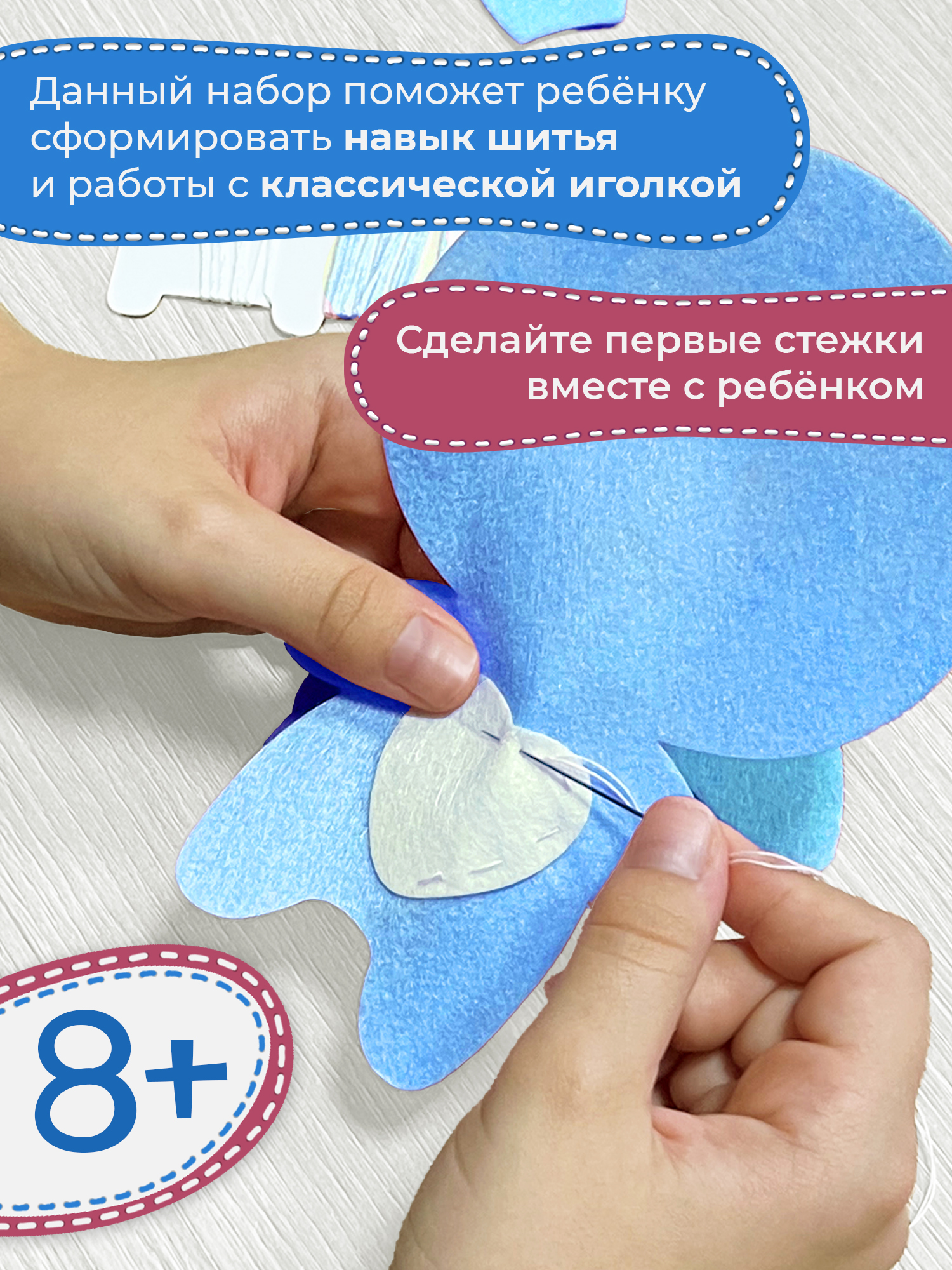 Внимание! Иголка в комплект не входит. Рекомендуем сшивать детали в одну нить (отделяя ее от мотка мулине). Перфорации на деталях НЕТ.