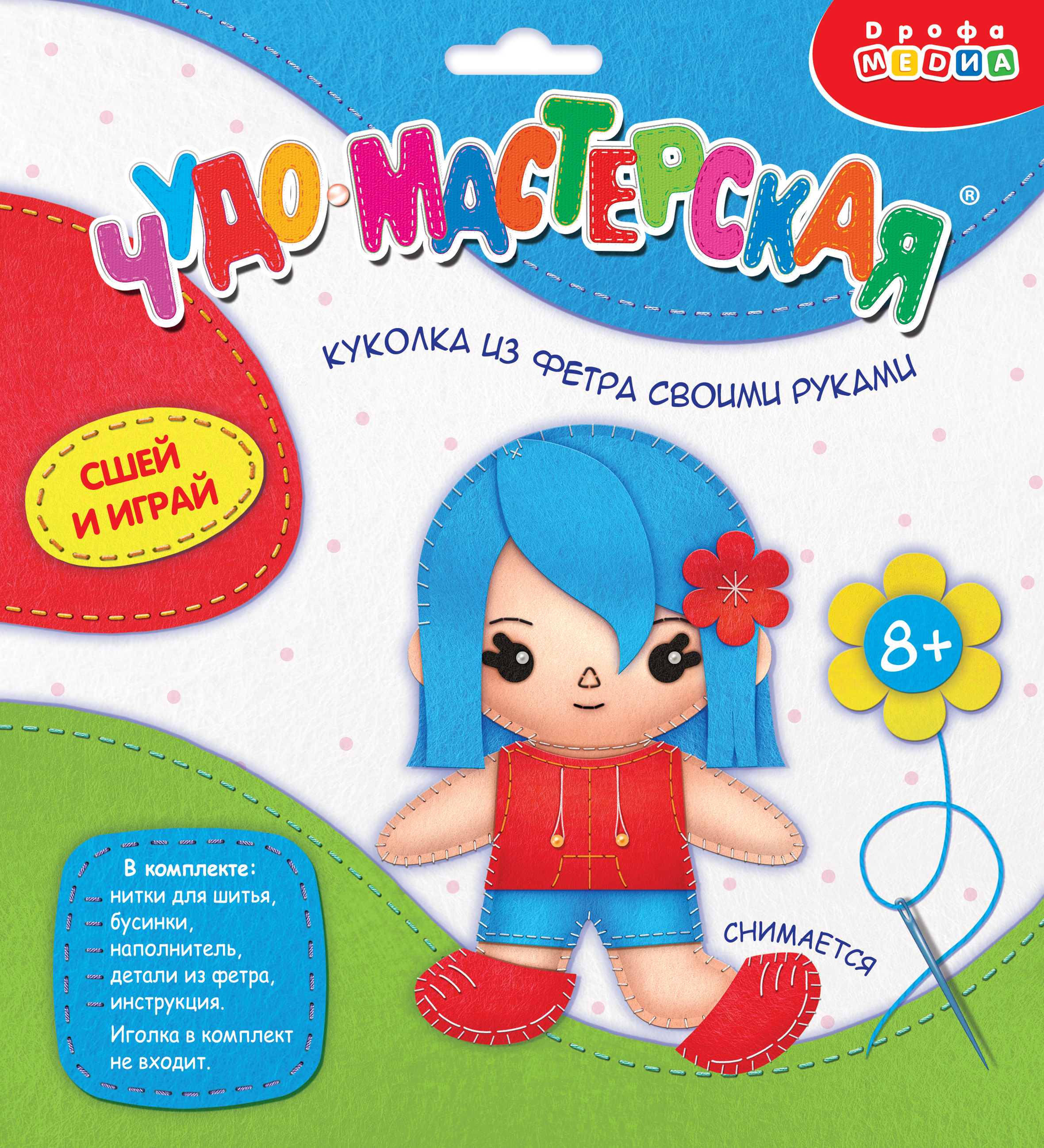 В наборе для творчества есть всё для создания милой игрушки – вырезанные детали из тонкого мягкого фетра ярких цветов, пушистый наполнитель, нитки, декоративные бусинки и подробная инструкция.
