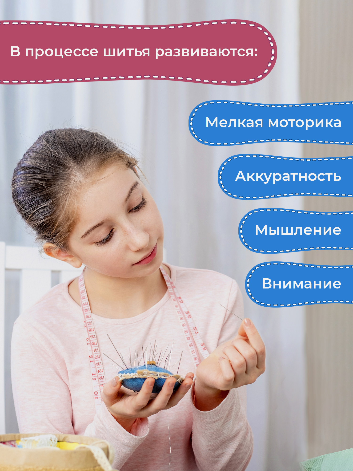 Творчество и рукоделие способствуют развитию речи и фантазии, учат внимательности и усидчивости. В процессе шитья развиваются внимание; мышление; аккуратность и мелкая моторика.