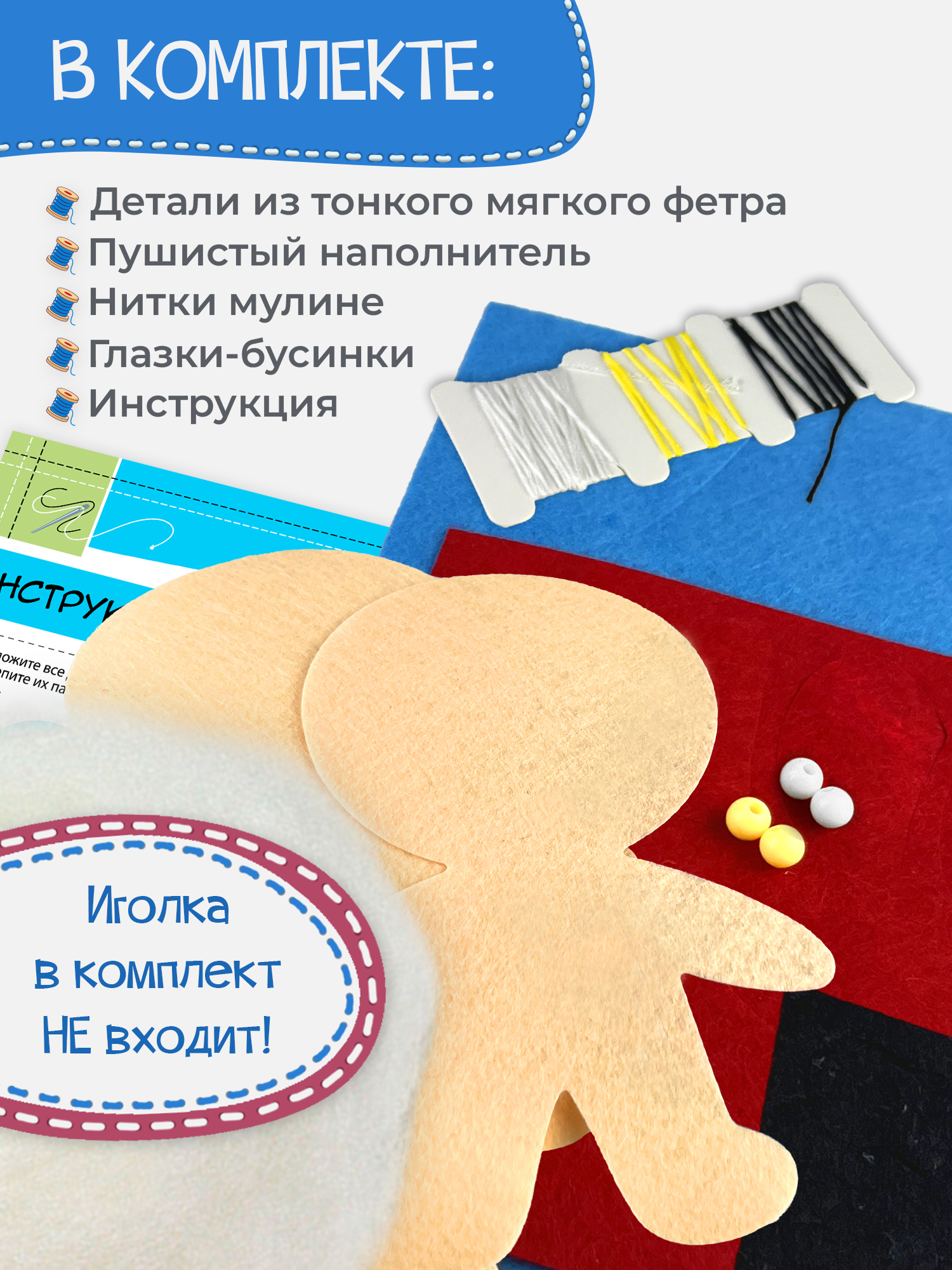 В комплекте: детали из фетра, бусинки, нитки для шитья. Наполнитель, инструкция.