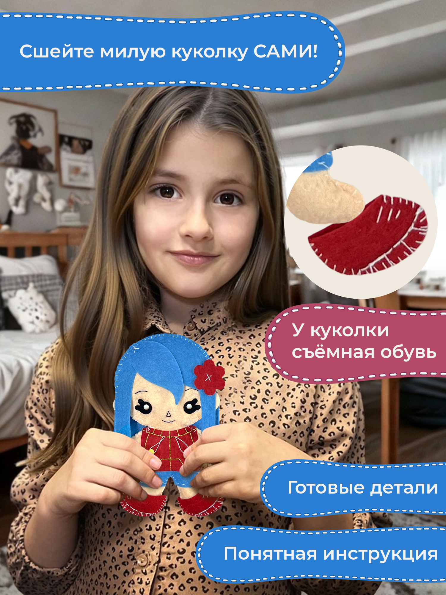 Наборы для поделок Игрушки из фетра – это увлекательный вид творчества! В процессе работы ребёнку предстоит сделать свои первые стежки и сшить весёлую куколку.