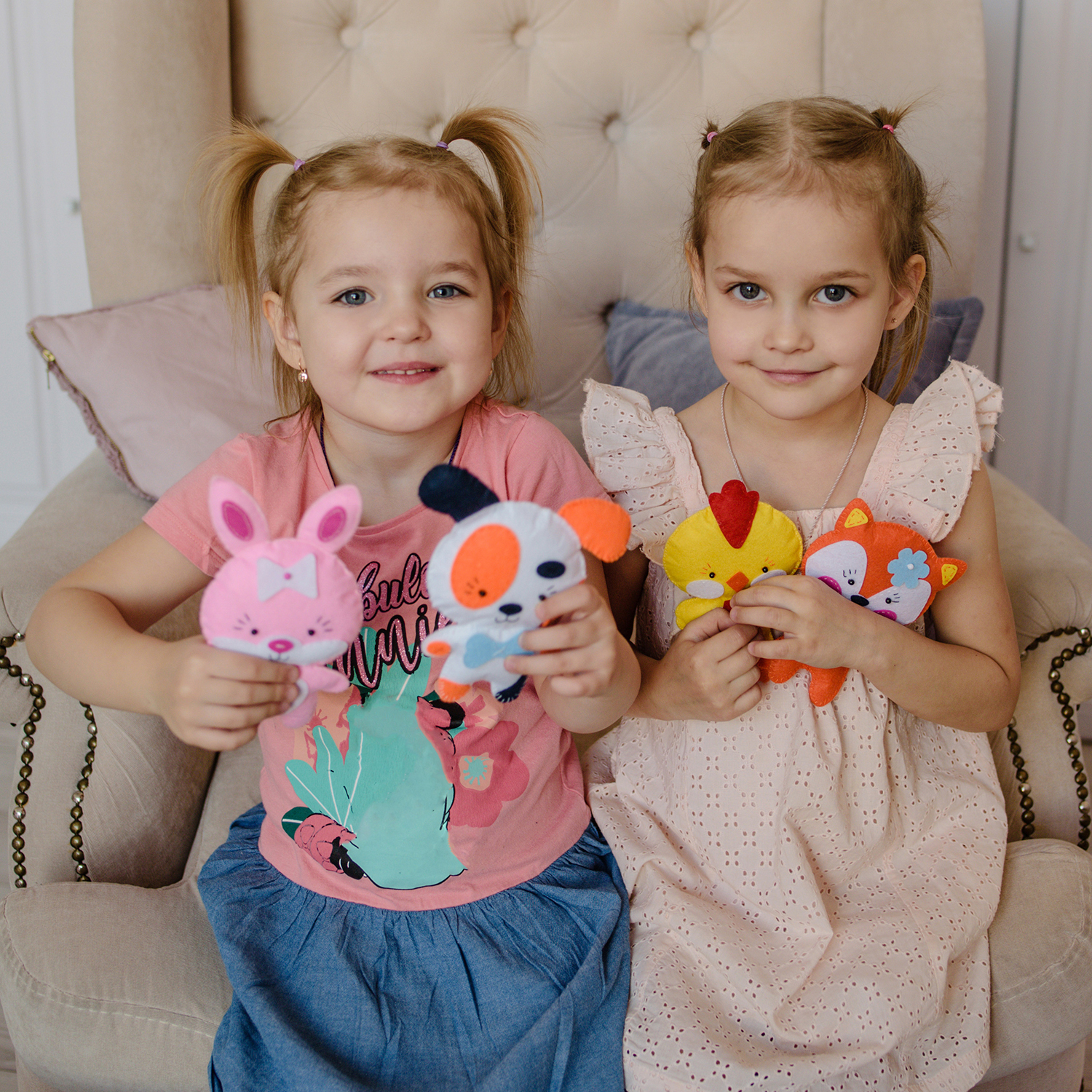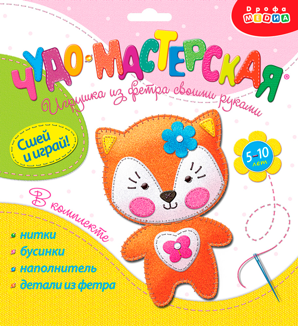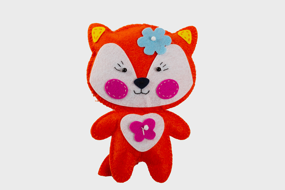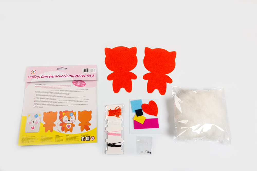 В наборе есть всё для создания доброго и милого животного — детали из тонкого мягкого фетра насыщенных цветов, пушистый наполнитель, нитки и декоративные бусинки.