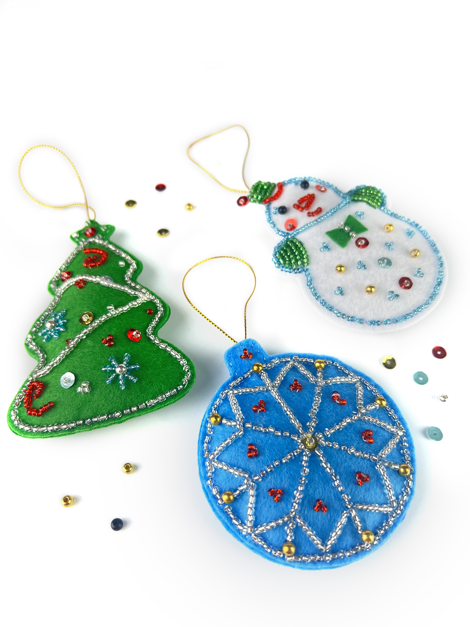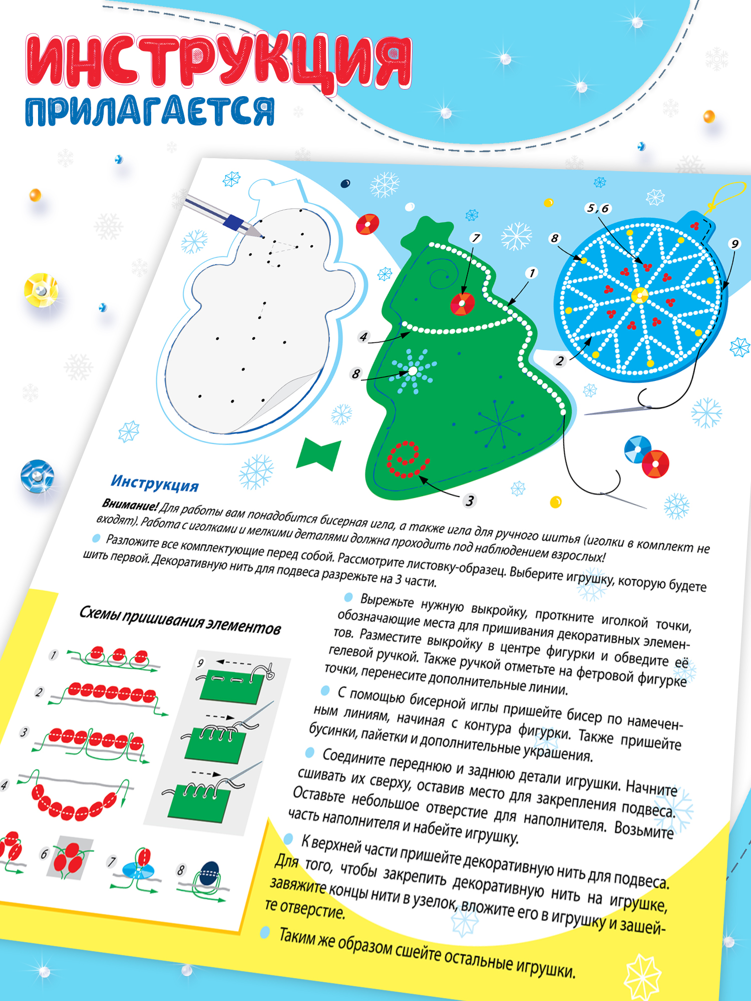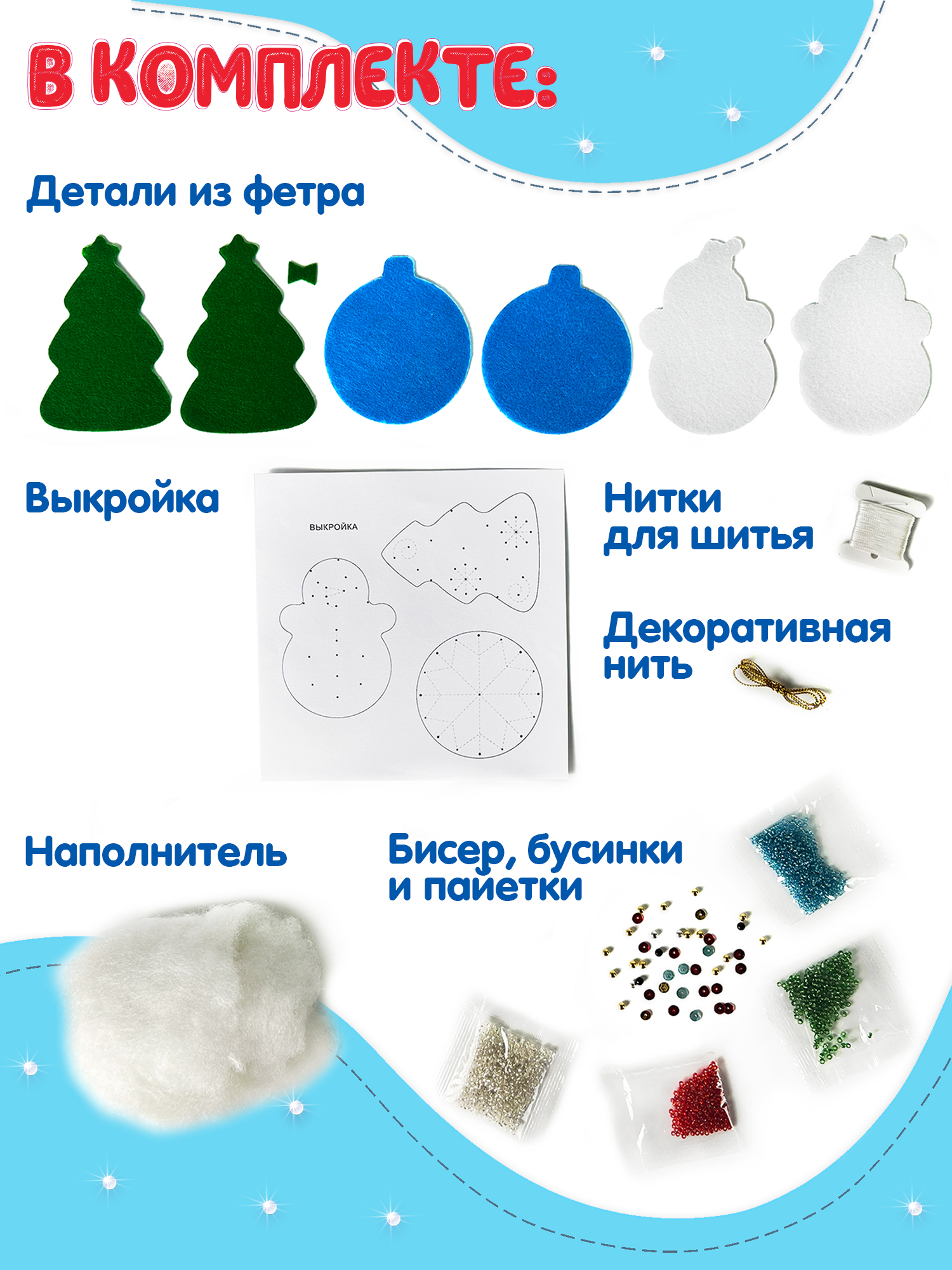 В наборе есть всё для создания трёх новогодних игрушек (шарика, снеговика и ёлочки) — тонкий мягкий фетр насыщенных цветов, выкройка, пушистый наполнитель, нитки, декоративная нить для подвеса, бисер, пайетки и бусинки. Иголки в комплект не входят.