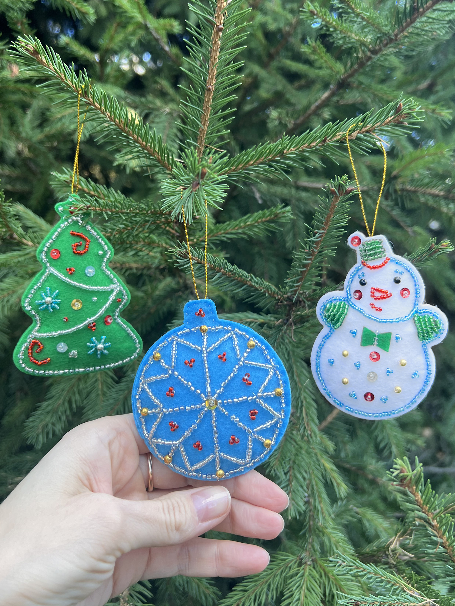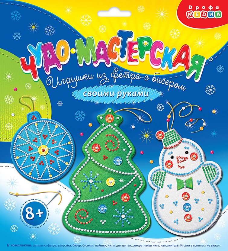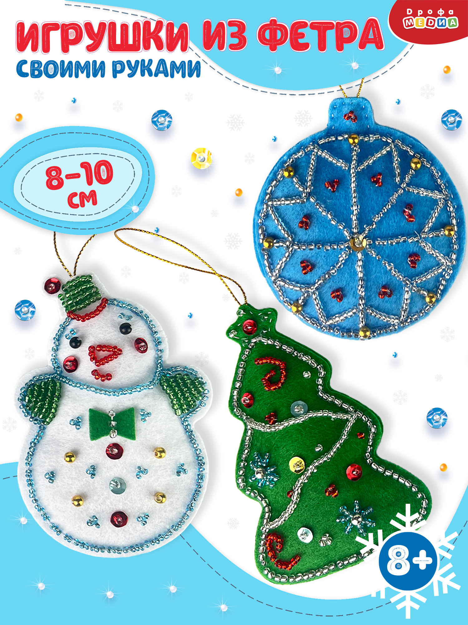 В наборе есть всё для создания трёх новогодних игрушек (шарика, снеговика и ёлочки) — тонкий мягкий фетр насыщенных цветов, выкройка, пушистый наполнитель, нитки, декоративная нить для подвеса, бисер, пайетки и бусинки. Иголки в комплект не входят.