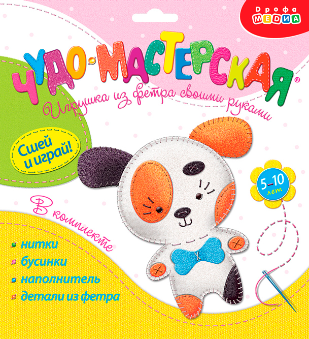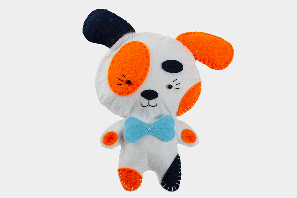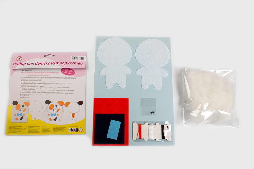 В наборе есть всё для создания доброго и милого животного — детали из тонкого мягкого фетра насыщенных цветов, пушистый наполнитель, нитки и декоративные бусинки.