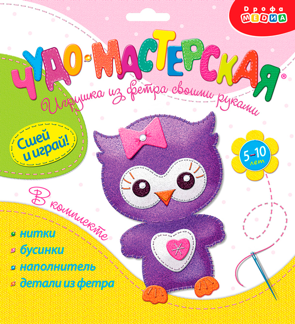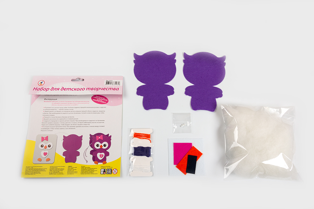 В наборе есть всё для создания доброго и милого животного — детали из тонкого мягкого фетра насыщенных цветов, пушистый наполнитель, нитки и декоративные бусинки.