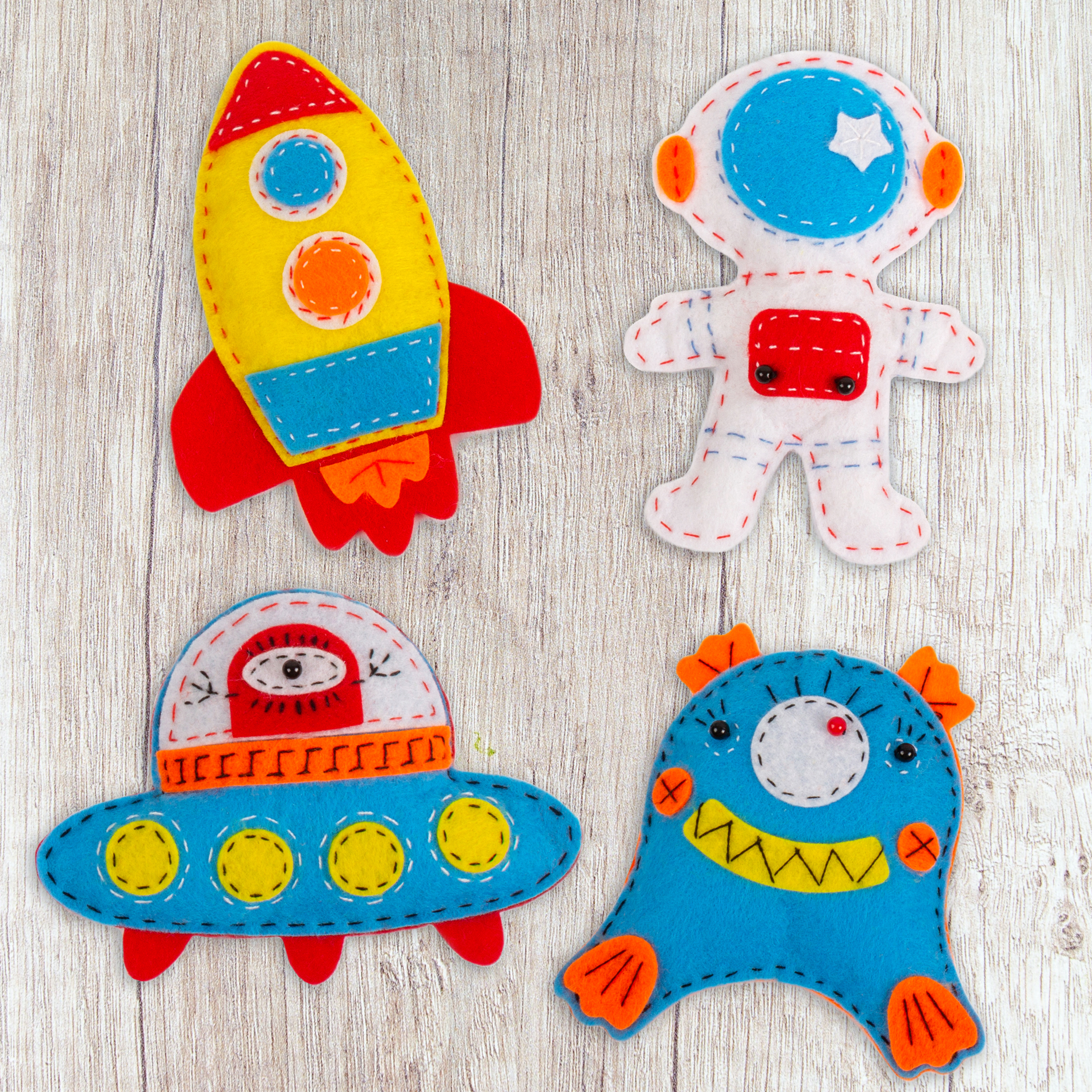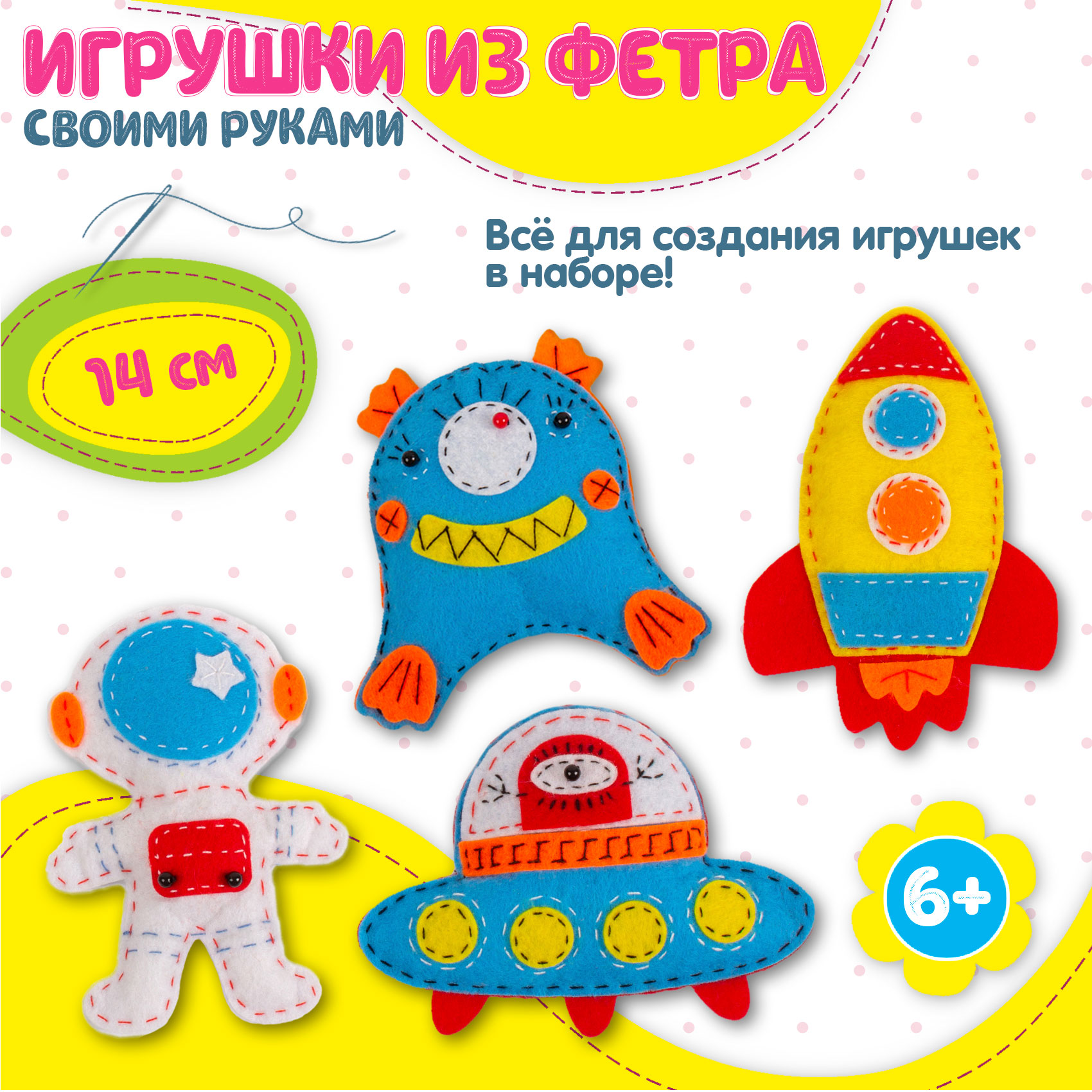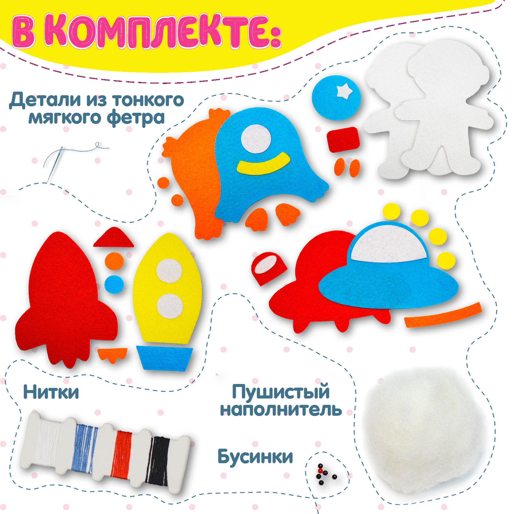 Мы создали наши наборы для детей, которых увлекает рукоделие и творчество. Внутри вы найдете все для создания четырех мягких игрушек – космонавта, пришельца, ракеты и летающей тарелки. Следуйте инструкции и у вас все получится!