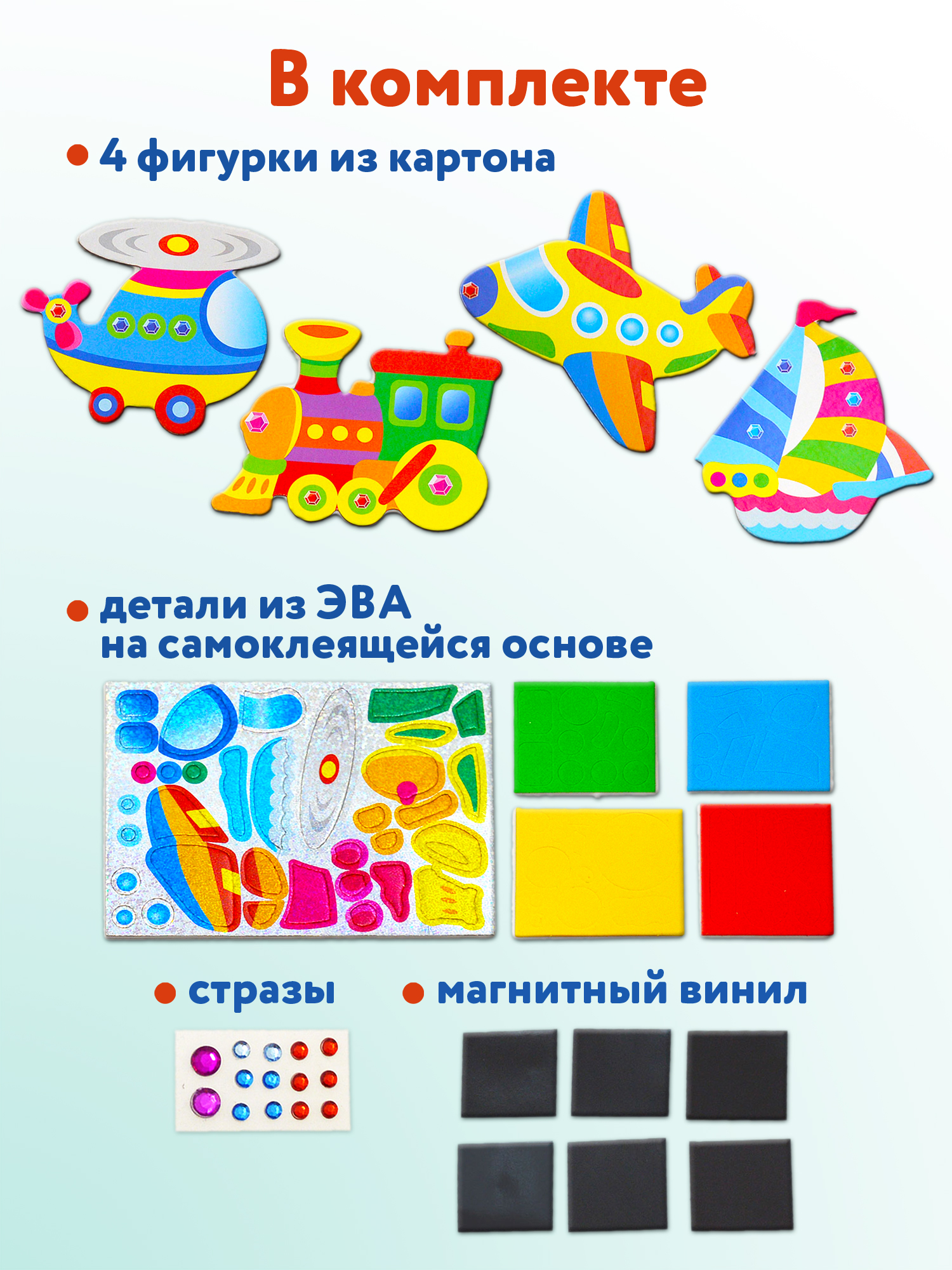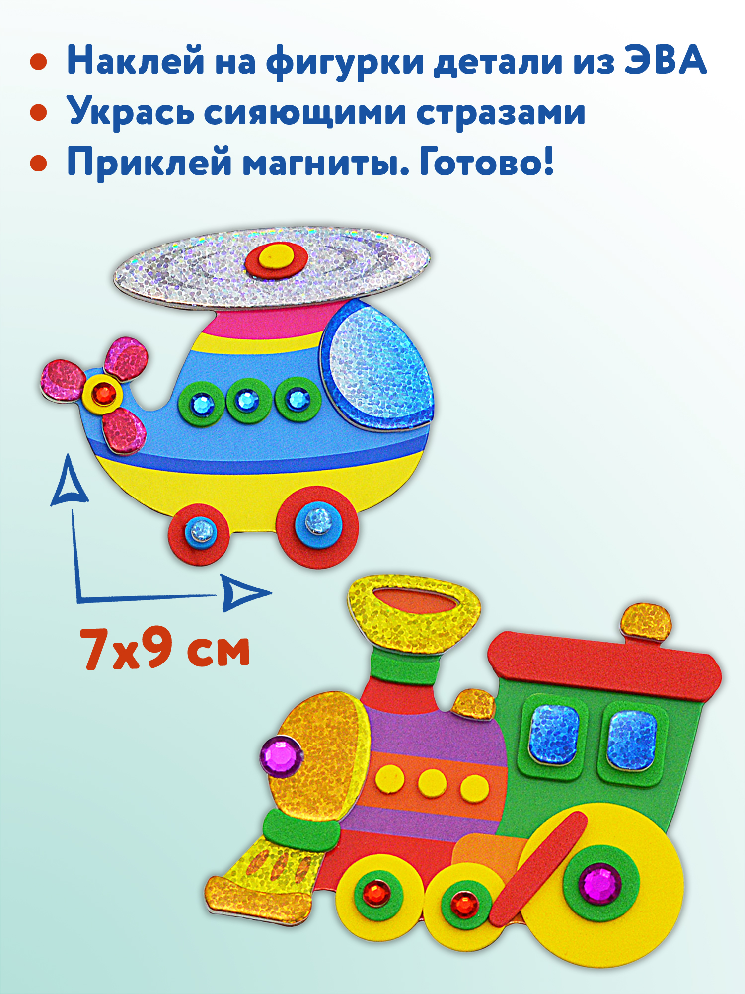 Набор для творчества, с помощью которого ребёнок самостоятельно сделает четыре яркие и необычные поделки на магнитах. Фигурки из картона нужно украсить матовыми и переливающимися деталями из мягкого пластика ЭВА и приклеить блестящие стразы. ЭВА — современный, экологически чистый материал, не вызывает аллергии, безопасен и приятен на ощупь.