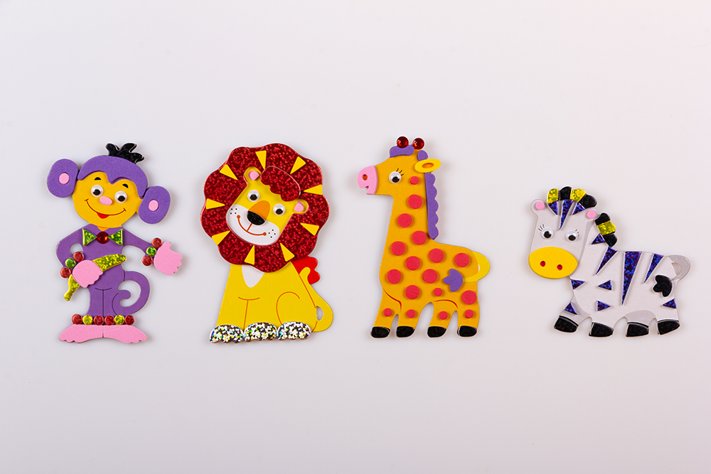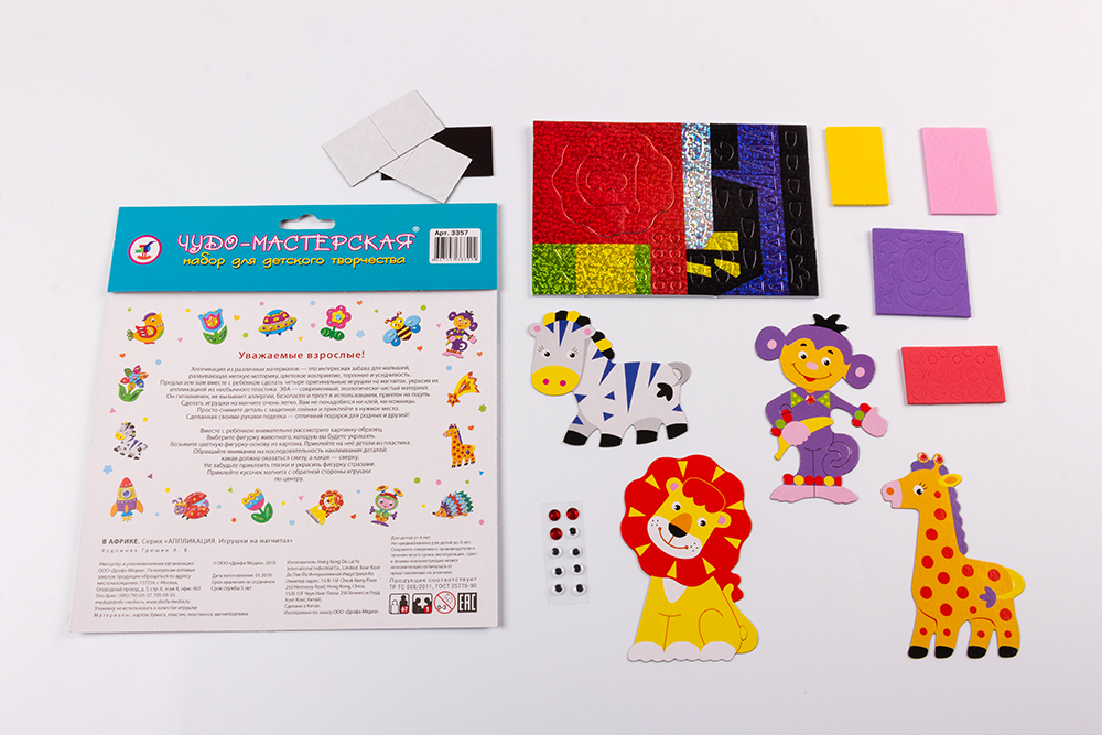 Весёлый наборчик для детского творчества, картонные заготовки в форме зверушек, высотой 10 см, картон заготовок тонкий, легко мнется, детали для украшения из эва на клейкой основе и глазки на клейкой основе, легко приклеиваются, хорошо держатся. Есть магнитные квадратики чтобы готовую поделку можно было прикрепить на холодильник.