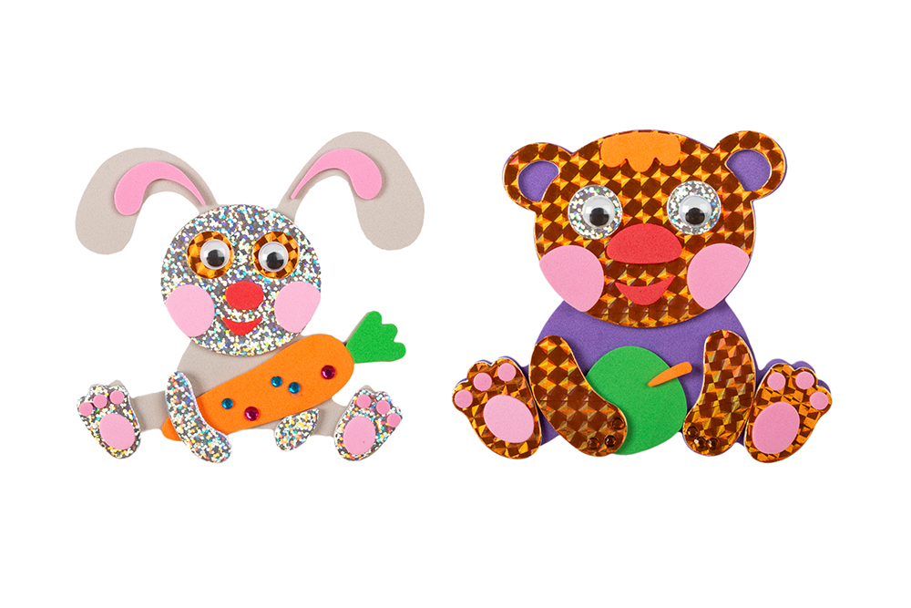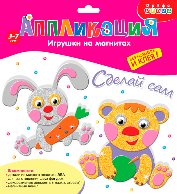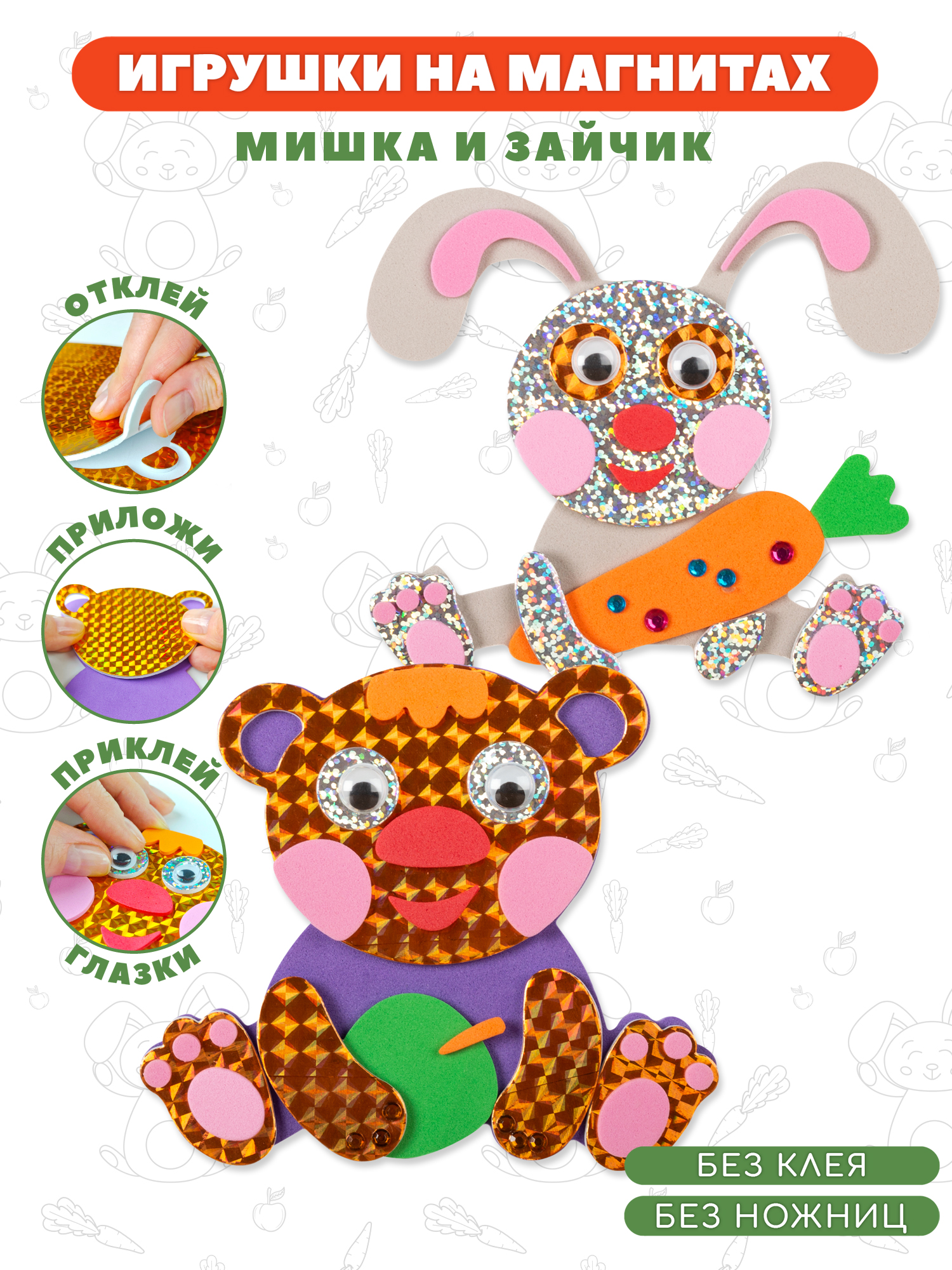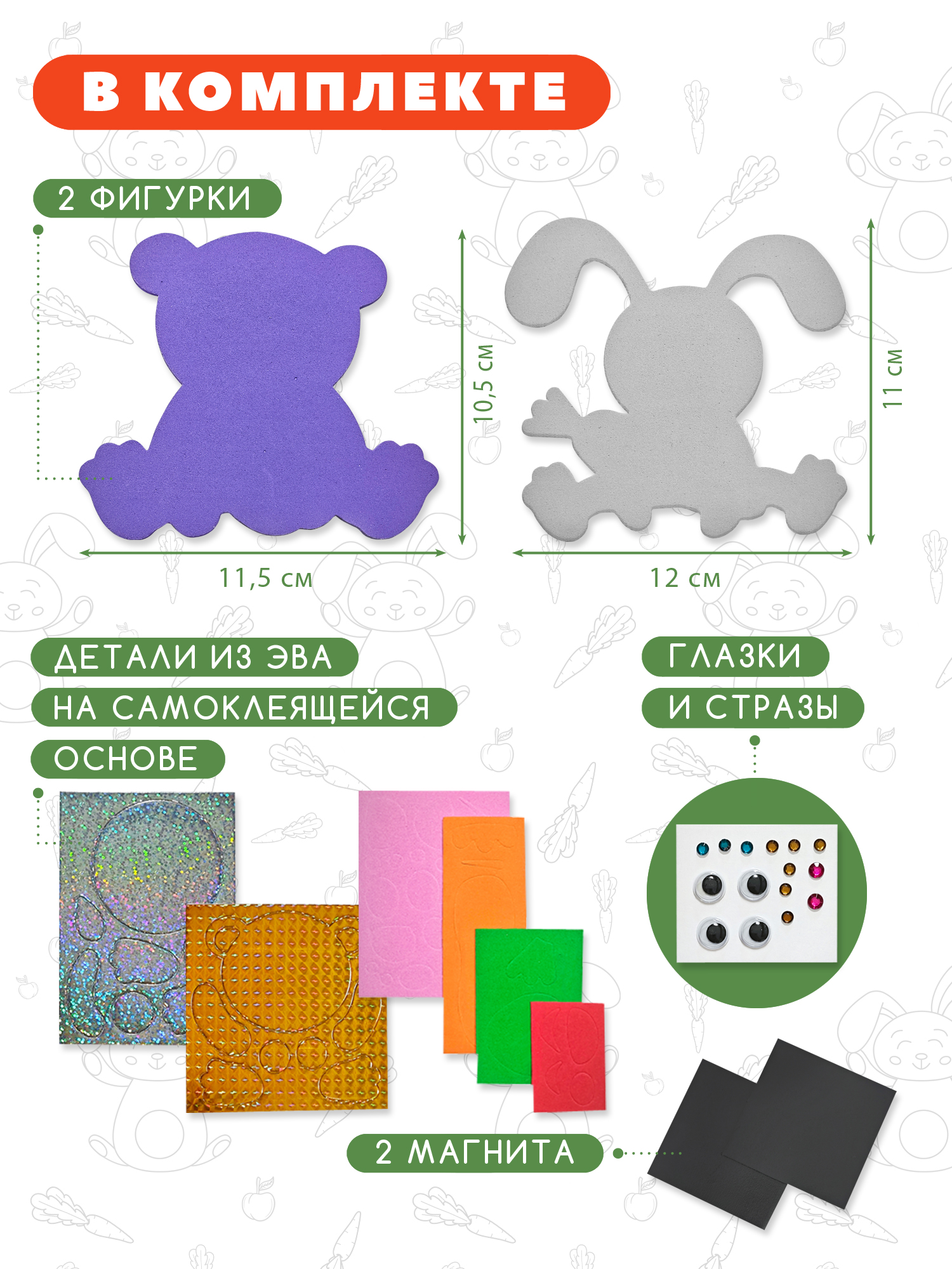 Творческий набор для создания необычных игрушек. Форма поделок уже готова, нужно лишь наклеить объёмные детали и украсить стразами. С помощью магнитного винила их легко повесить на холодильник. В комплекте 2 яркие оригинальные игрушки.