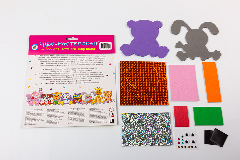 Отличный набор для совместного творчества (для малышей) и для самостоятельной работы (для деток постарше). Детали мягкие, приклеиваются и держатся хорошо, магнит хотя и маленький и тонкий, на холодильнике готовые поделки держатся хорошо.
