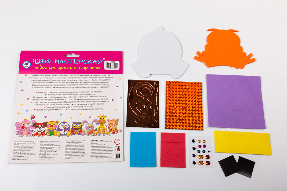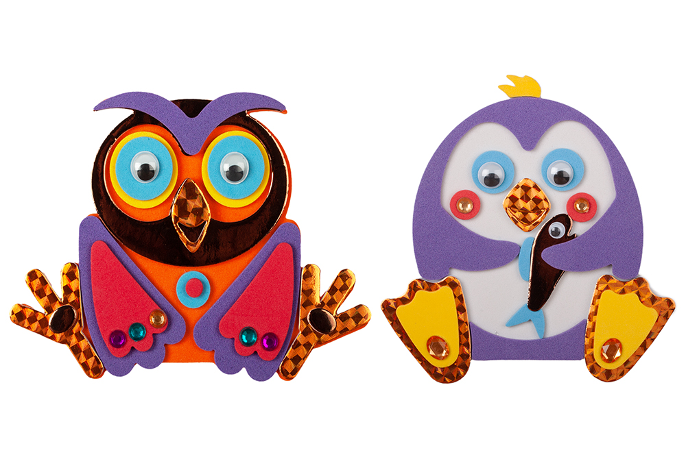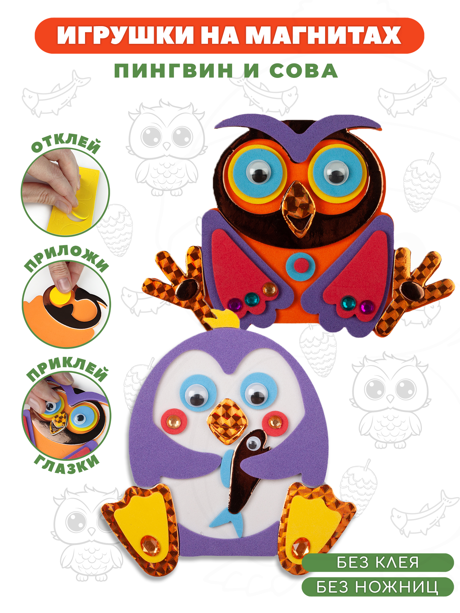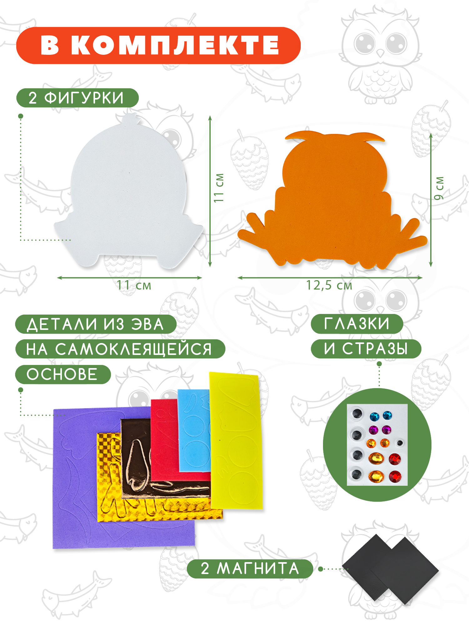 Творческий набор для создания необычных игрушек. Форма поделок уже готова, нужно лишь наклеить объёмные детали и украсить стразами. С помощью магнитного винила их легко повесить на холодильник. В комплекте 2 яркие оригинальные игрушки.