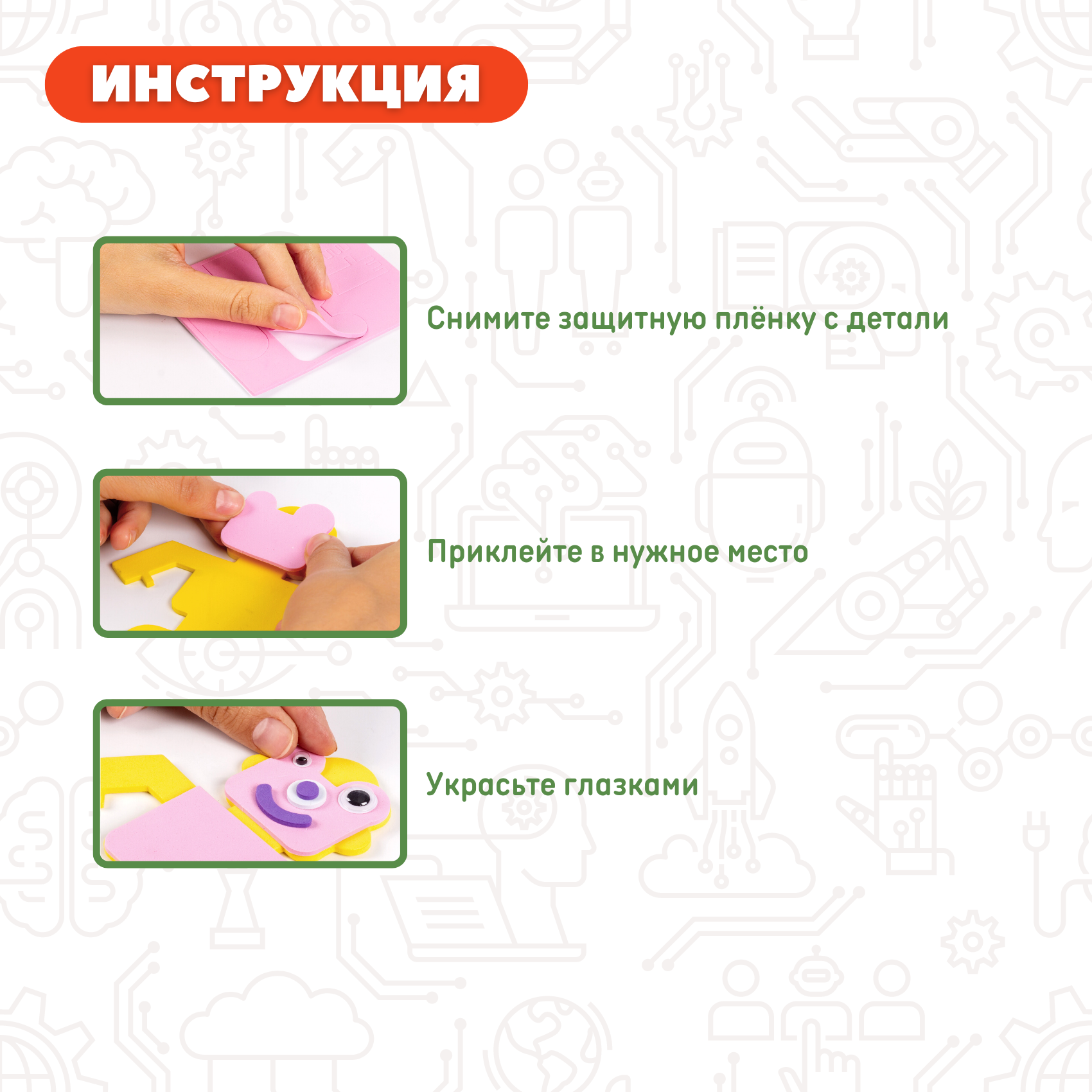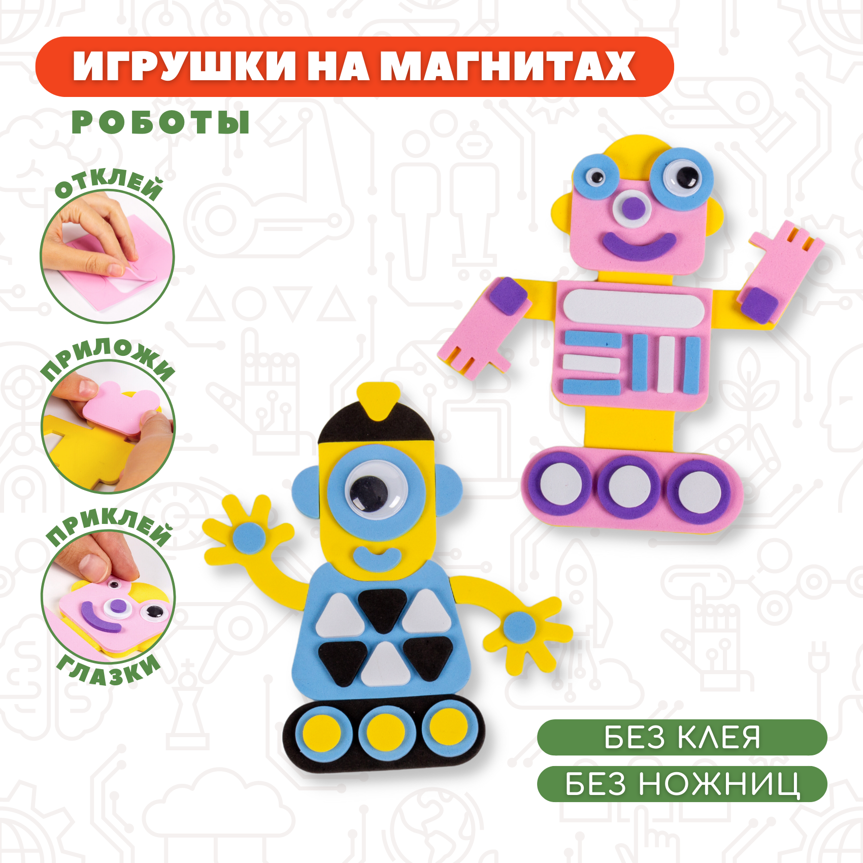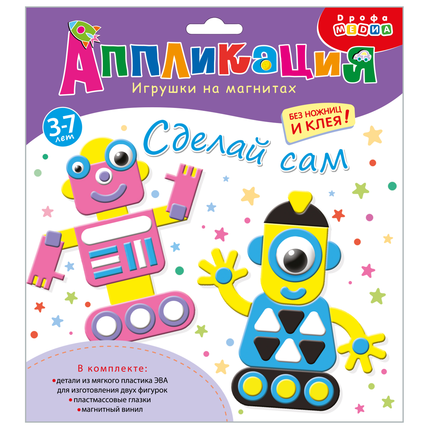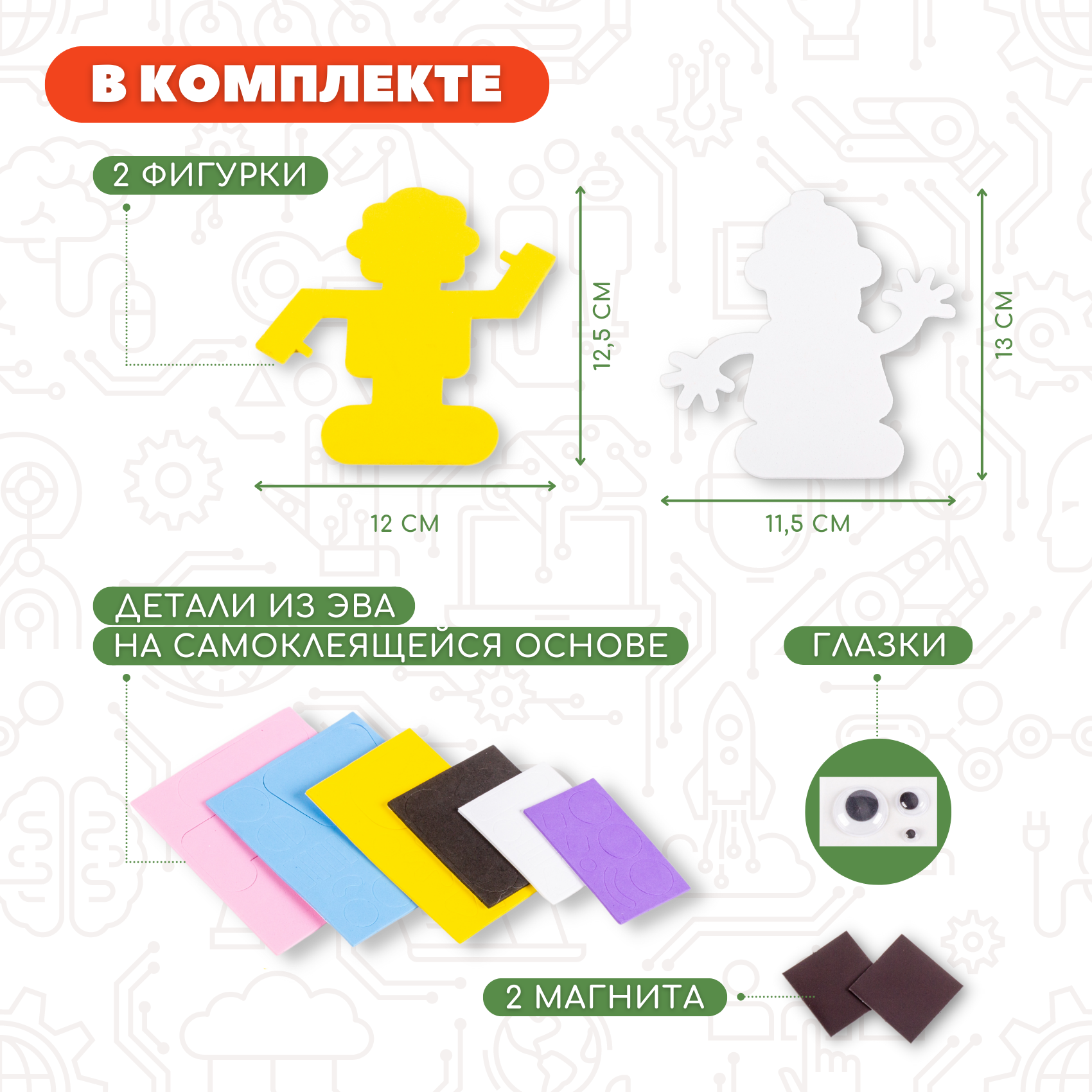 В наборе: детали из мягкого пластика ЭВА для изготовления двух фигурок, магнитный винил, пластмассовые глазки.