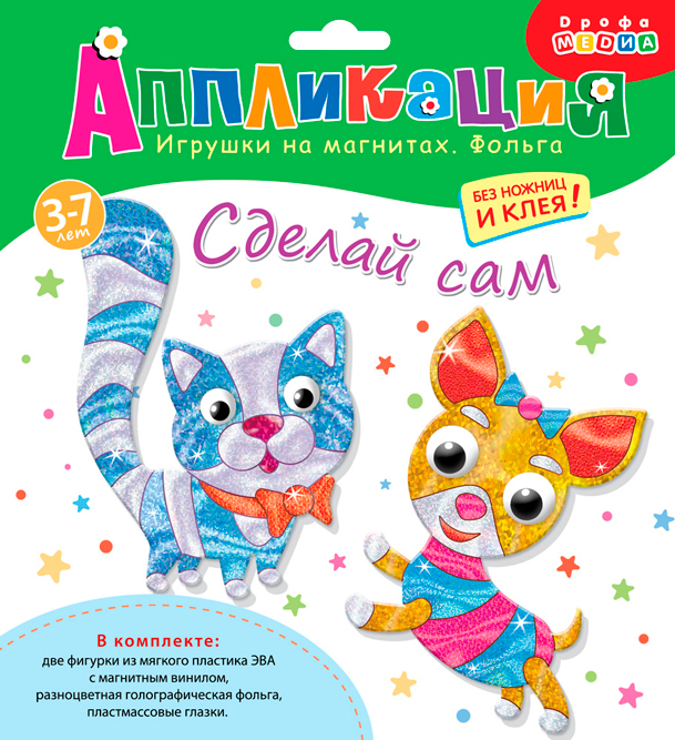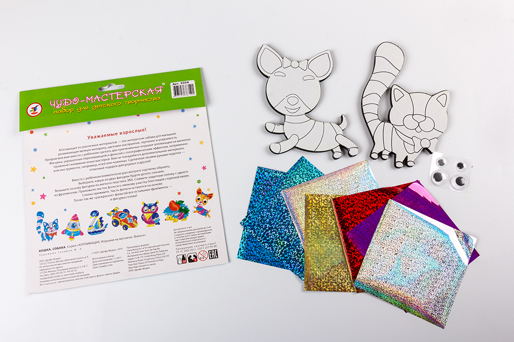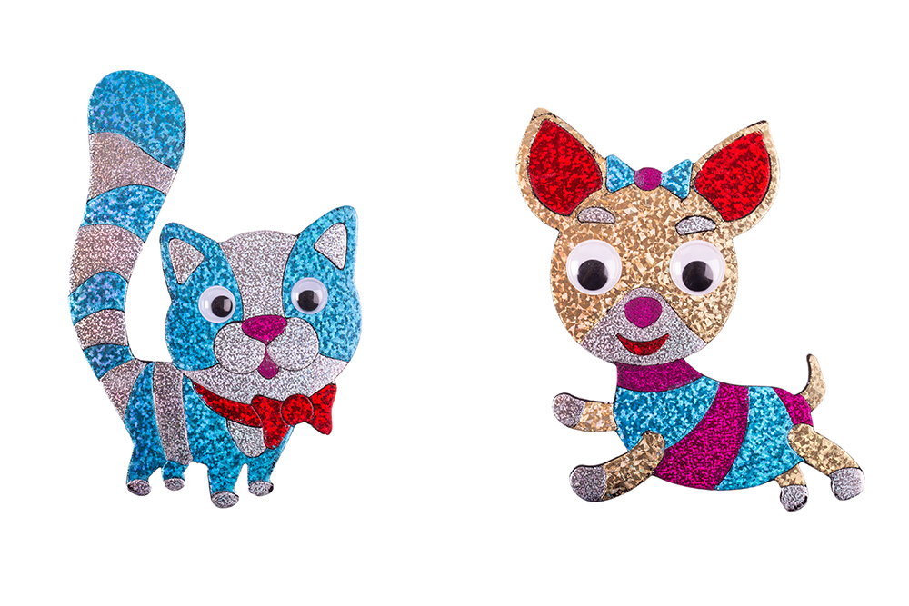Оригинальная поделка — весёлая игрушка из ЭВА с магнитным винилом, раскрашенная с помощью фольги. Благодаря голографическому эффекту фольги, готовое изделие отличается необыкновенной яркостью и насыщенностью. В наборе 2 поделки.