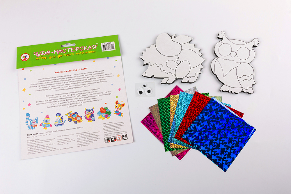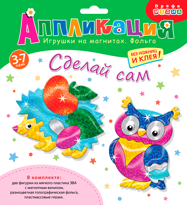 с 2 х лет мы с детьми очень любим эту серию аппликация на магнитах сделай сам. весь холодильник увешан поделками из этой серии. в данном издании 2 поделки сова и ежик. система работы очень простая, дети снимают с липкой основы элементы и накладывают на них листочки фольги в соответствии с образцом. единственная проблемка есть листы фольги с некоторыми цветами ( например темно синий) которые плохо копируются на основу и сложно отдираются, нужна помощь взрослого