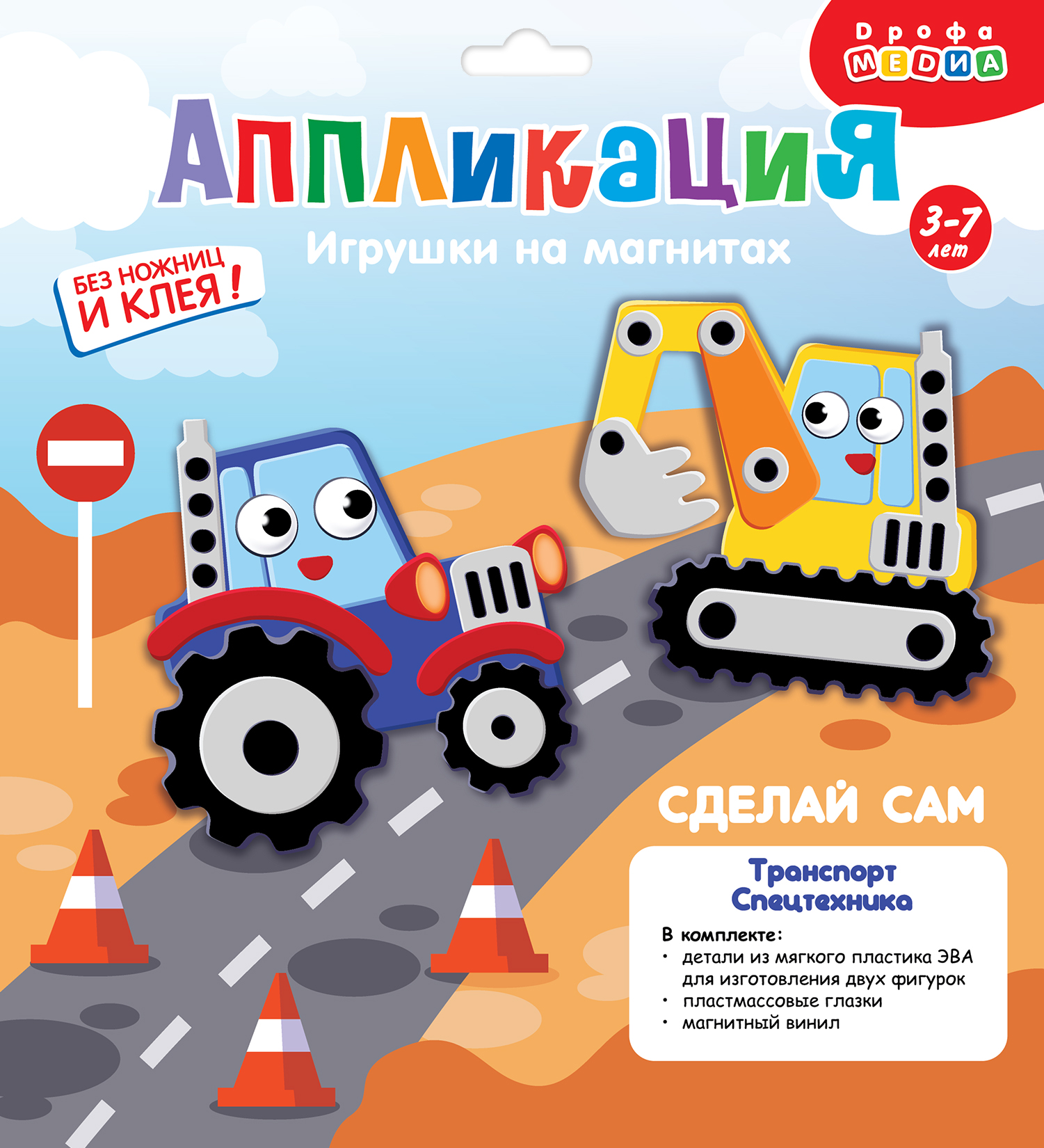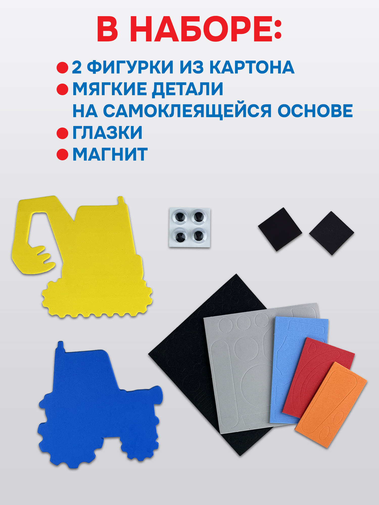В наборе: 2 фигурки из картона, детали из цветного мягкого пластика ЭВА на самоклеящейся основе, пластмассовые глазки, магнитный винил.