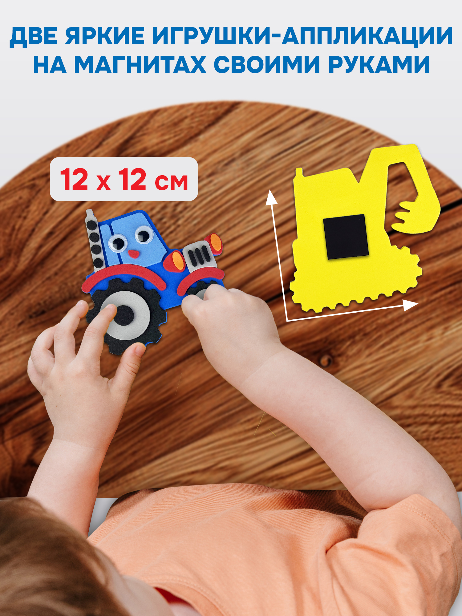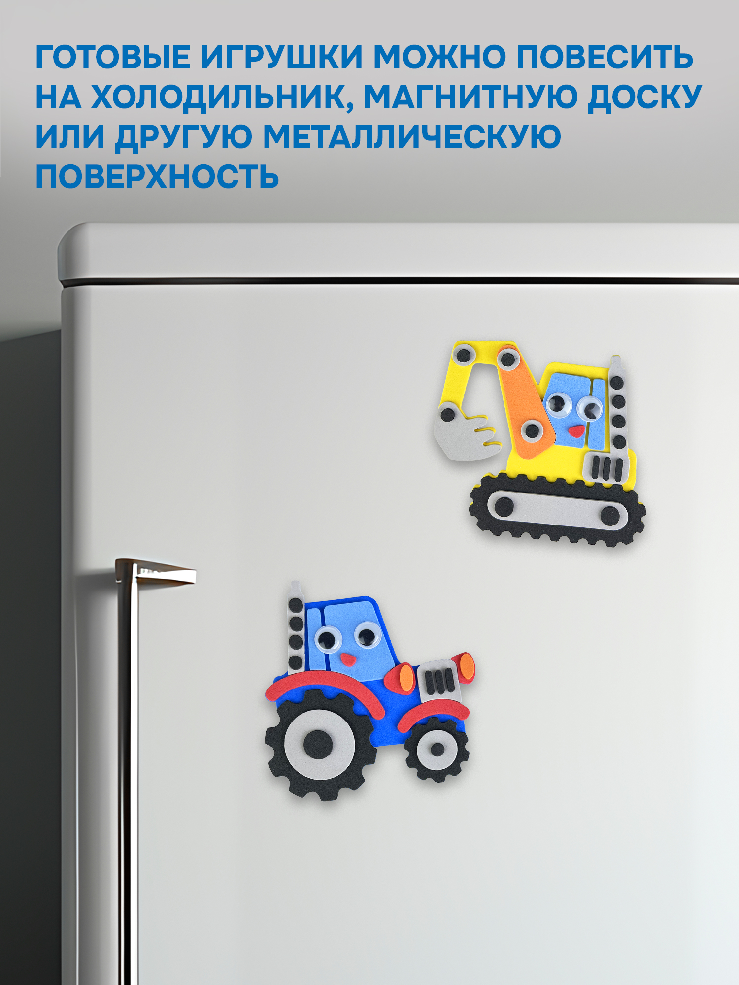 Набор для творчества «Транспорт. Спецмашины» понравится любому мальчику! Ребёнку предлагается своими руками сделать две яркие игрушки-аппликации на магнитах: трактор и экскаватор.