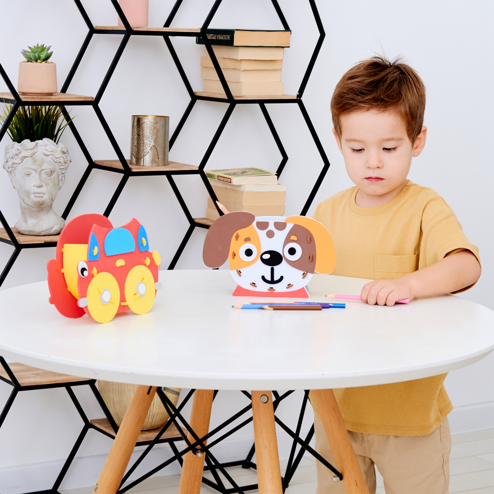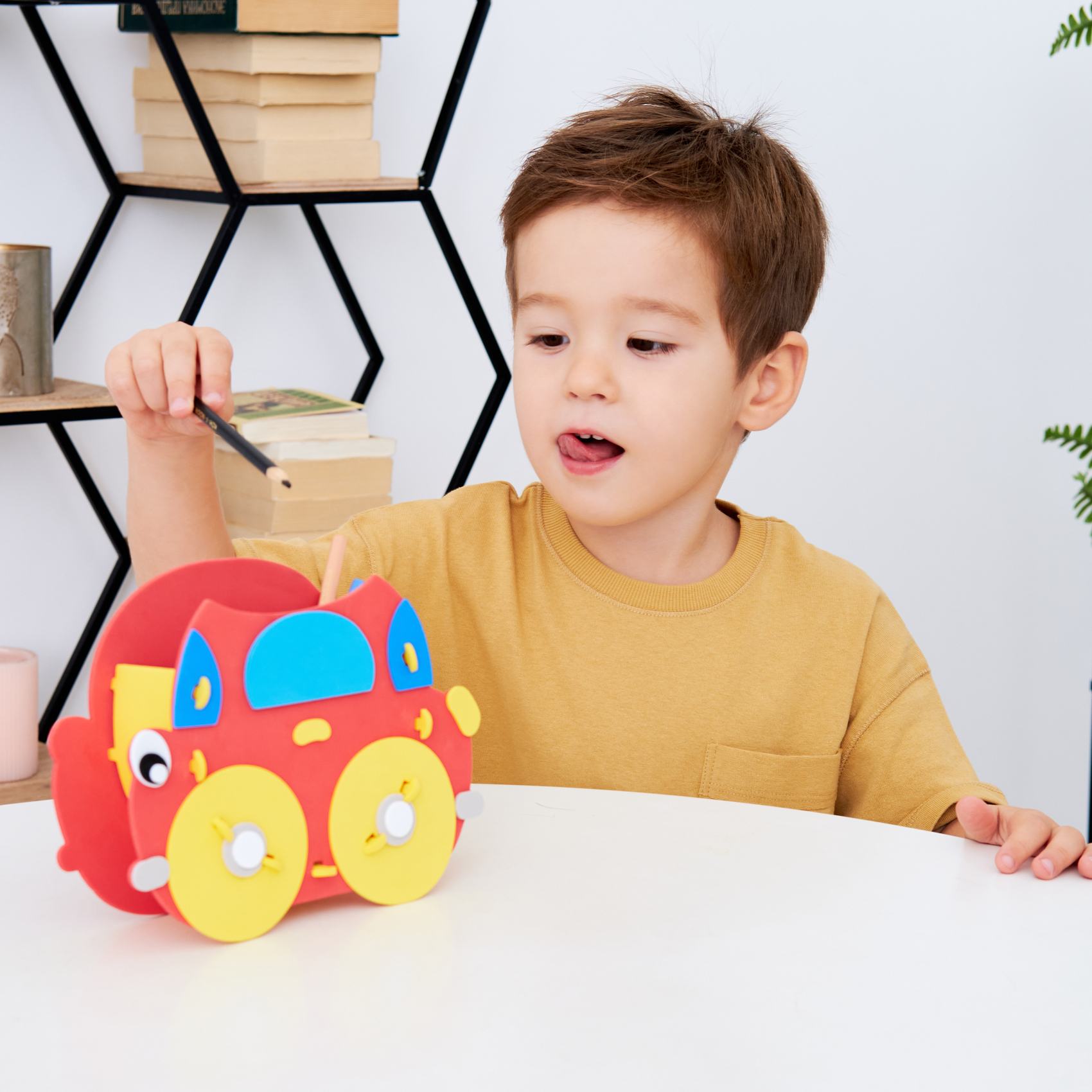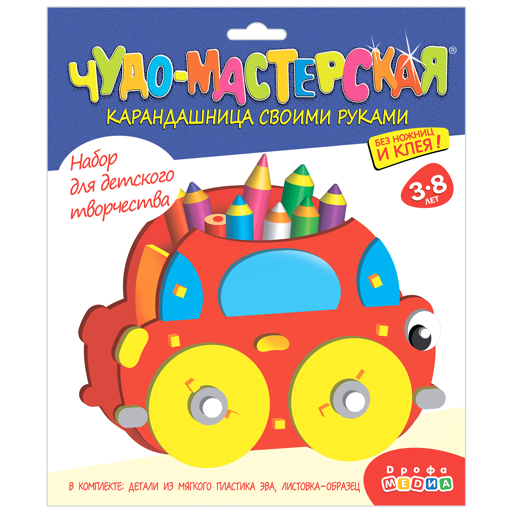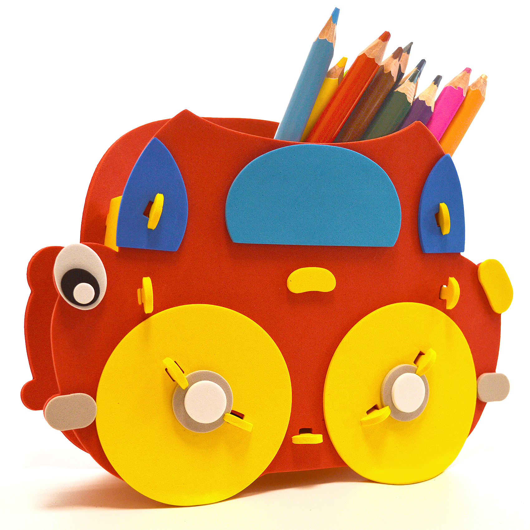 Карандашницу собирают из мягкого, приятного на ощупь пластика без ножниц и клея. Детали легко соединяются между собой и крепко держатся в пазах. Машинка на передней стенке карандашницы порадует ребёнка.