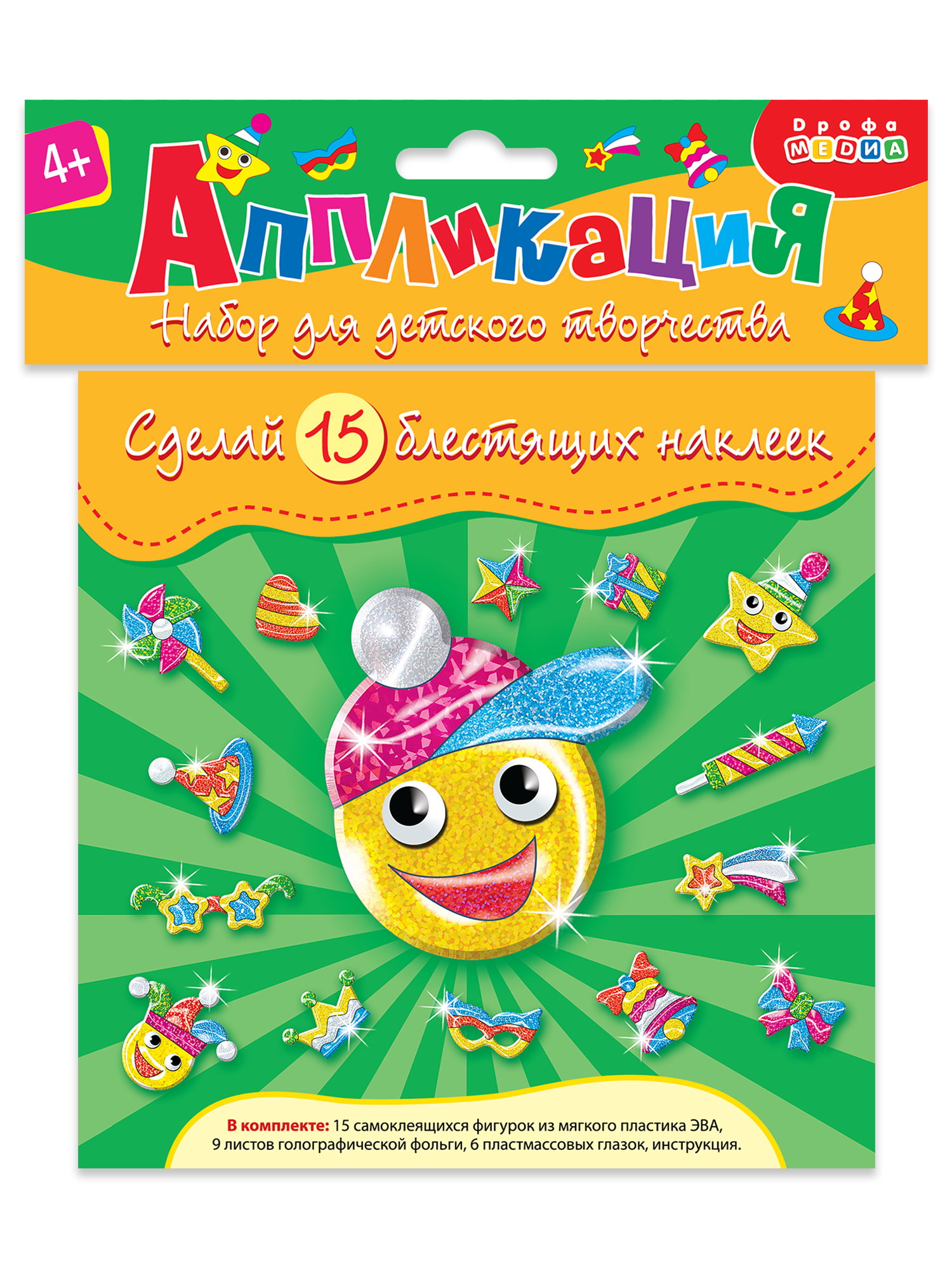 В комплекте: 15 мягких объёмных фигурок на самоклеящейся основе, 9 листов голографической фольги, пластмассовые глазки, инструкция.