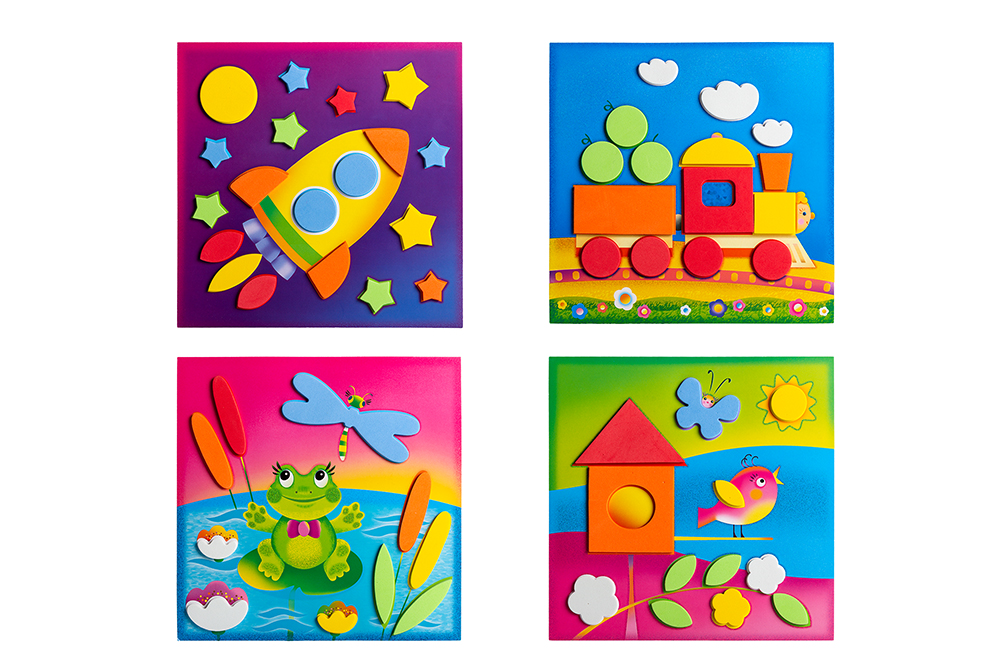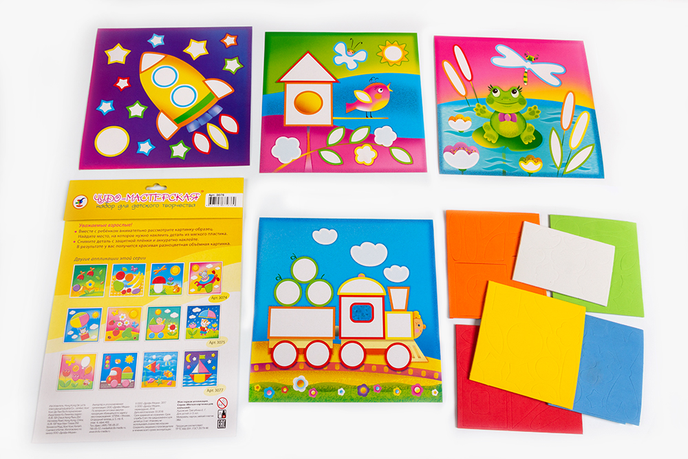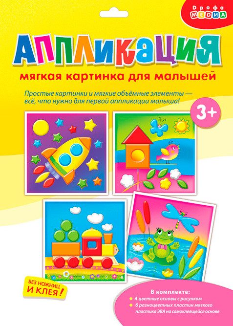 Яркая и выразительная аппликация с простыми и весёлыми картинками. Для работы не нужны ни клей, ни ножницы. В комплекте — мягкие детали, вырубленные из объёмного ЭВА на клеевой основе, которые легко приклеиваются на картинку-основу. Сама картинка небольшого размера, что поможет малышу легко справиться с работой. В результате получится прекрасная композиция — первая аппликация малыша! В наборе четыре яркие картинки.