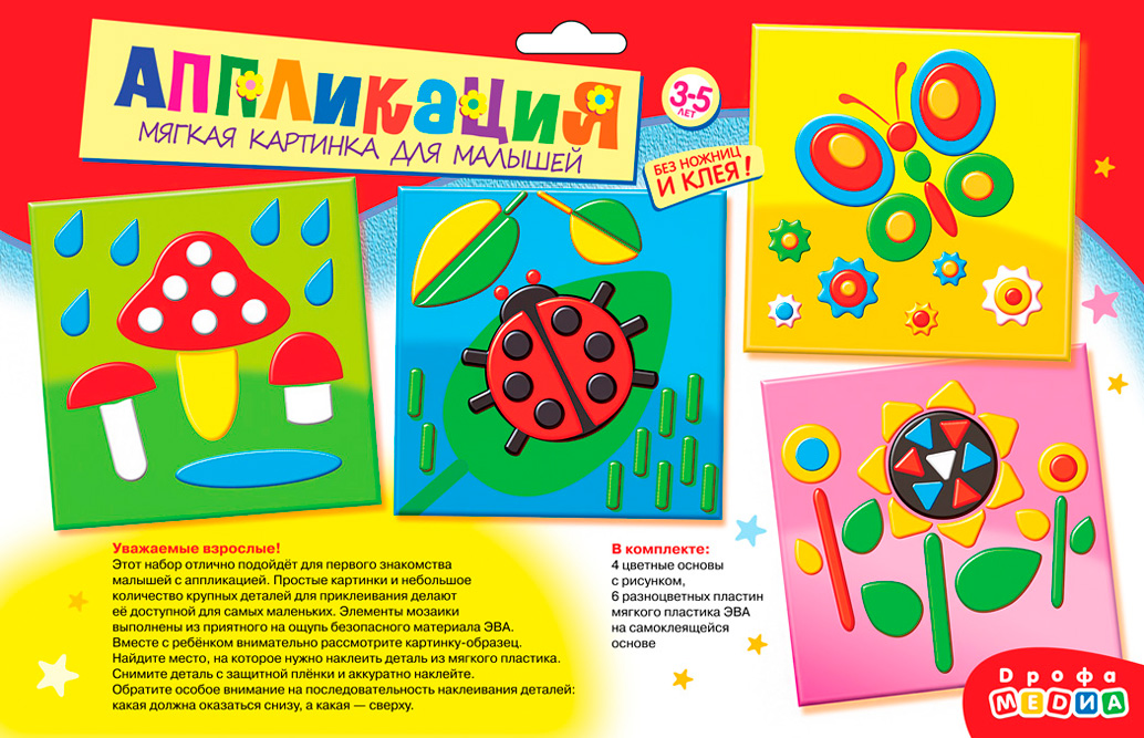 Простые картинки и небольшое количество крупных деталей делают эту аппликацию понятной и доступной для малышей от 3 лет. Детали набора насыщенные и мягкие на ощупь, легко приклеиваются на картинку-основу. Несмотря на простоту исполнения, готовое изделие отличается красочностью, рельефностью и выразительностью. В наборе 4 аппликации.