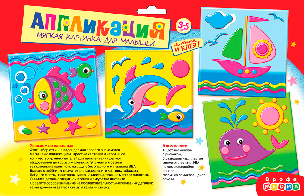 Простые картинки и небольшое количество крупных деталей делают эту аппликацию понятной и доступной для малышей от 3 лет. Детали набора насыщенные и мягкие на ощупь, легко приклеиваются на картинку-основу. Несмотря на простоту исполнения, готовое изделие отличается красочностью, рельефностью и выразительностью. В наборе 4 аппликации.
