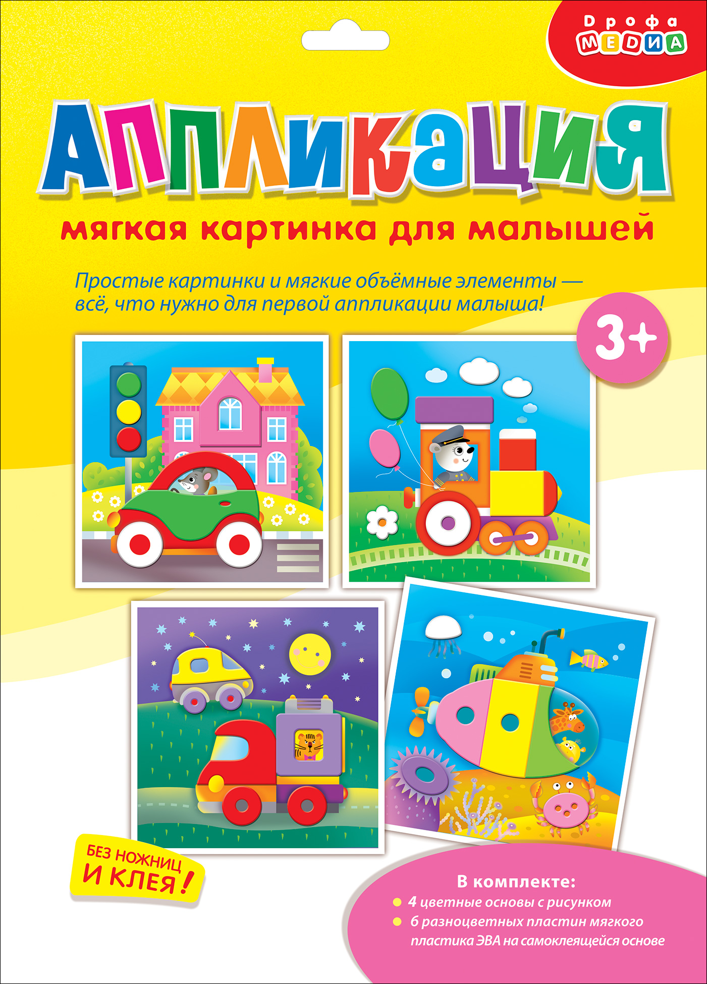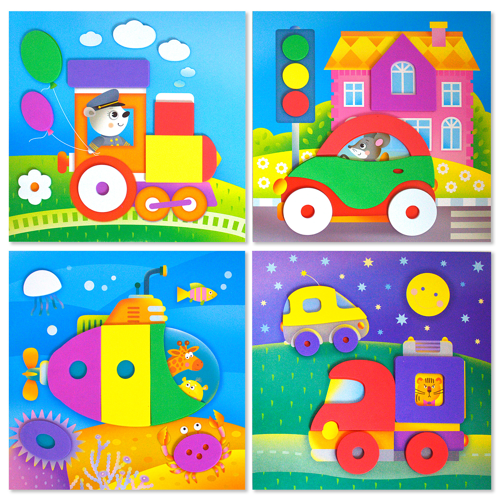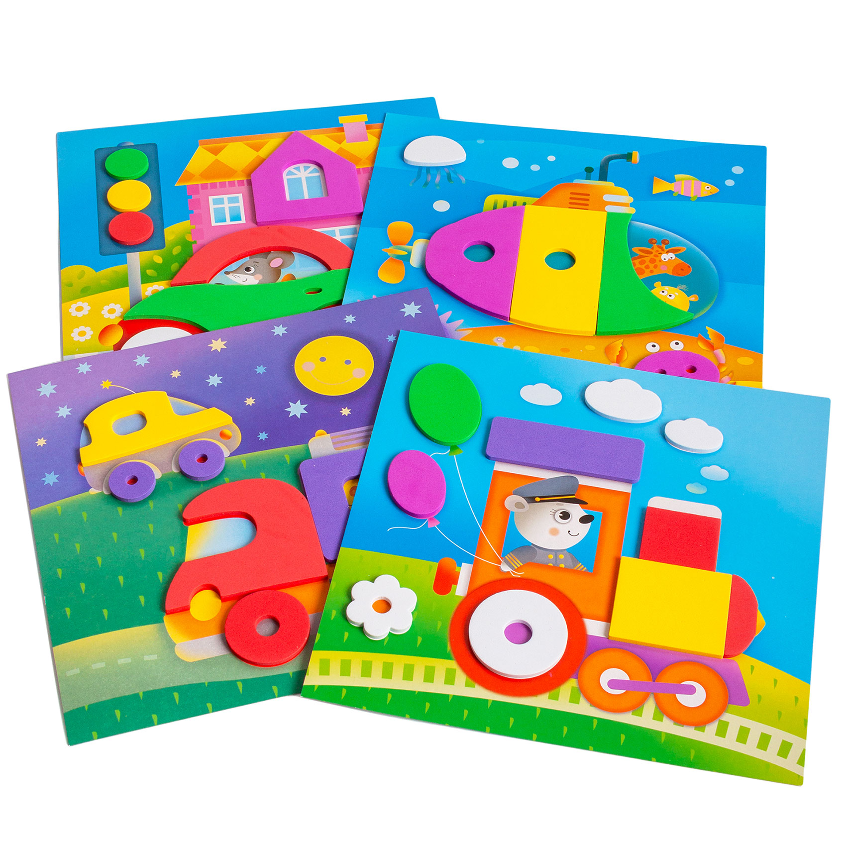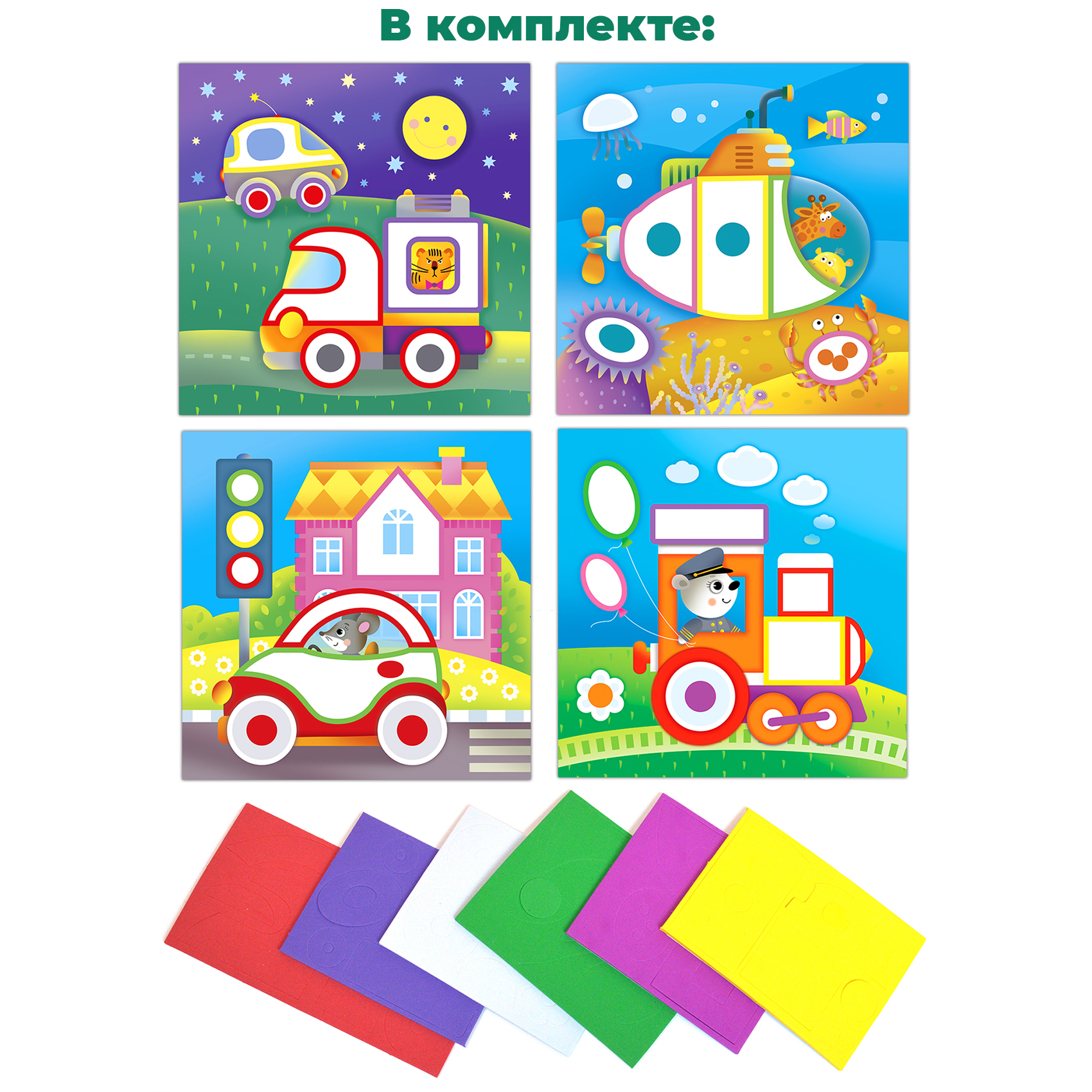 Яркая и выразительная аппликация с простыми и весёлыми картинками. Для работы не нужны ни клей, ни ножницы. В комплекте - мягкие детали, вырубленные из объёмного ЭВА на клеевой основе, которые легко приклеиваются на картинку-основу. Сама картинка небольшого размера, что поможет малышу легко справиться с работой. В результате получится прекрасная композиция - первая аппликация малыша! В наборе четыре яркие картинки, с изображениями машинки, паровозика, грузовичка и подводной лодки. Такой набор обязательно понравится любому мальчику!