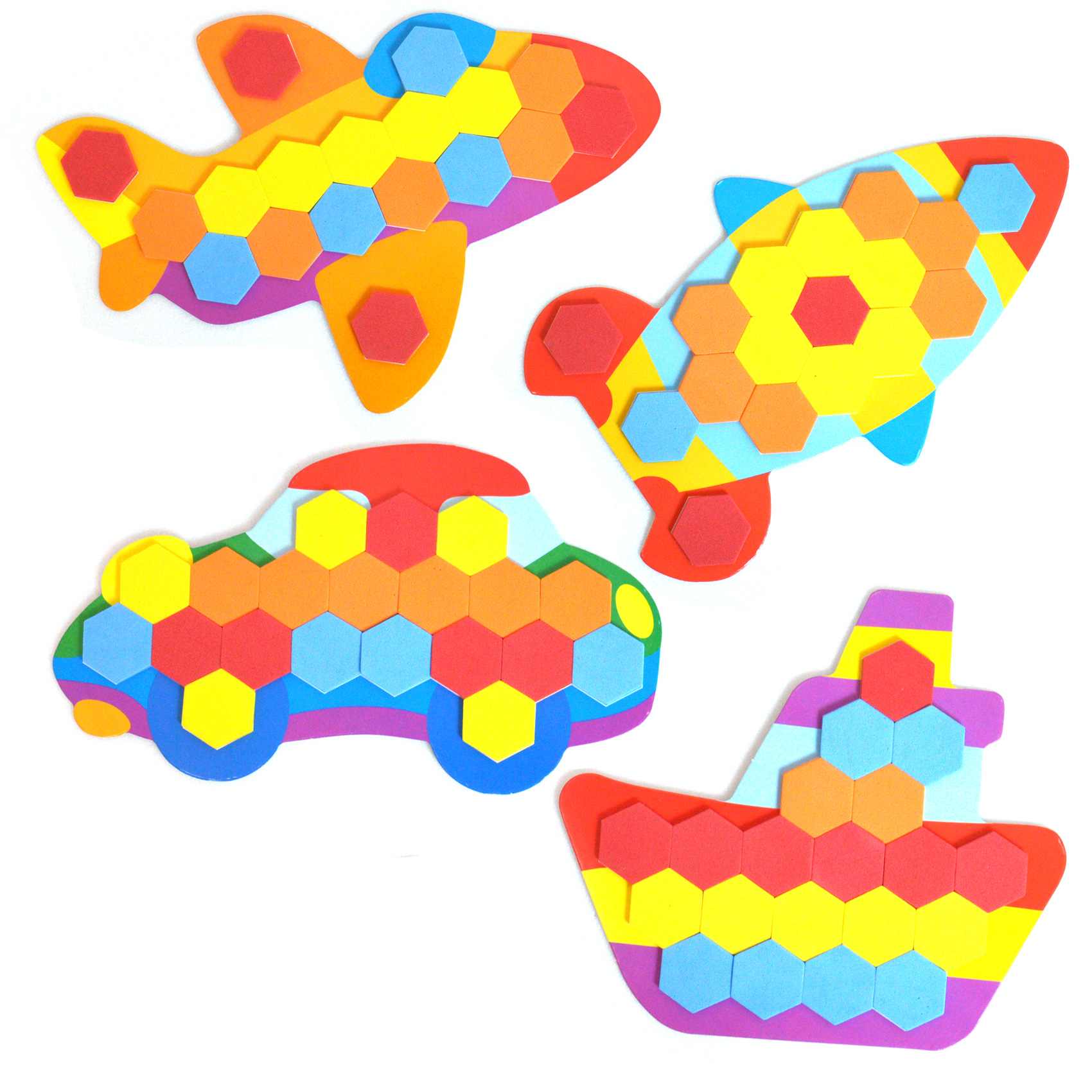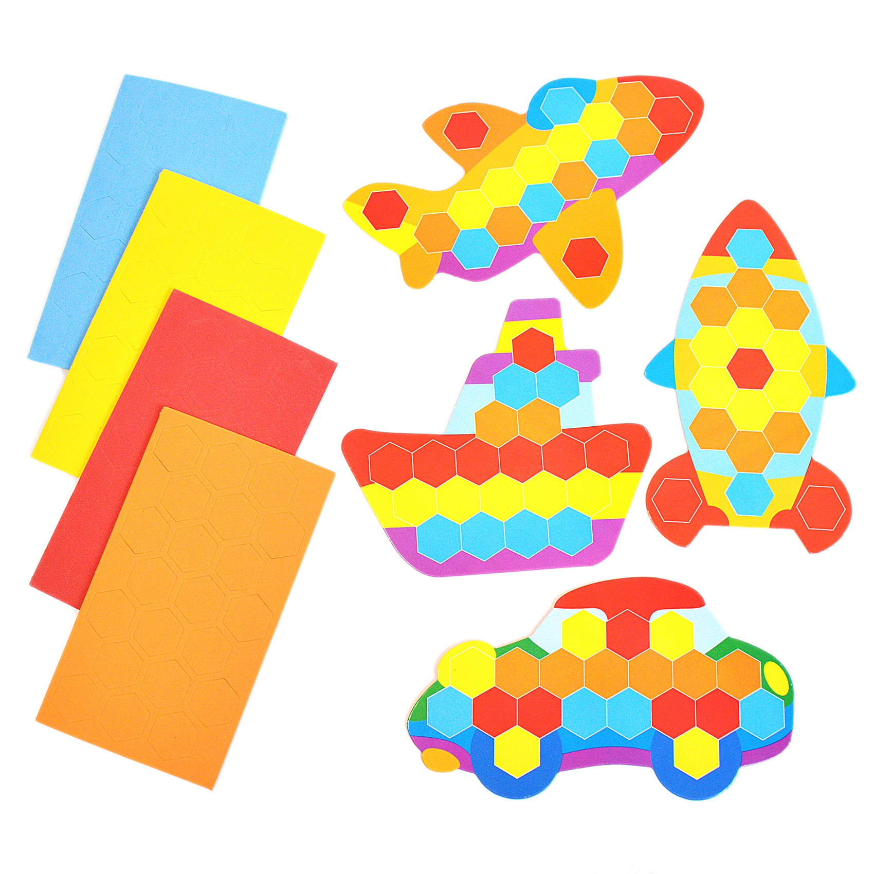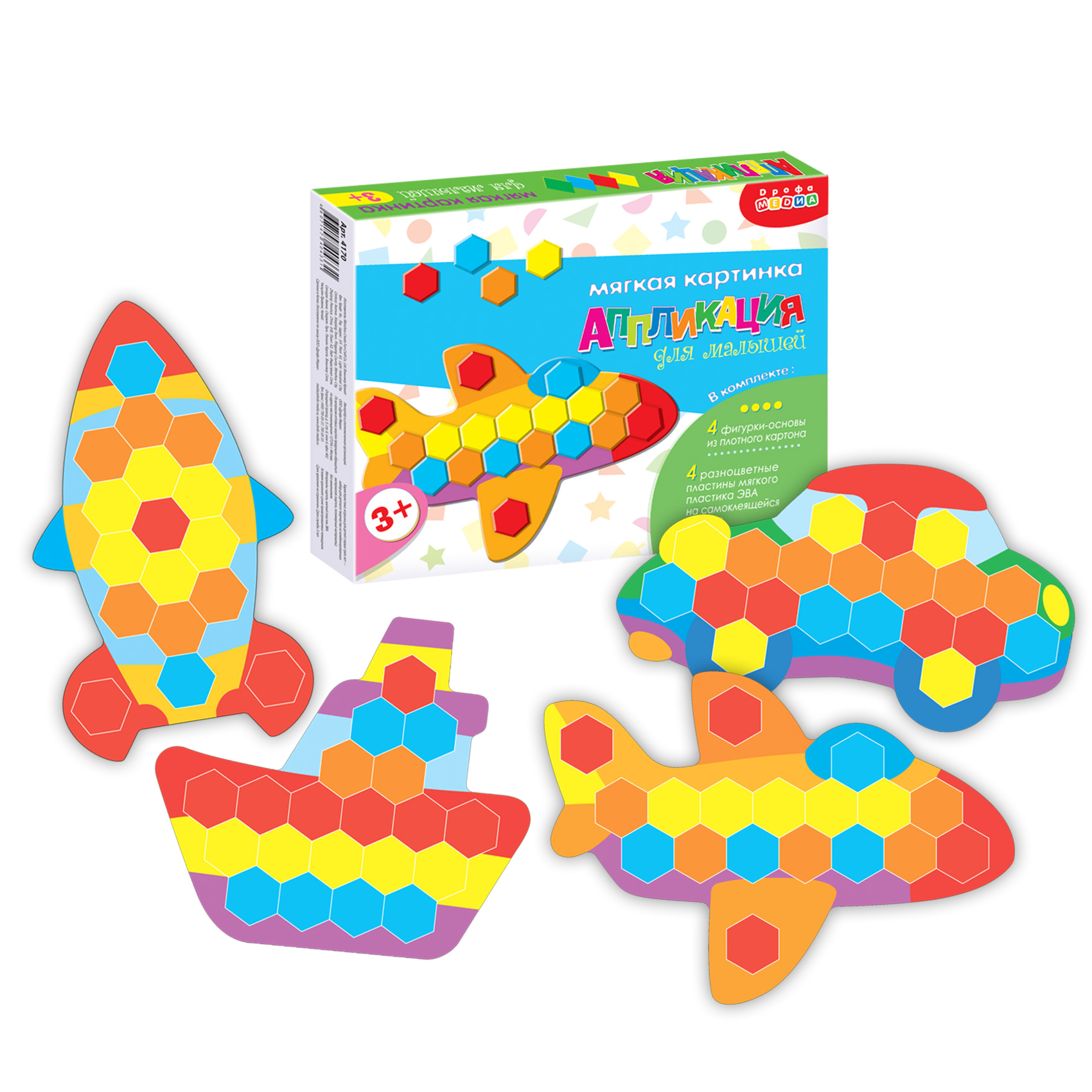 Аппликация - это интересное и полезное занятие для детей разного возраста. В коробке вы найдёте всё для создания замечательных поделок: картонные фигурки четырёх видов транспорта и шестигранные детали из мягкого пластика на самоклеящейся основе. Мы сделали фигурки и детали крупными и детали крупными специально для детских ручек. Этот набор для творчества особенно заинтересуют мальчиков. В процессе аппликации развивается мелкая моторика, глазомер и цветовосприятие. Готовые фигурки напоминают яркую мозаику.