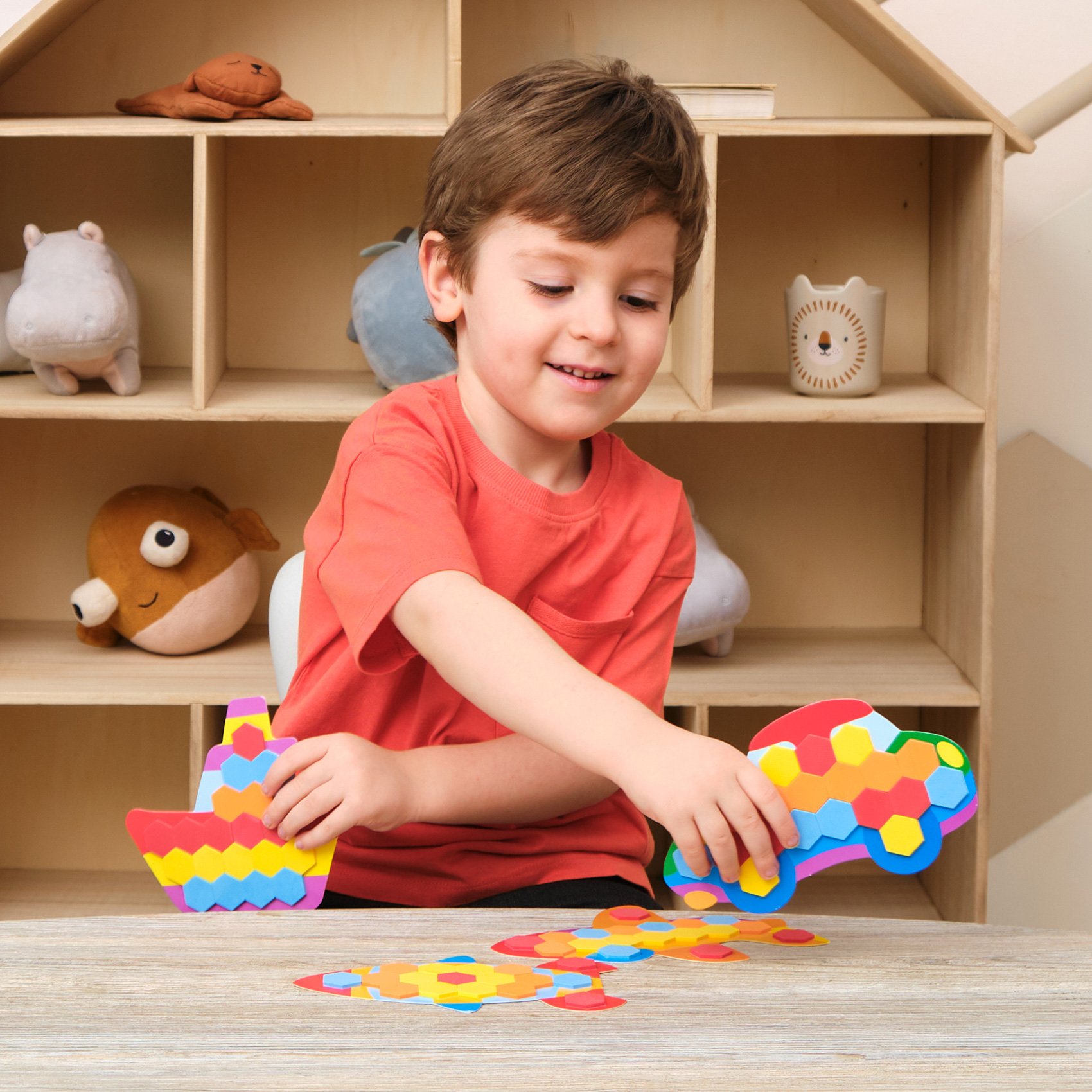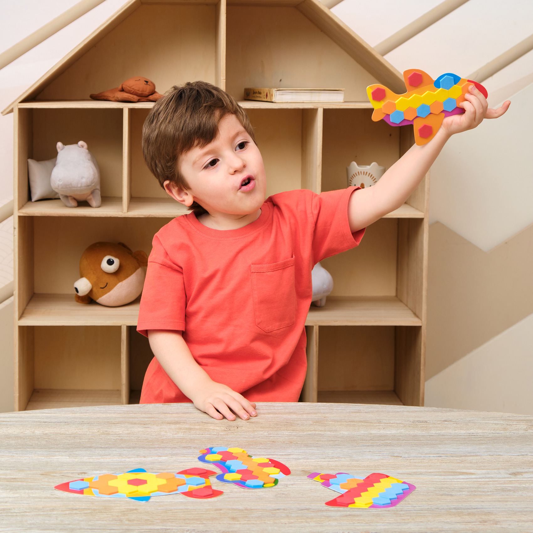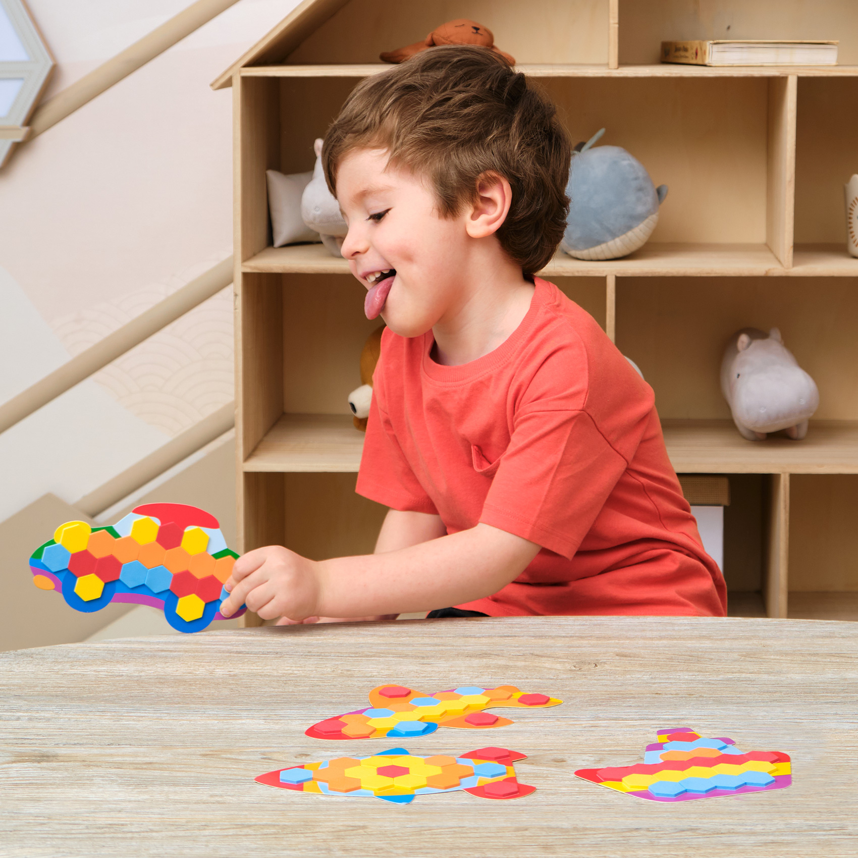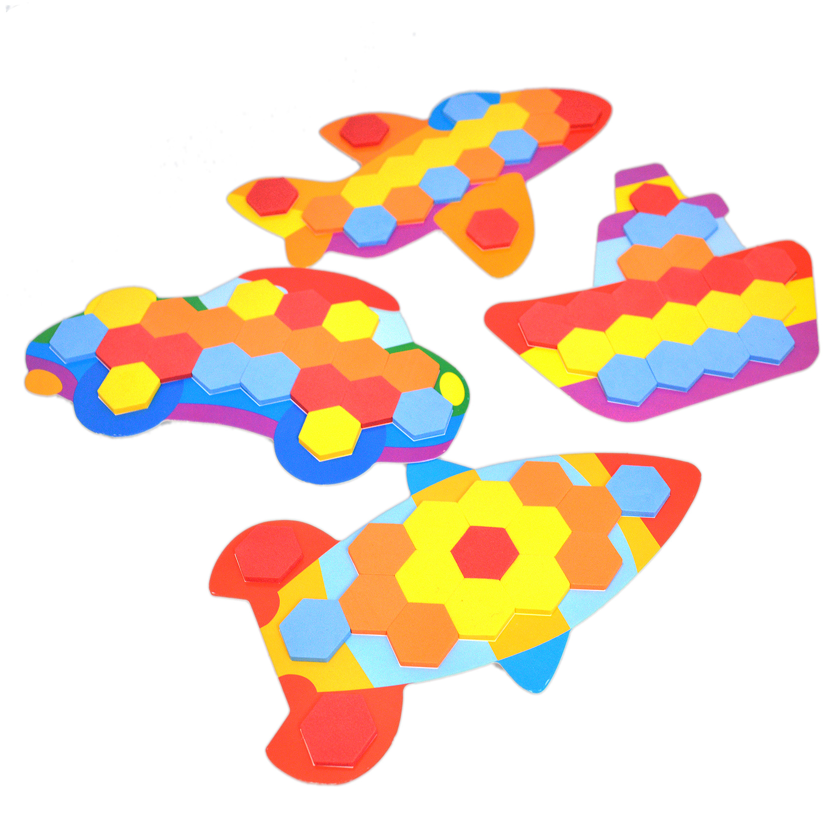 Аппликация - это интересное и полезное занятие для детей разного возраста. В коробке вы найдёте всё для создания замечательных поделок: картонные фигурки четырёх видов транспорта и шестигранные детали из мягкого пластика на самоклеящейся основе. Мы сделали фигурки и детали крупными и детали крупными специально для детских ручек. Этот набор для творчества особенно заинтересуют мальчиков. В процессе аппликации развивается мелкая моторика, глазомер и цветовосприятие. Готовые фигурки напоминают яркую мозаику.