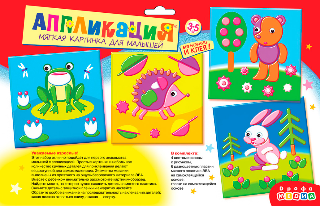 Простые картинки и небольшое количество крупных деталей делают эту аппликацию понятной и доступной для малышей от 3 лет. Детали набора насыщенные и мягкие на ощупь, легко приклеиваются на картинку-основу. Несмотря на простоту исполнения, готовое изделие отличается красочностью, рельефностью и выразительностью. В наборе 4 аппликации.