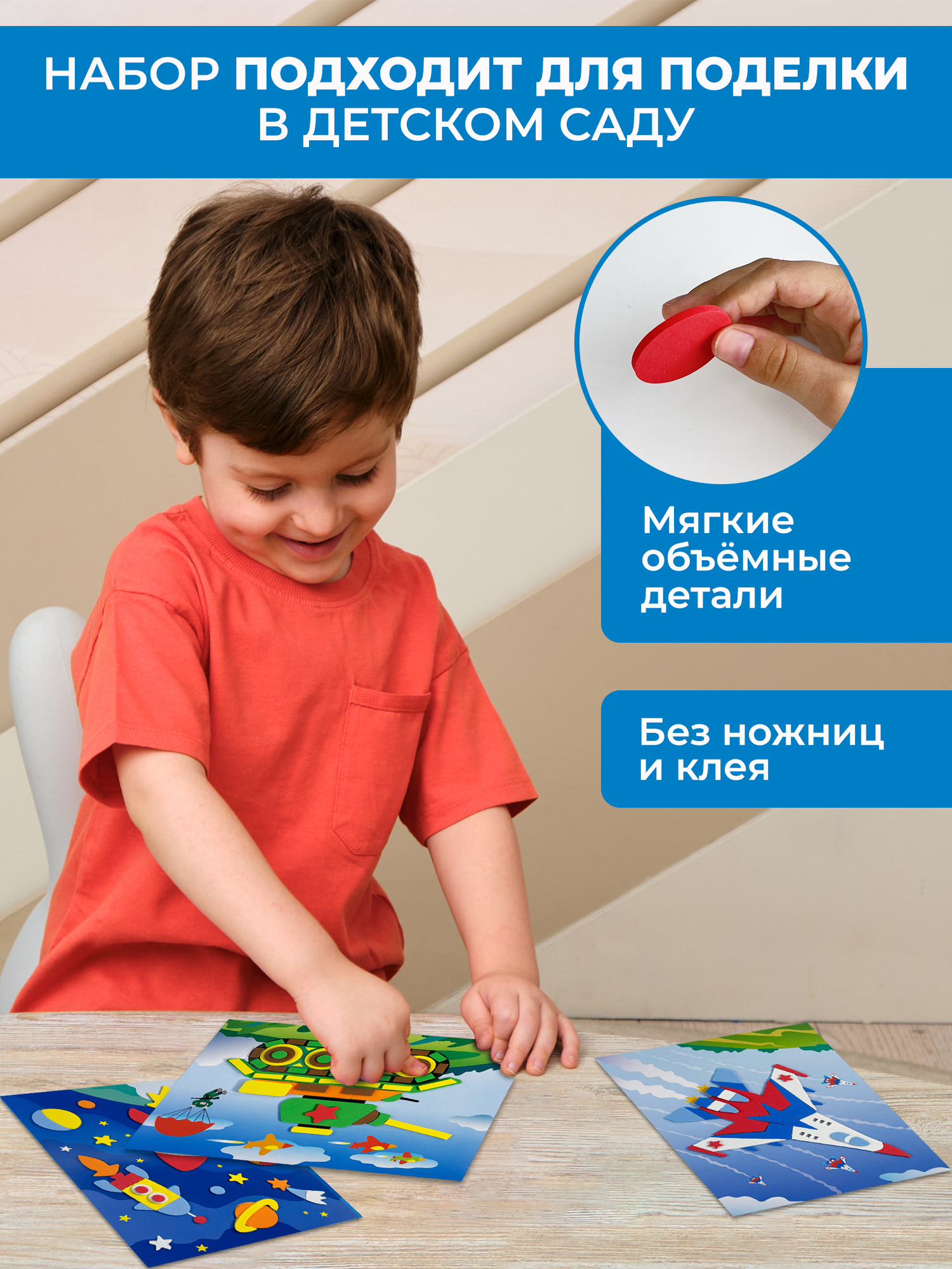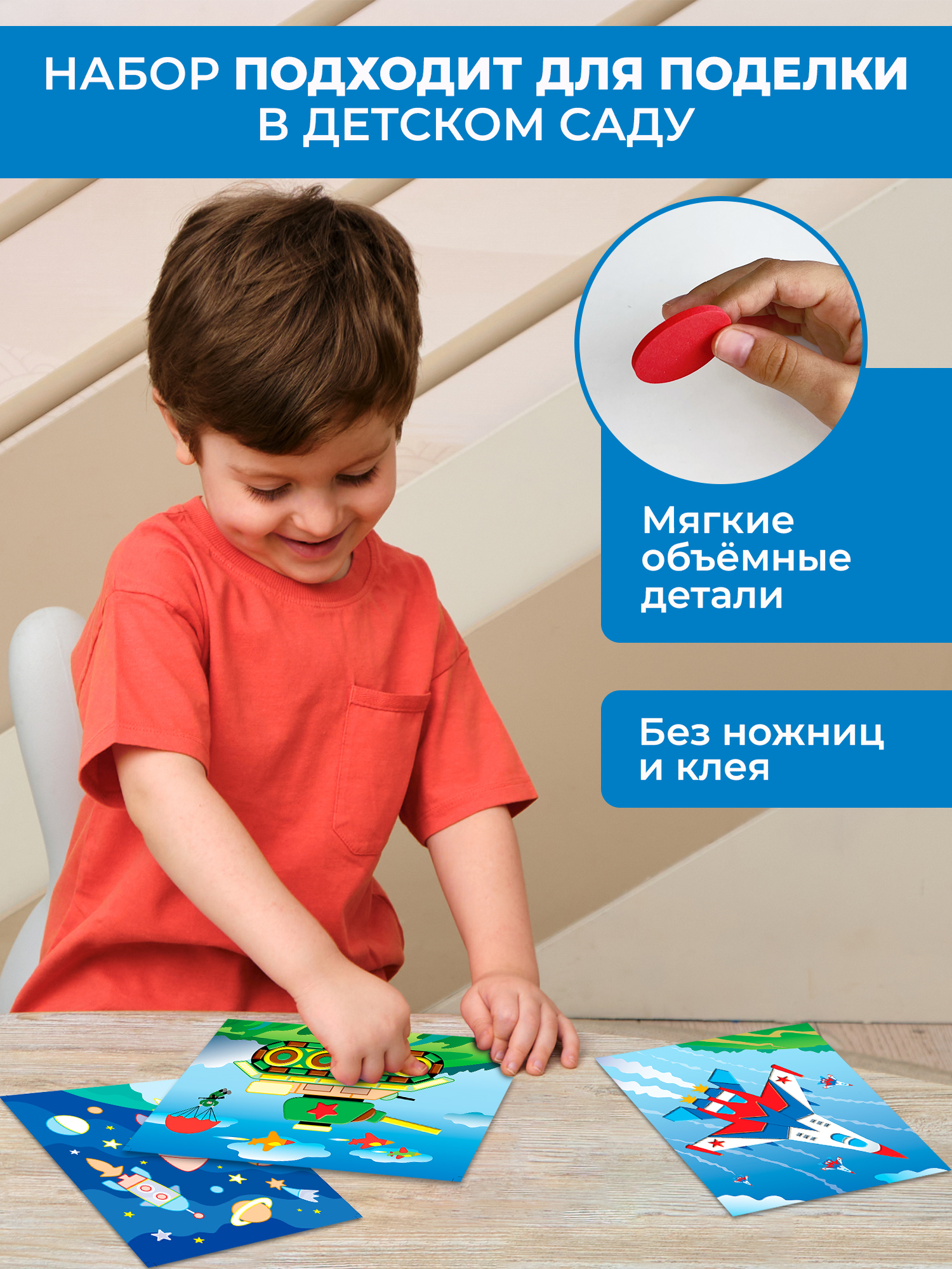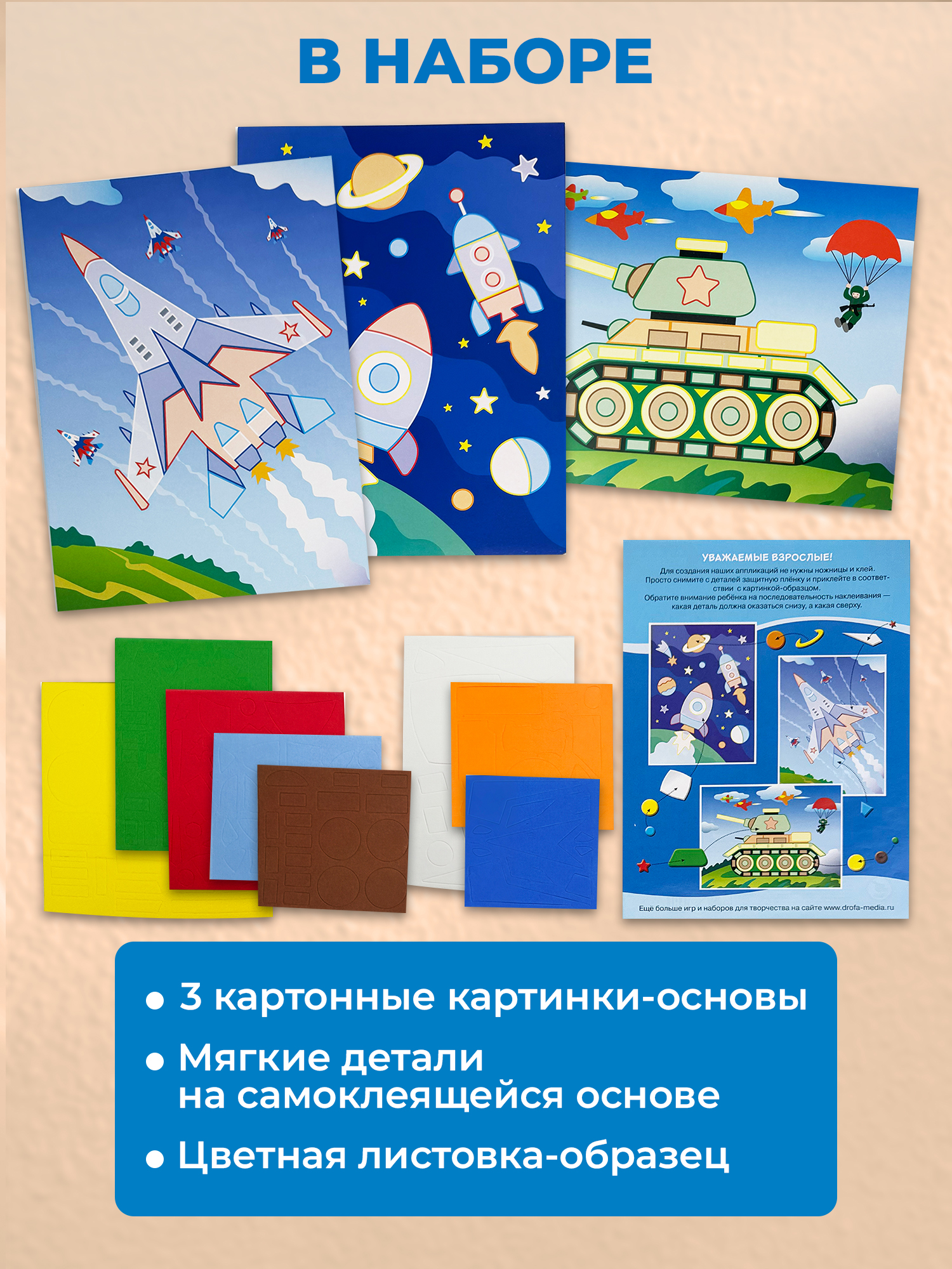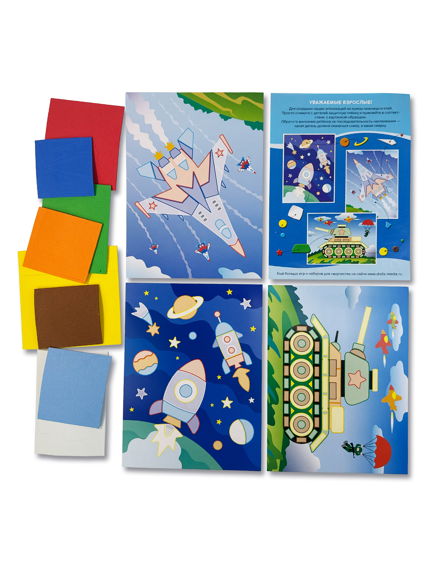 - 8 разноцветных пластин с мягкими самоклеящимися деталями;