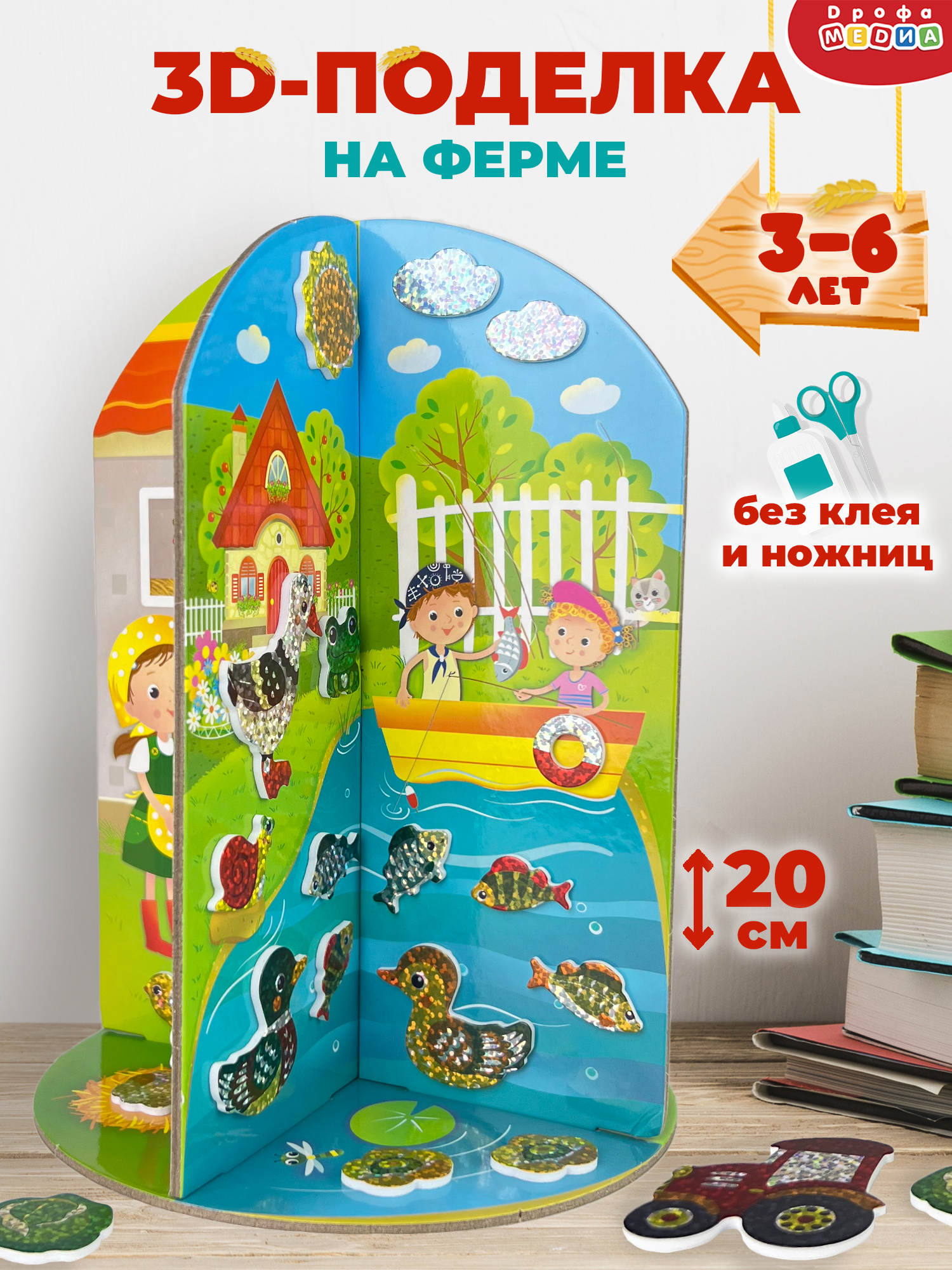 На каждой стороне 3D-поделки представлены разные части фермы (скотный двор, птичник, огород, пруд). Набор знакомит с обитателями фермы, деятельностью человека в деревне.