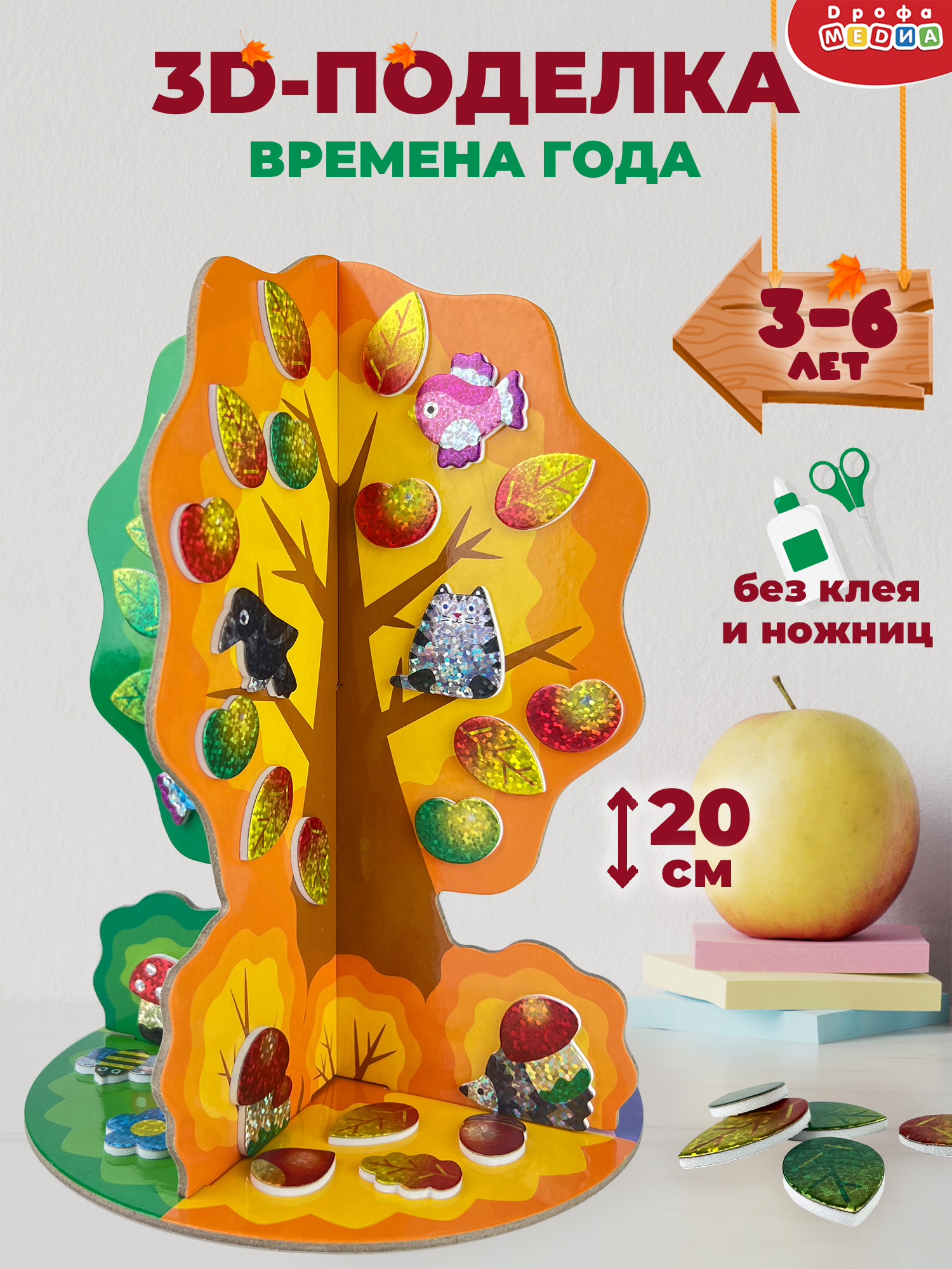 На каждой стороне сезонного чудо-дерева представлено время года (зима, весна, лето, осень). Сделать дерево несложно: оно складывается из трёх частей без клея и ножниц. Детали из мягкого пластика с блестящим голографическим покрытием имеют липкий слой, нужно лишь приклеить их в нужном месте, в зависимости от сезона.