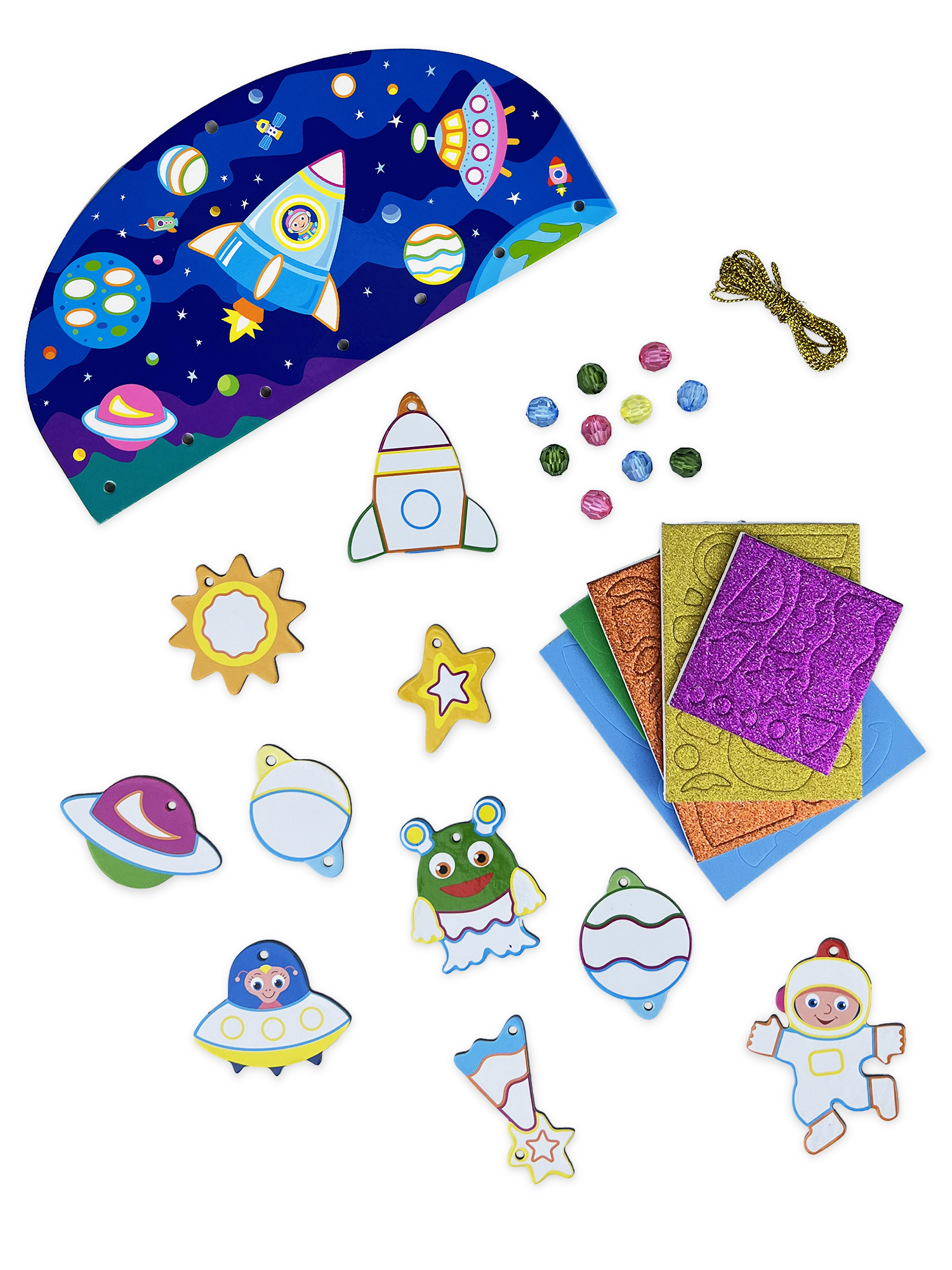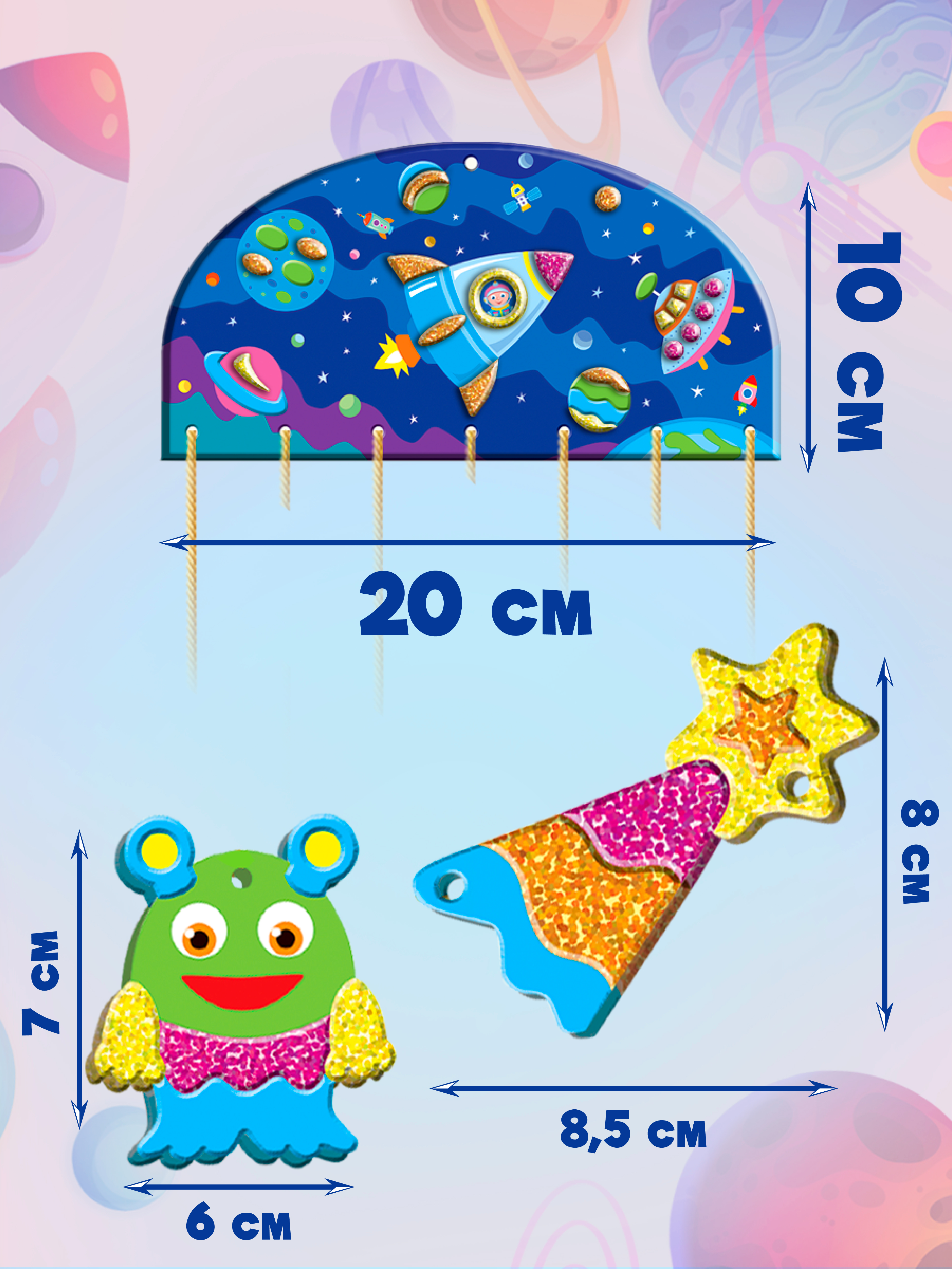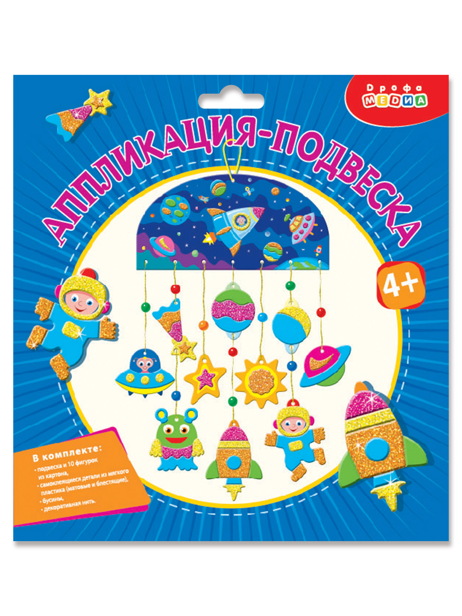 В комплекте: подвеска, 10 фигурок из картона, детали из мягкого пластика ЭВА (матовые и блестящие) на самоклеящейся основе, бусины, декоративная нить.