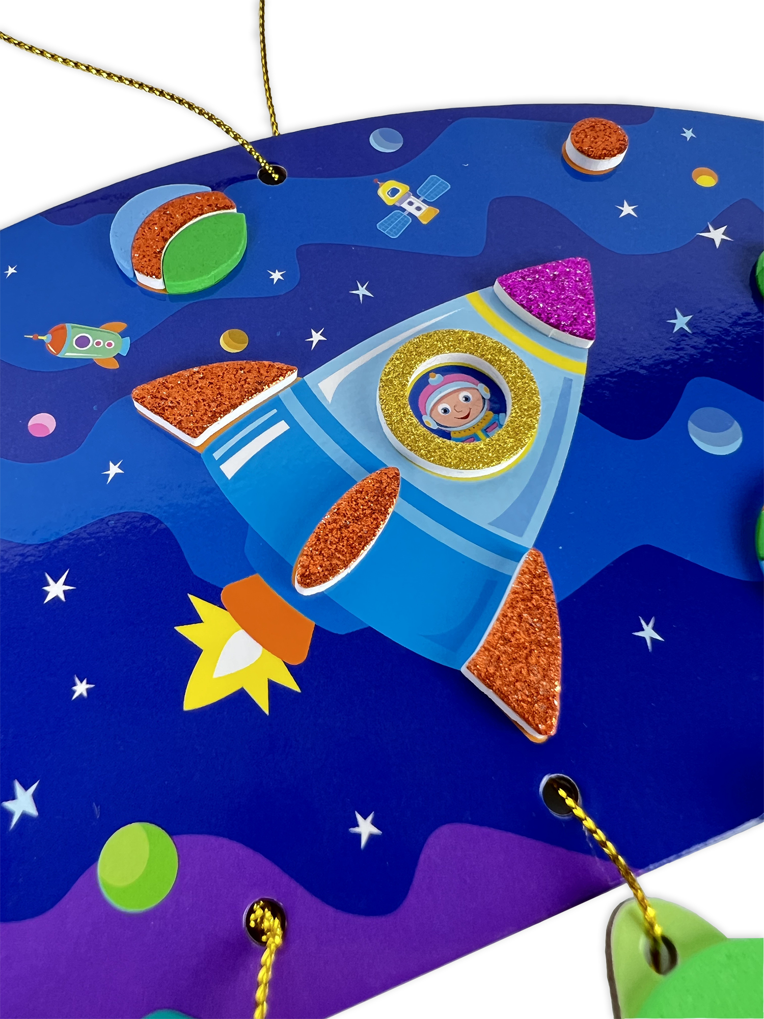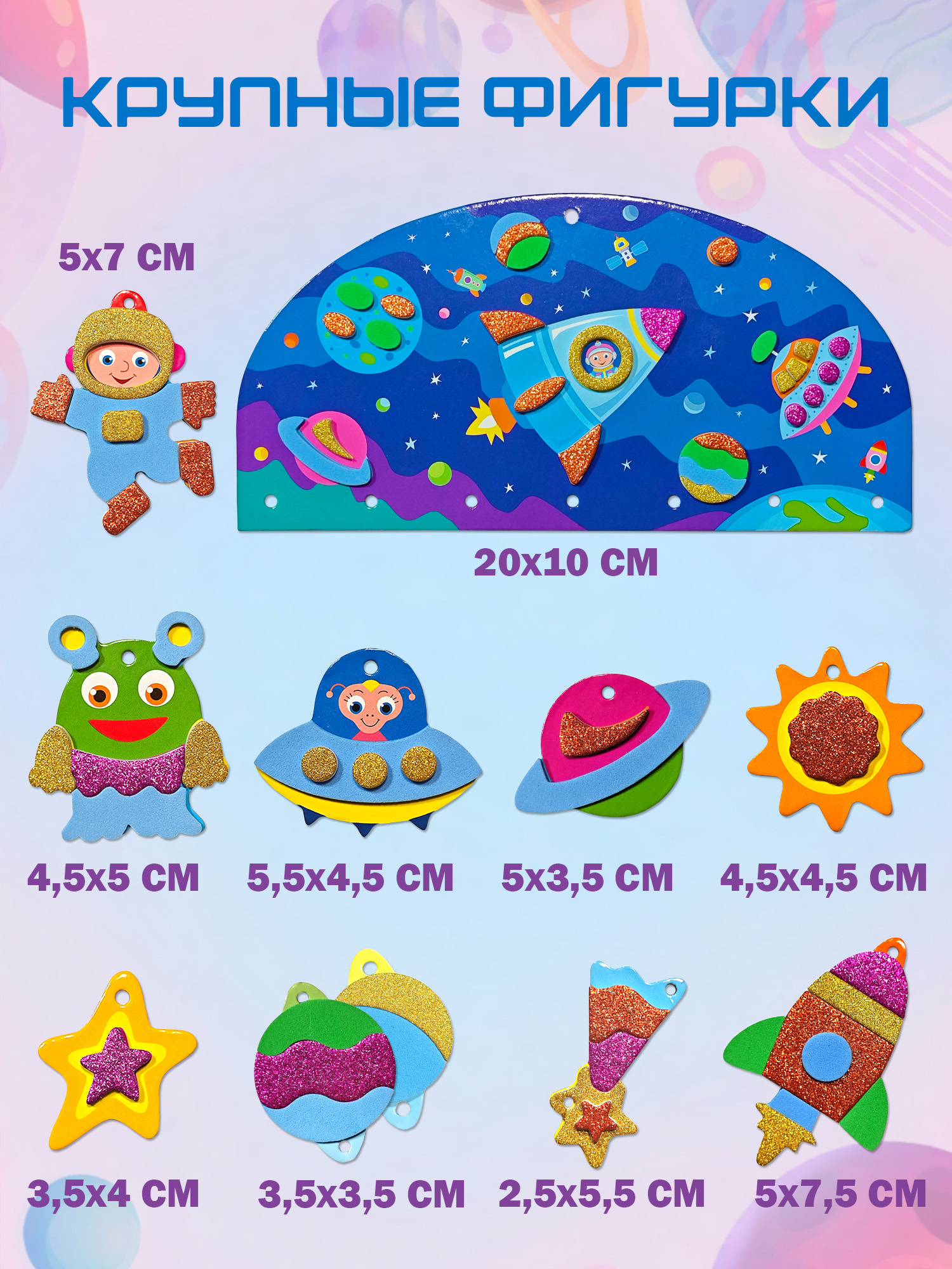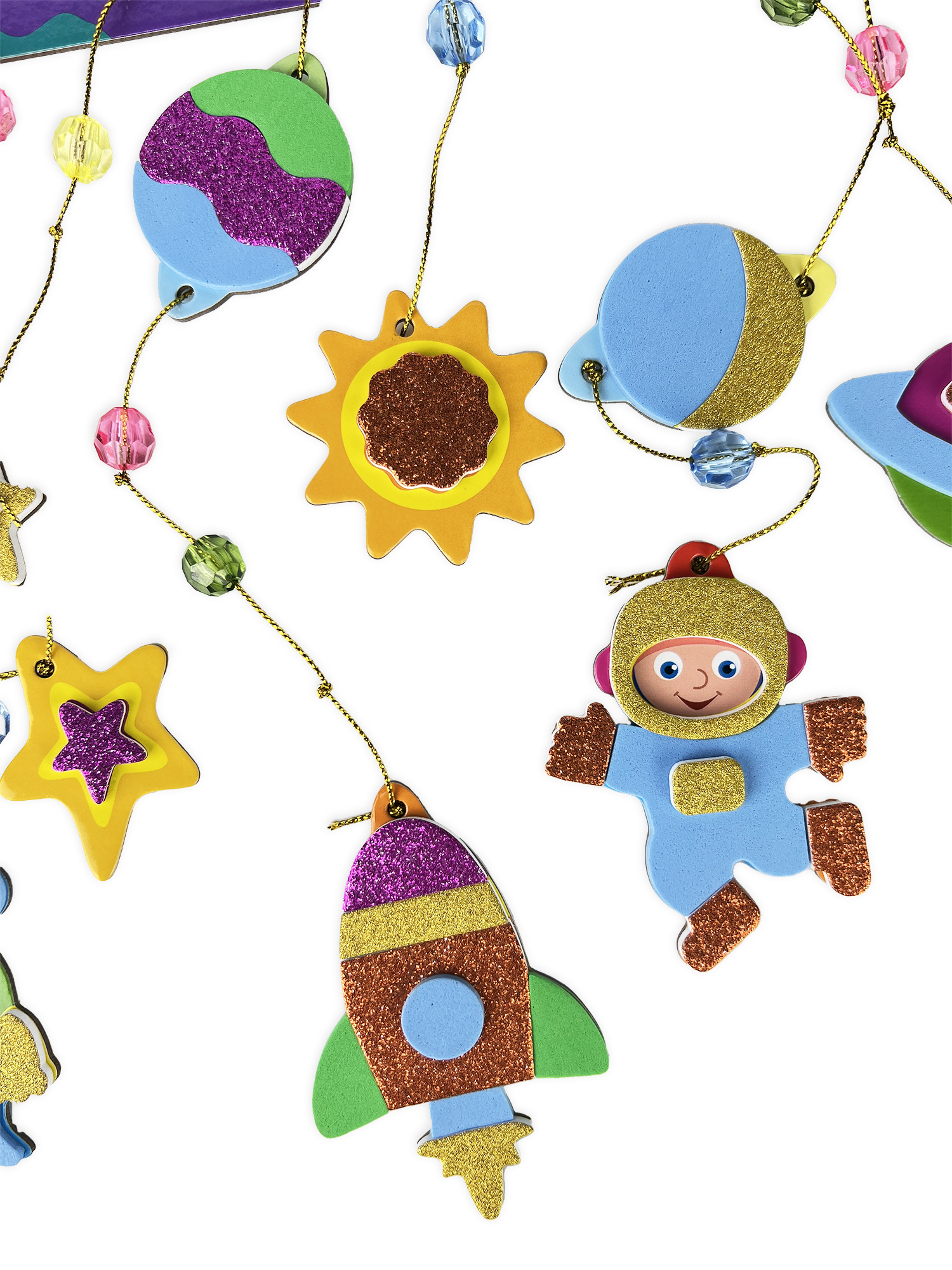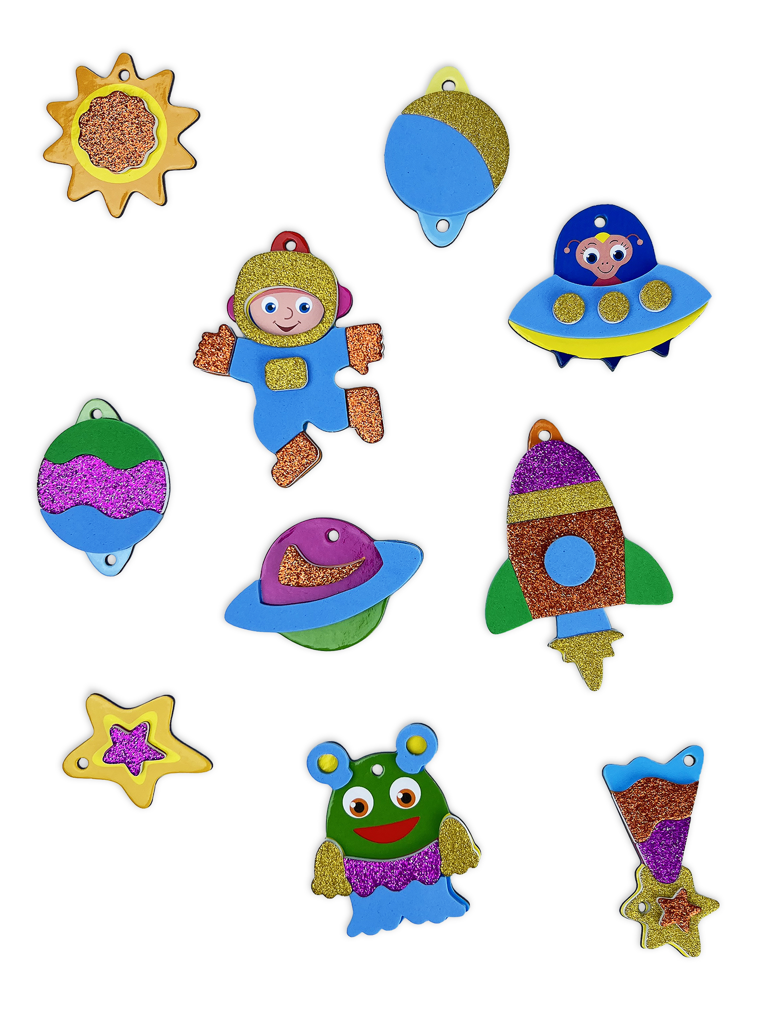В комплекте: подвеска, 10 фигурок из картона, детали из мягкого пластика ЭВА (матовые и блестящие) на самоклеящейся основе, бусины, декоративная нить.