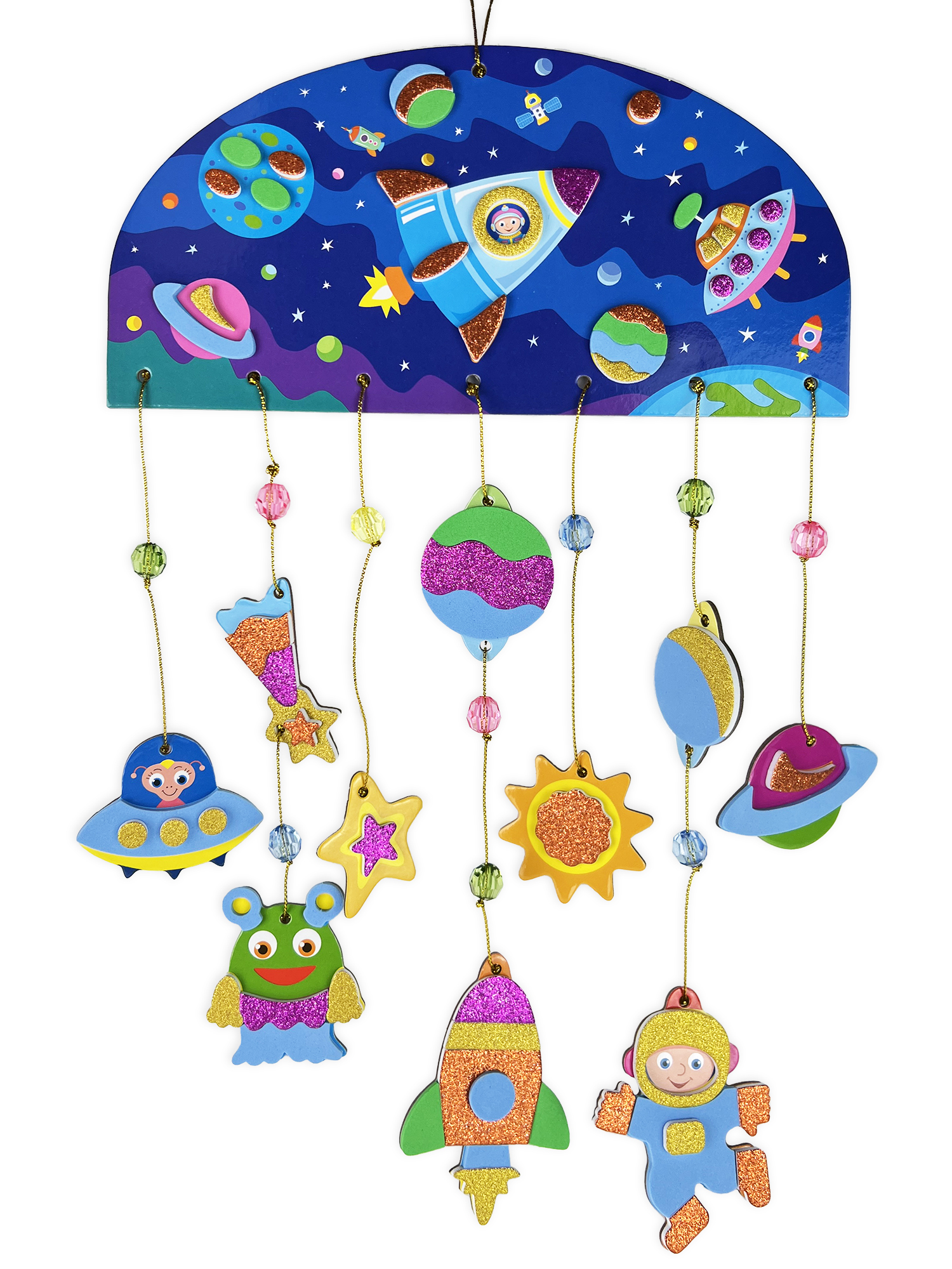 После того как фигурки будут готовы, подвесьте их к держателю. Украсьте нити декоративными бусинами и поделка готова!