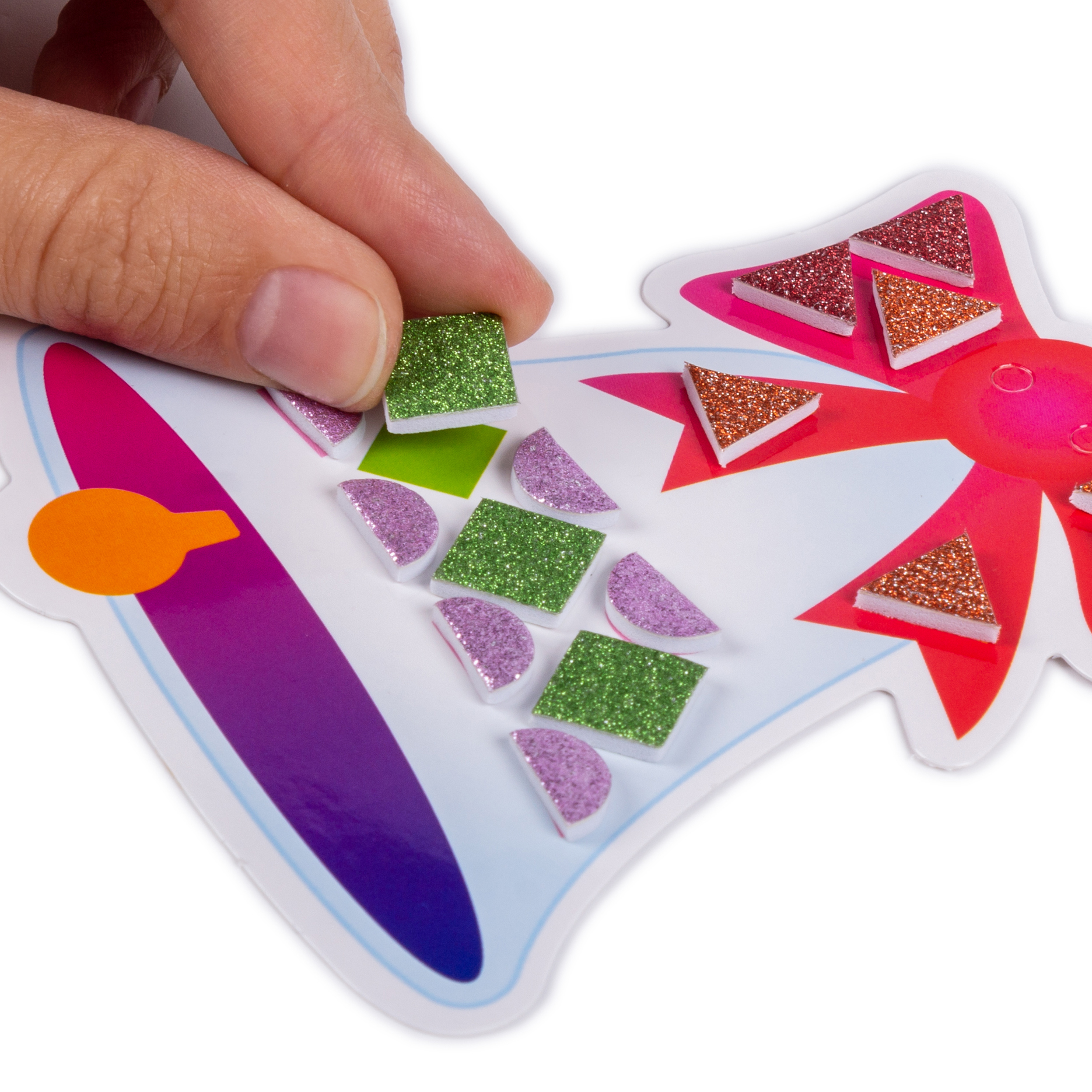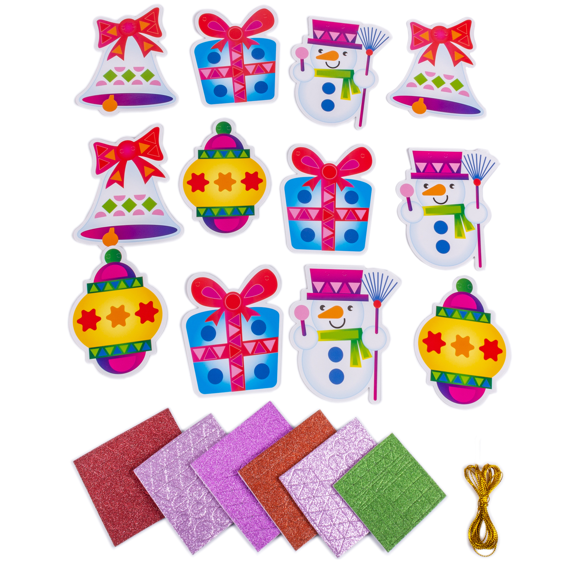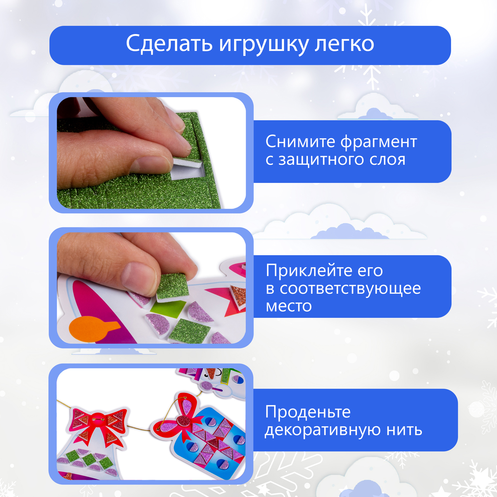 В наборе есть всё, что нужно для создания гирлянды: 12 фигурок из картона, блестящие самоклеящиеся детали для украшения и декоративная нить для нанизывания фигурок. Все детали аппликации уже вырезаны и готовы к работе. Нужно лишь снять с защитного слоя фрагмент и приклеить его в соответствующее место на той или иной фигурке, продеть декоративную нить.