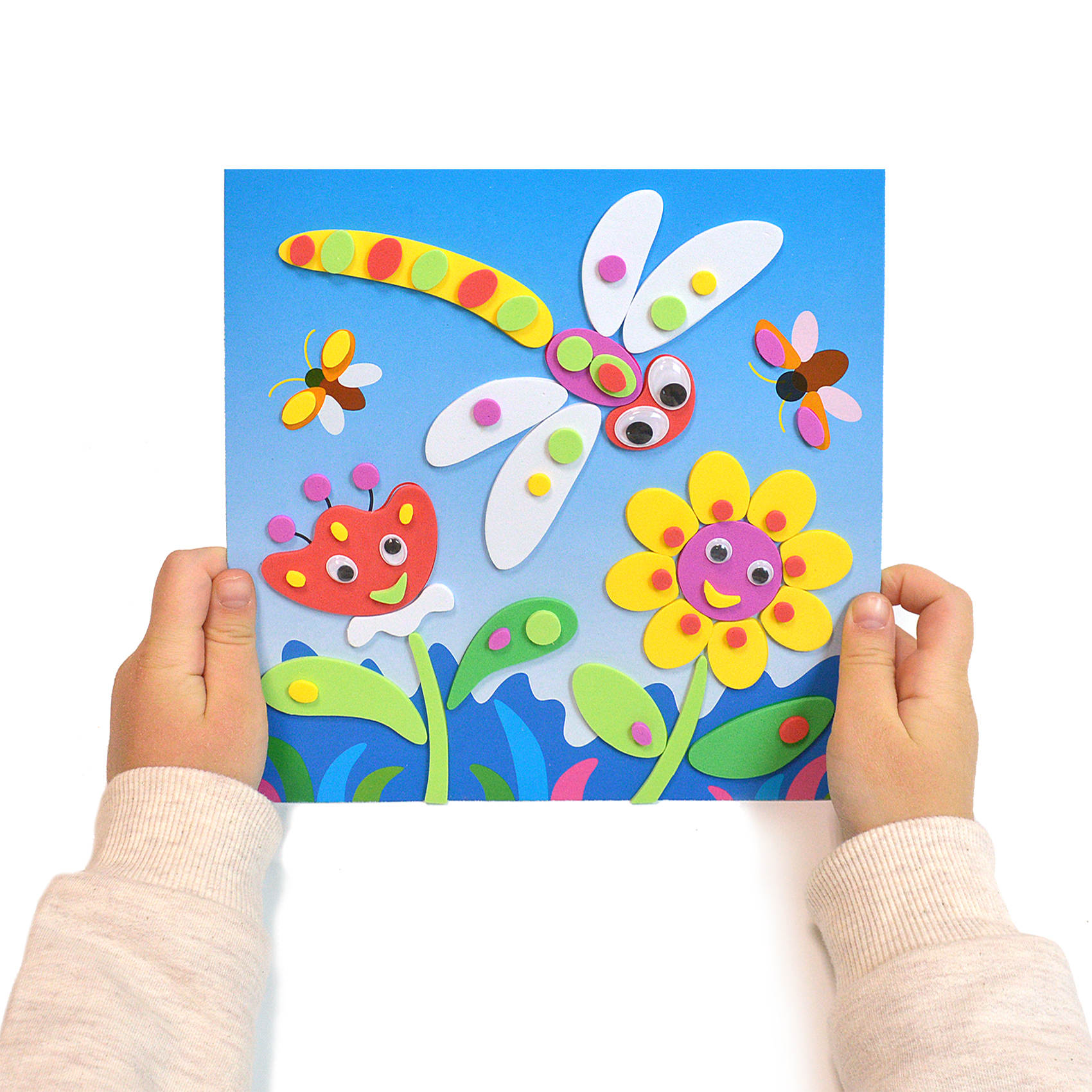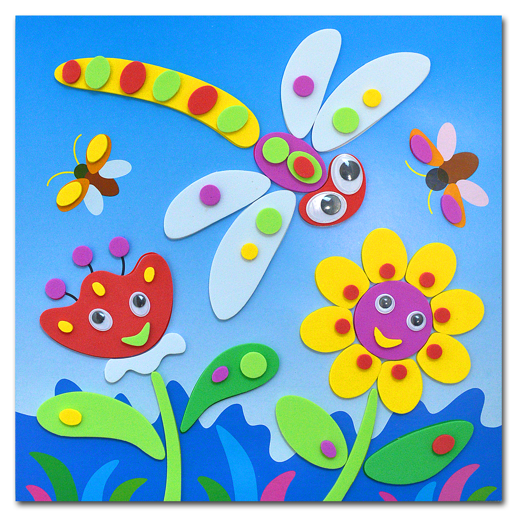 Яркие, простые иллюстрации прекрасно подходят для первого знакомства малыша с аппликацией. Задорная стрекоза и красивые цветы понравятся и мальчикам и девочкам.