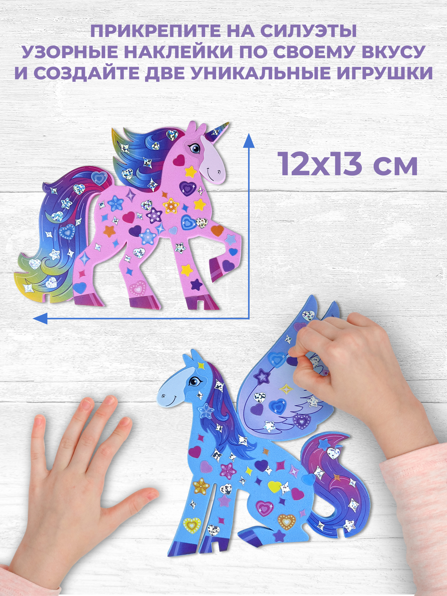 В комплекте 2 объёмные фигурки с подставками, которые нужно украсить узорными наклейками и голографическими стикерами. Малыш легко сделает это самостоятельно, ведь клей и ножницы ему не понадобятся. Фигурки можно украшать с двух сторон, а наклейки прикреплять друг на друга и переклеивать – качество материала позволяет это сделать.