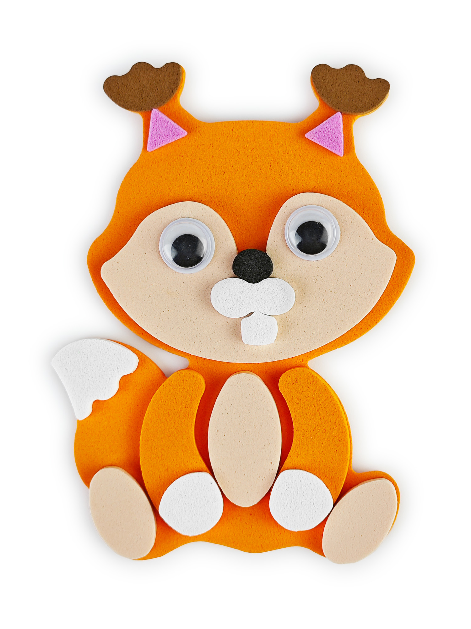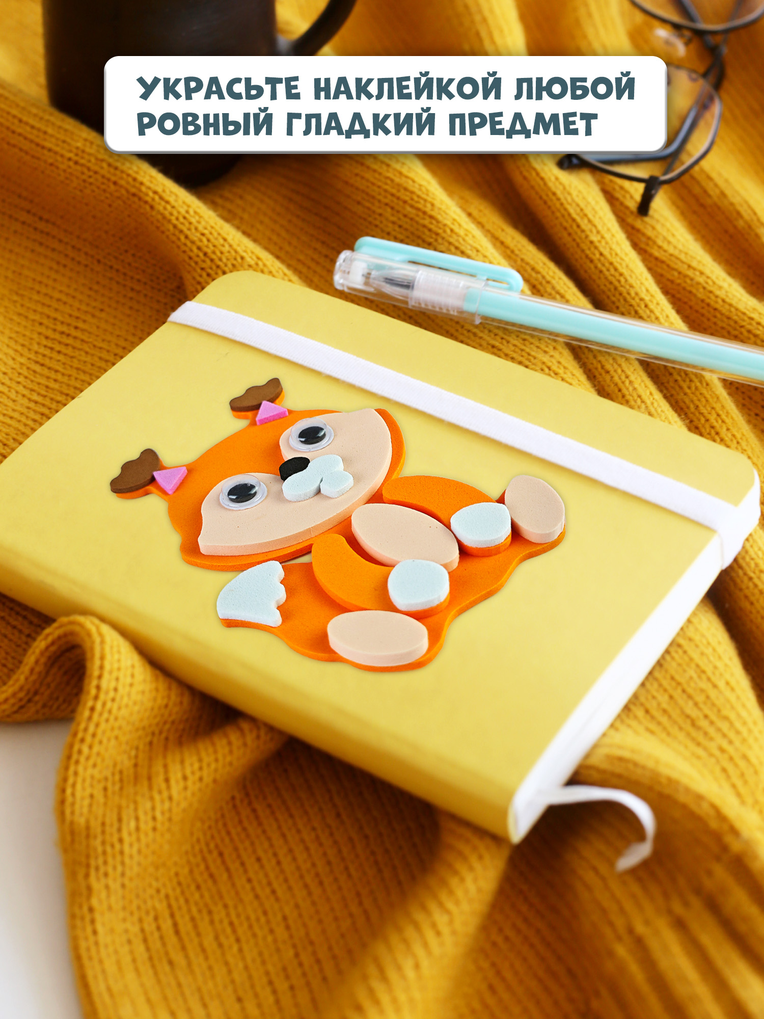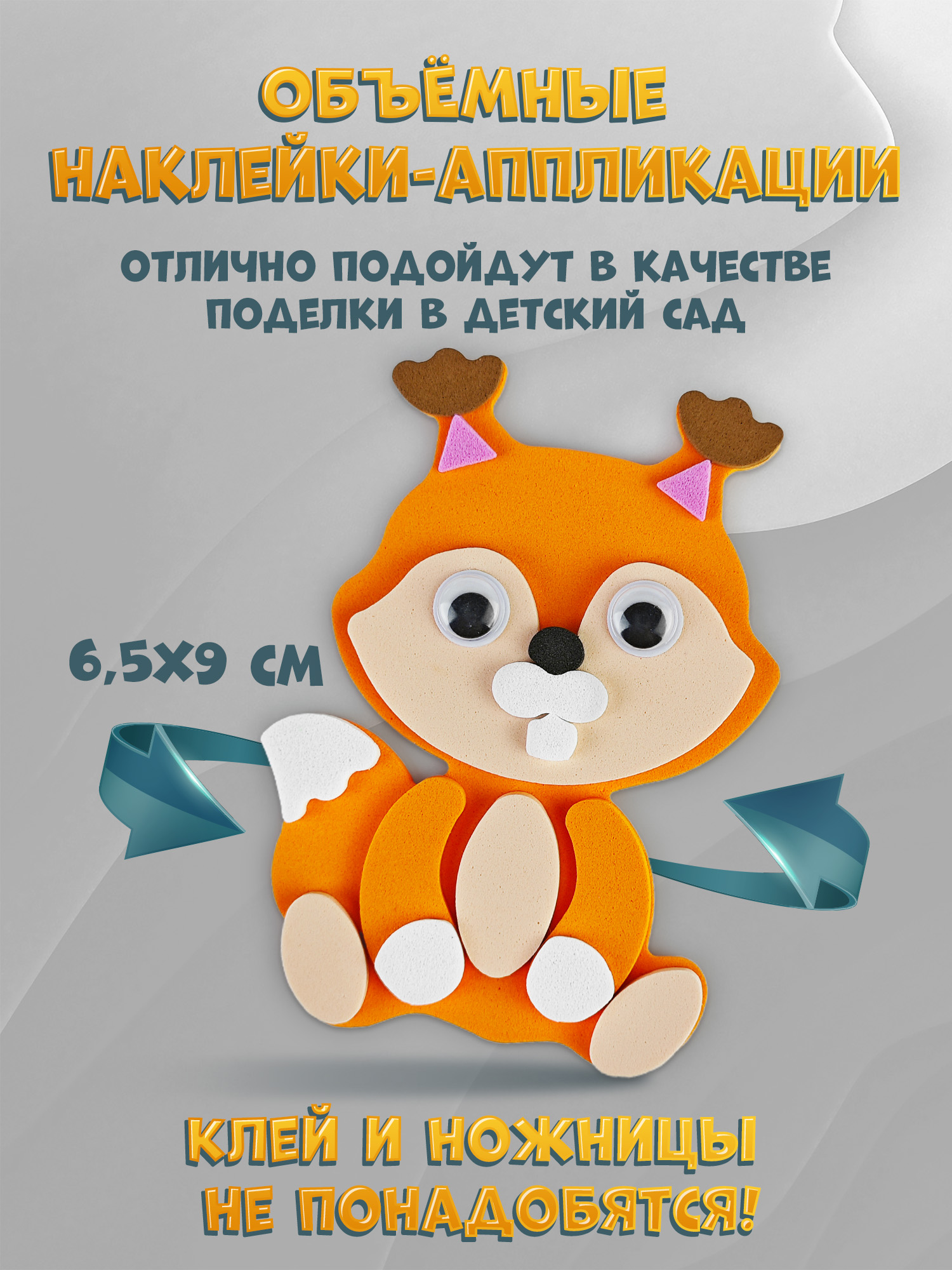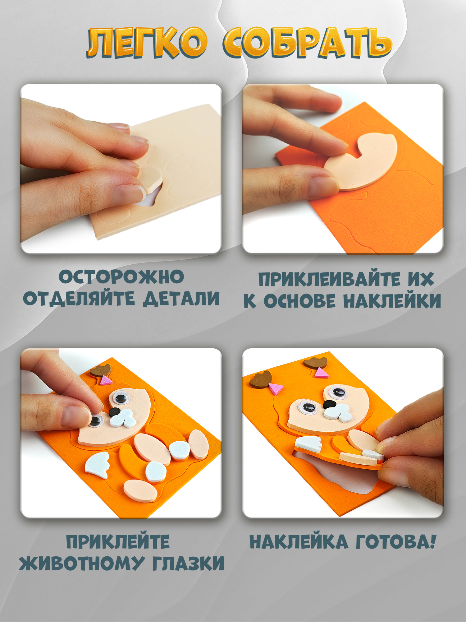 Элементы аппликации выполнены из приятного на ощупь безопасного материала ЭВА. Сделать объёмные наклейки очень просто: снимайте с деталей защитную плёнку и приклеивайте на фигурку в соответствии с картинкой-образцом. Обратите внимание ребёнка на последовательность наклеивания деталей – что должно оказаться снизу, а что сверху.
