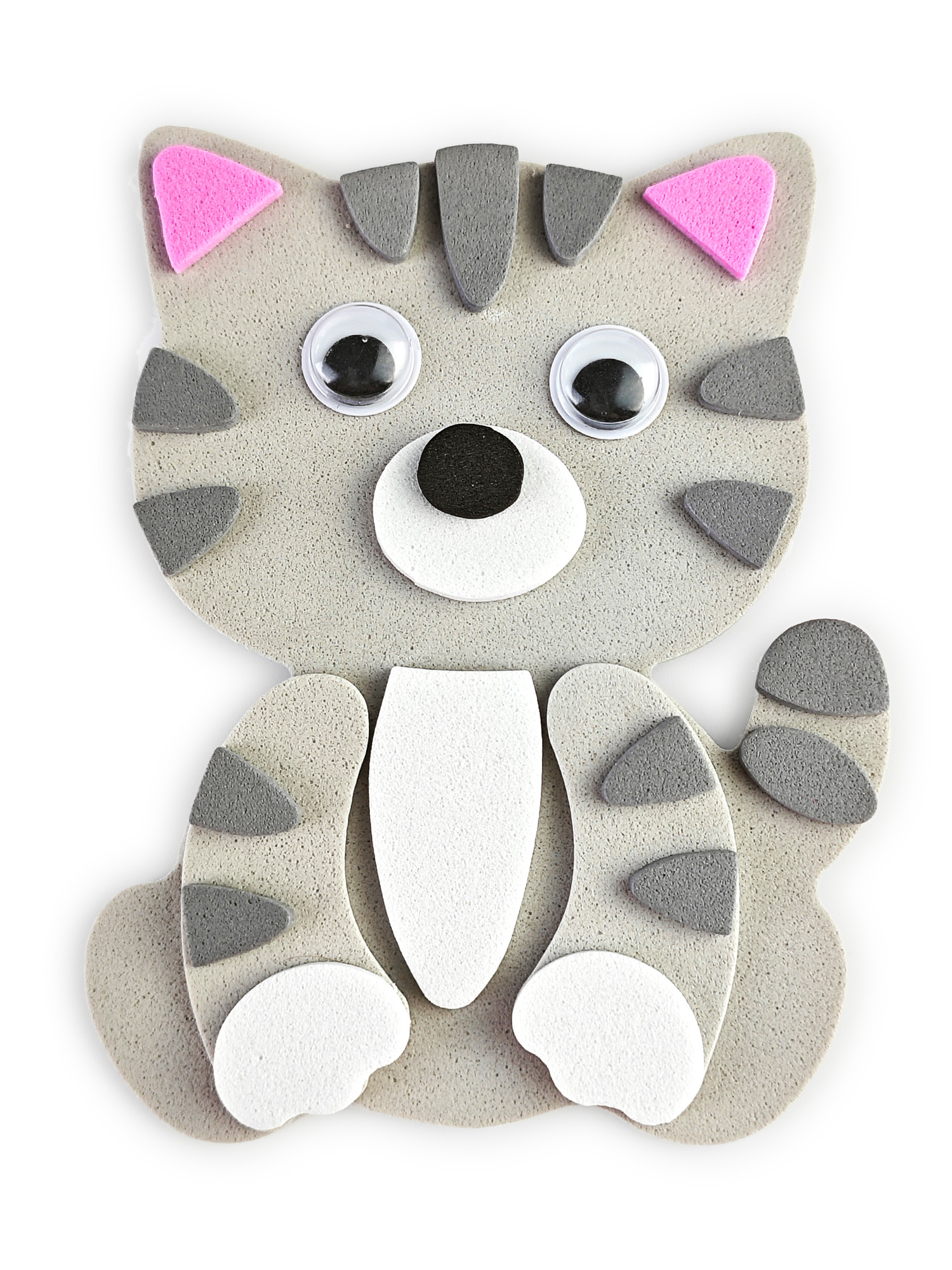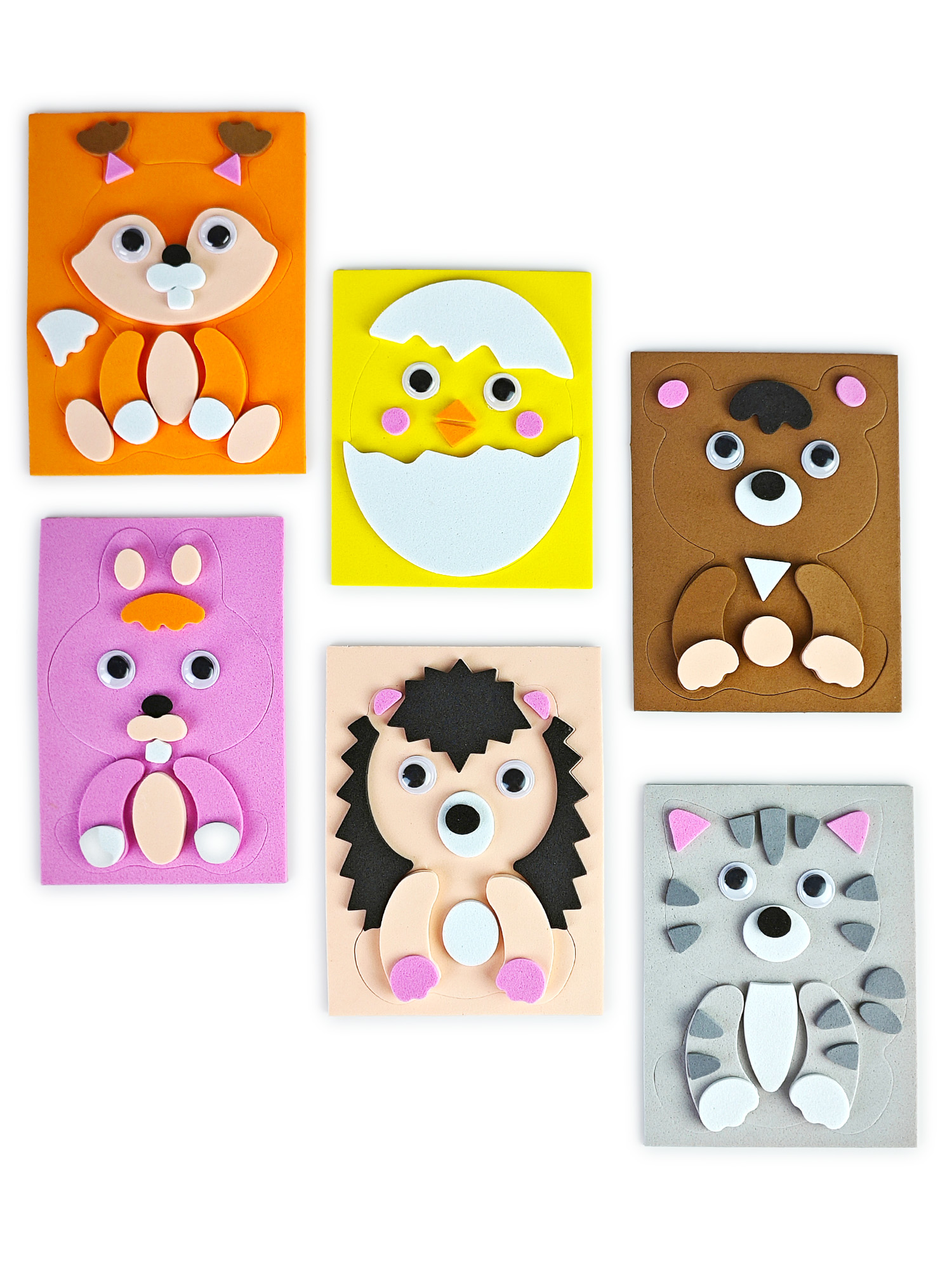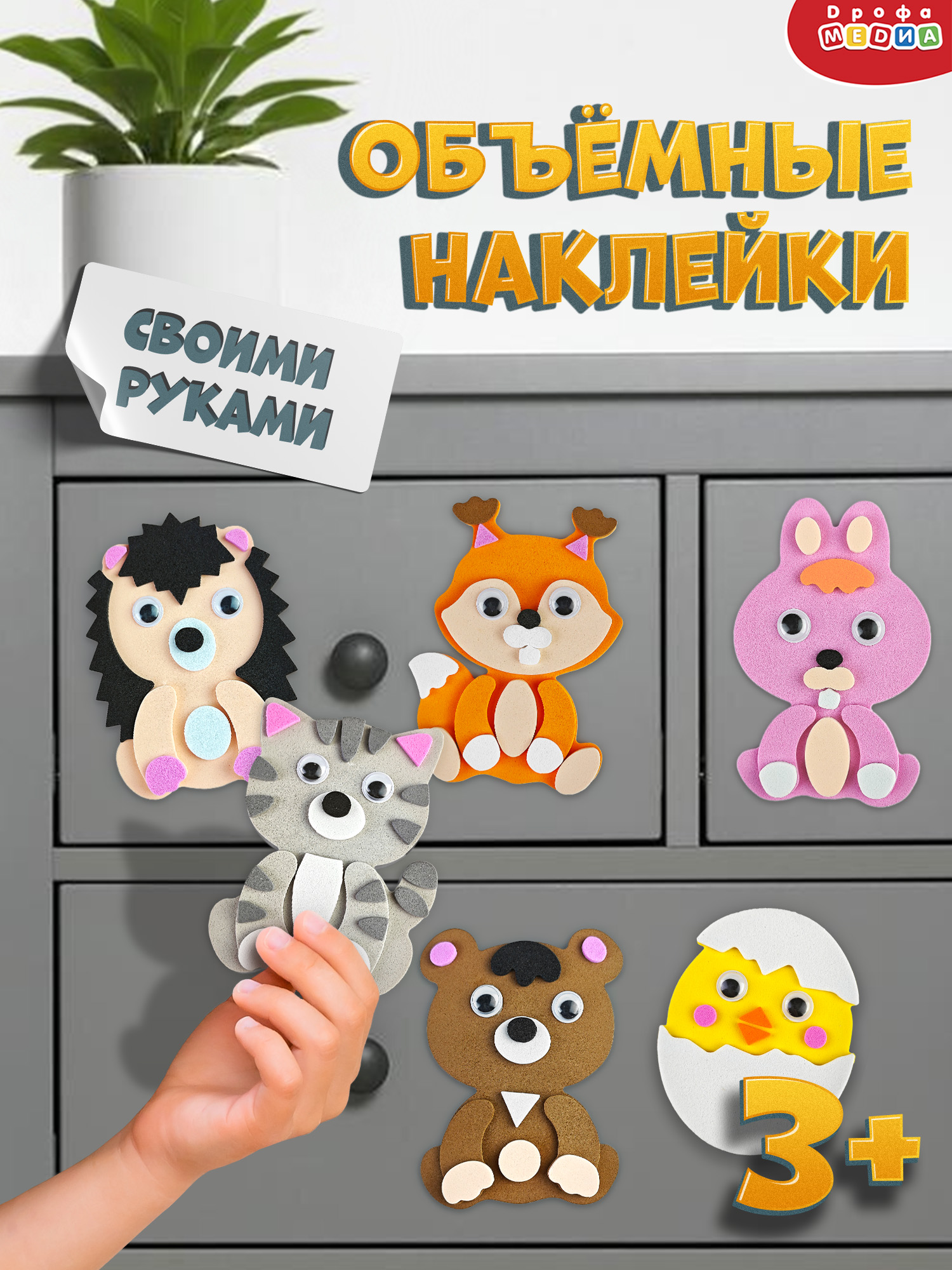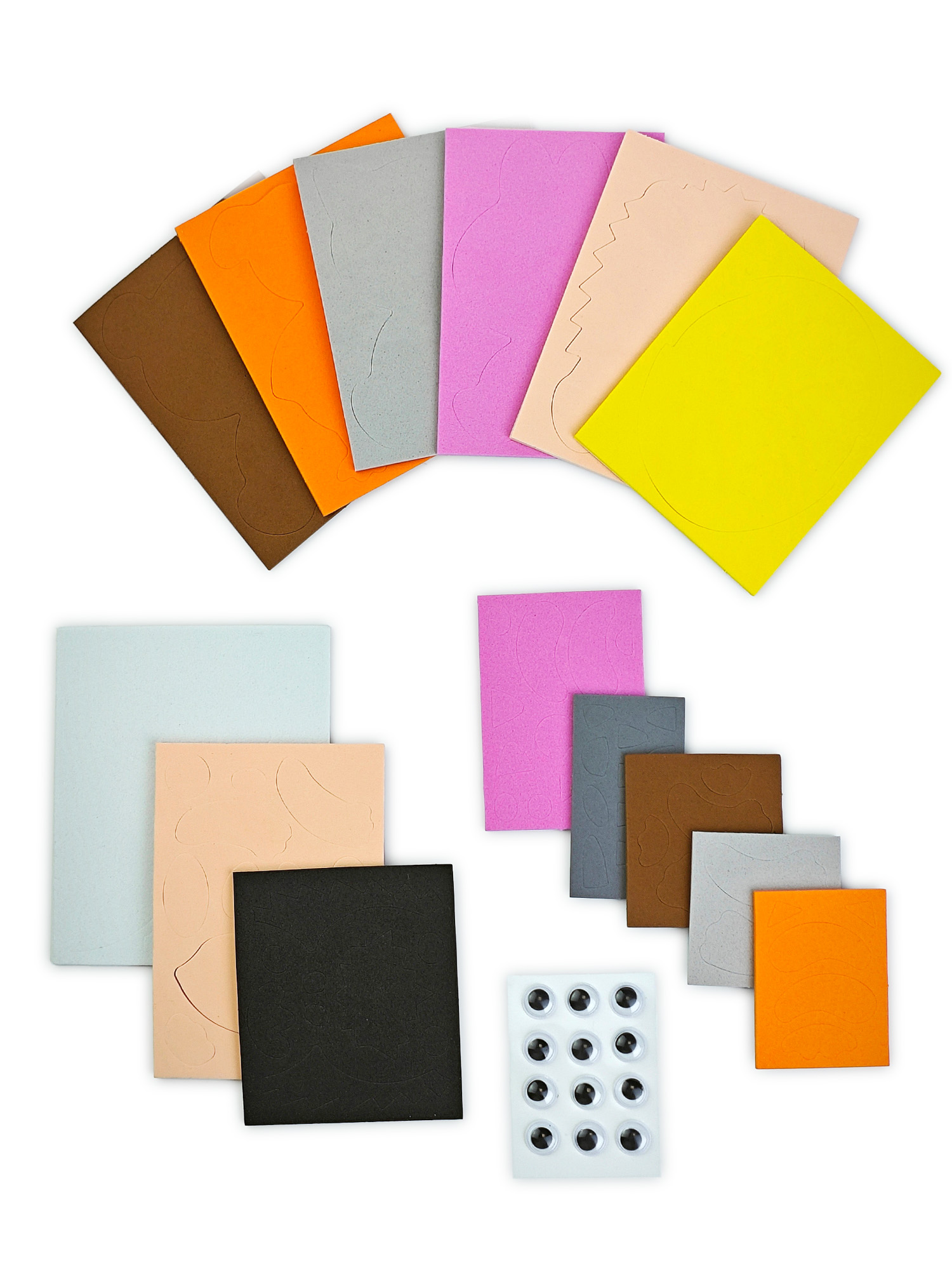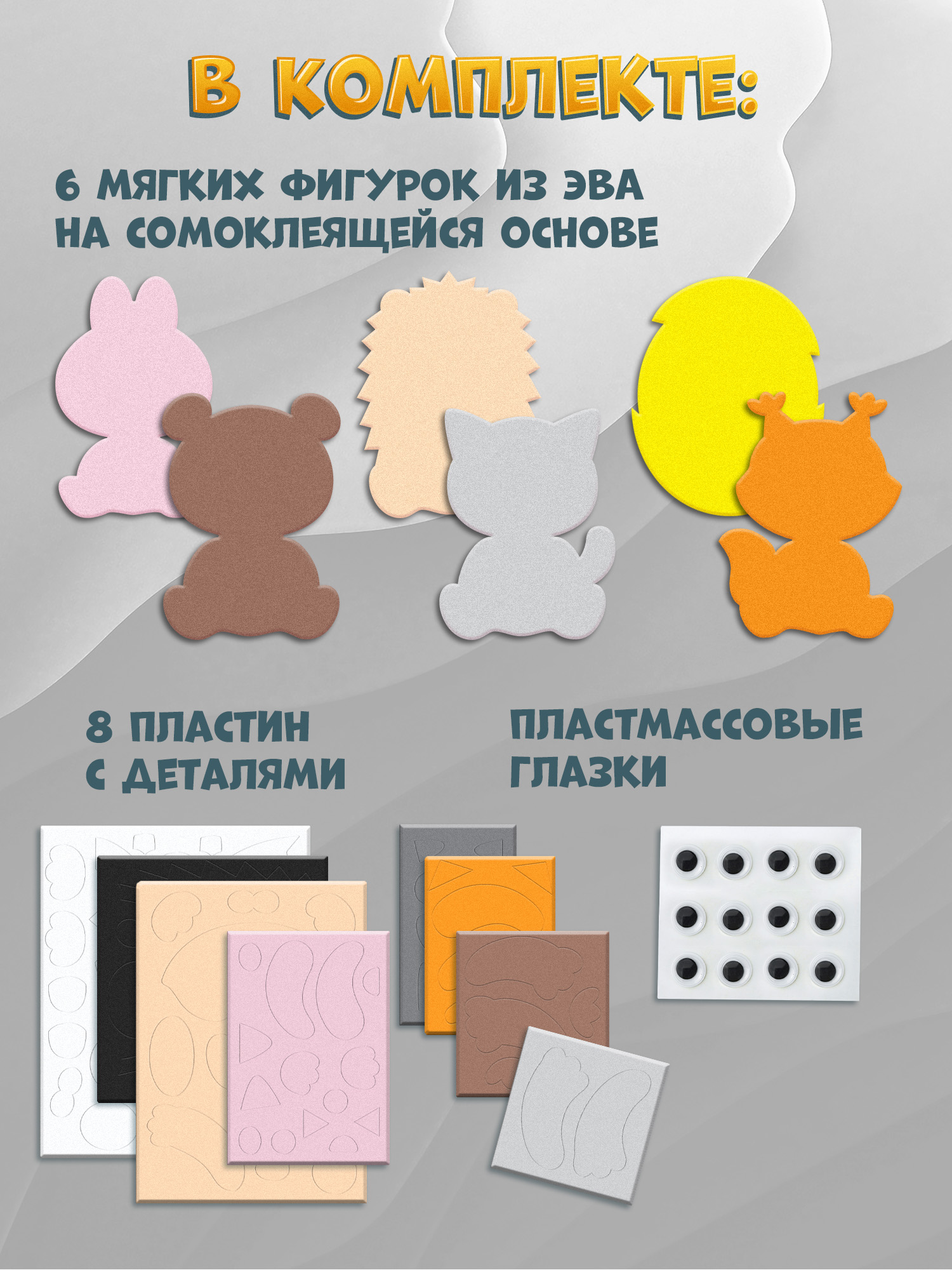 В комплекте: 6 фигурок из мягкого пластика ЭВА на самоклеящейся основе, 8 пластин с деталями, пластмассовые глазки.