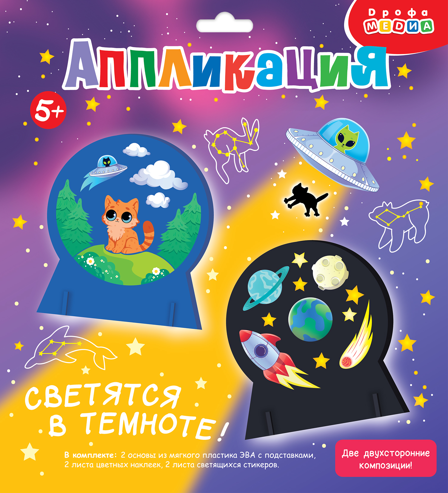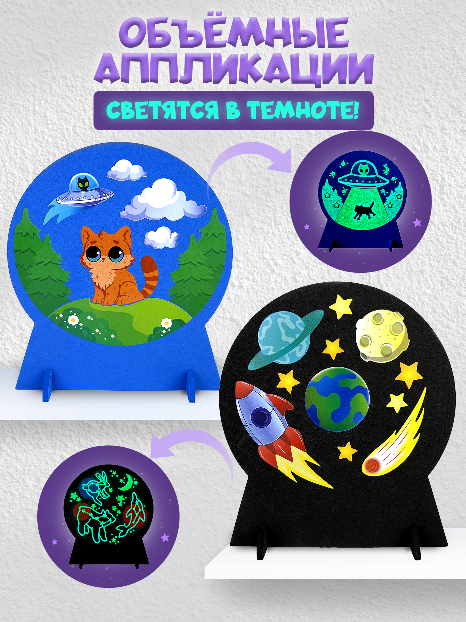Космические истории – это новый набор объёмных аппликаций, которые светятся в темноте! Основа фигурок – мягкий пластик ЭВА – современный и экологически чистый материал. Он гигиеничен, не вызывает аллергии, безопасен и приятен на ощупь.
