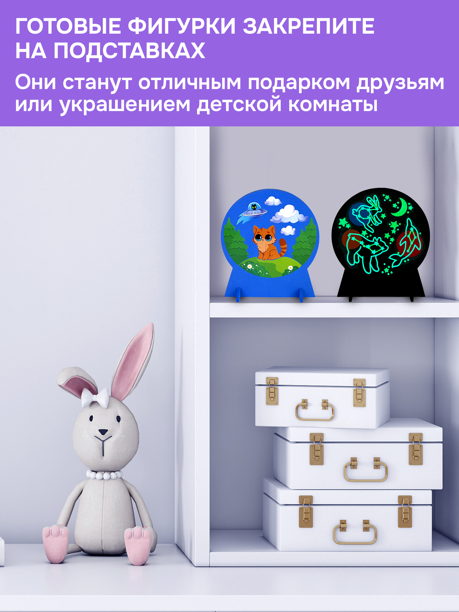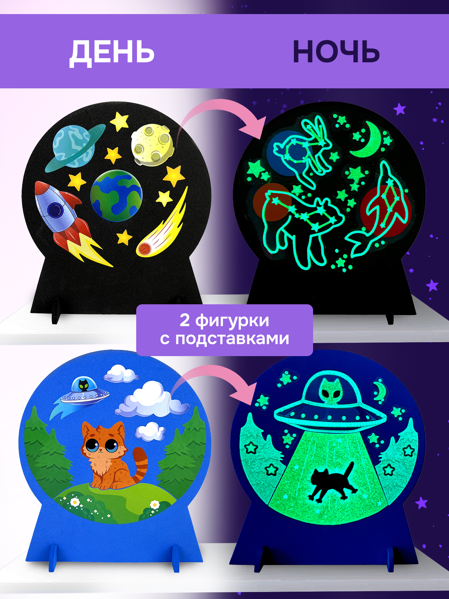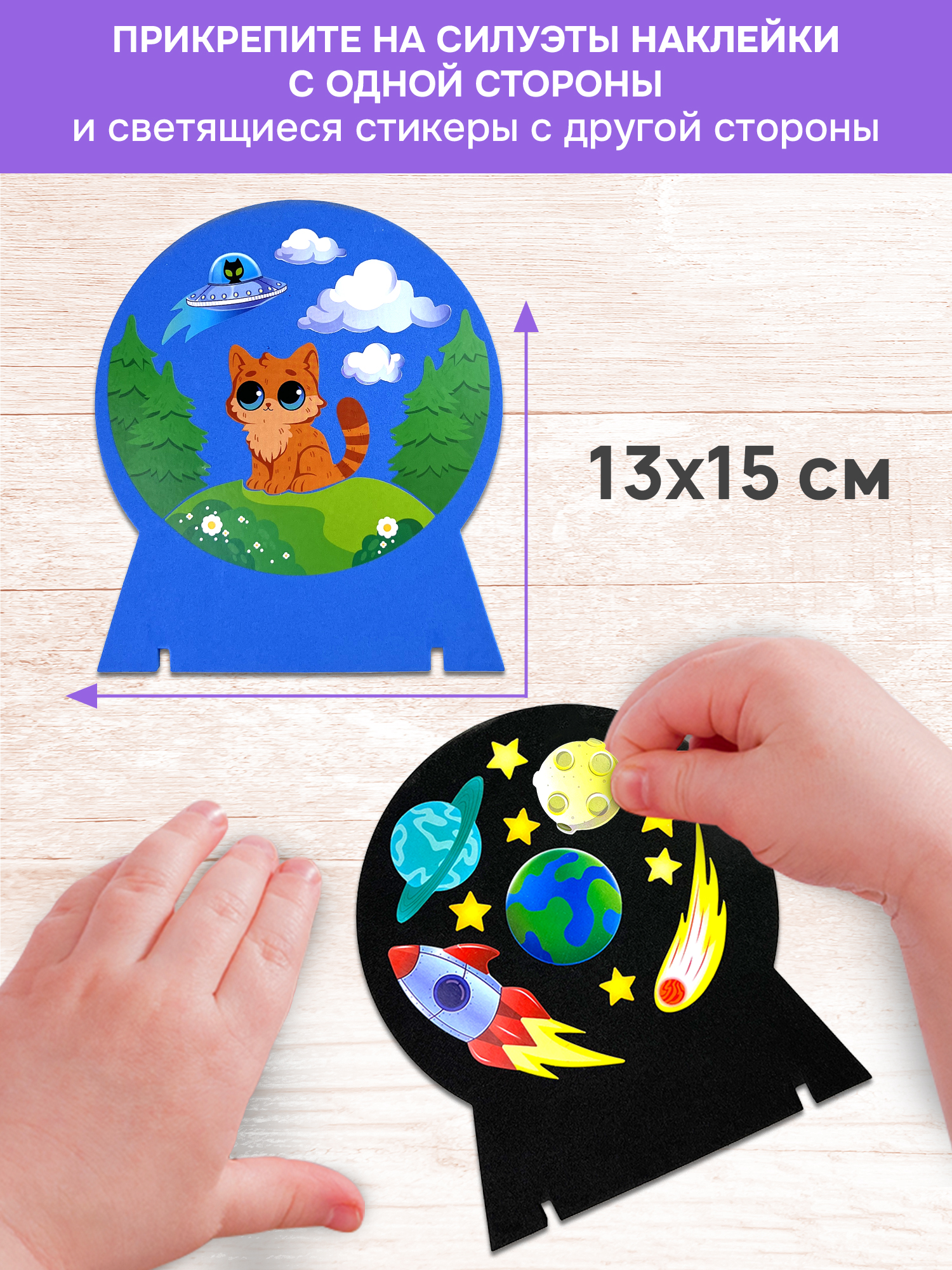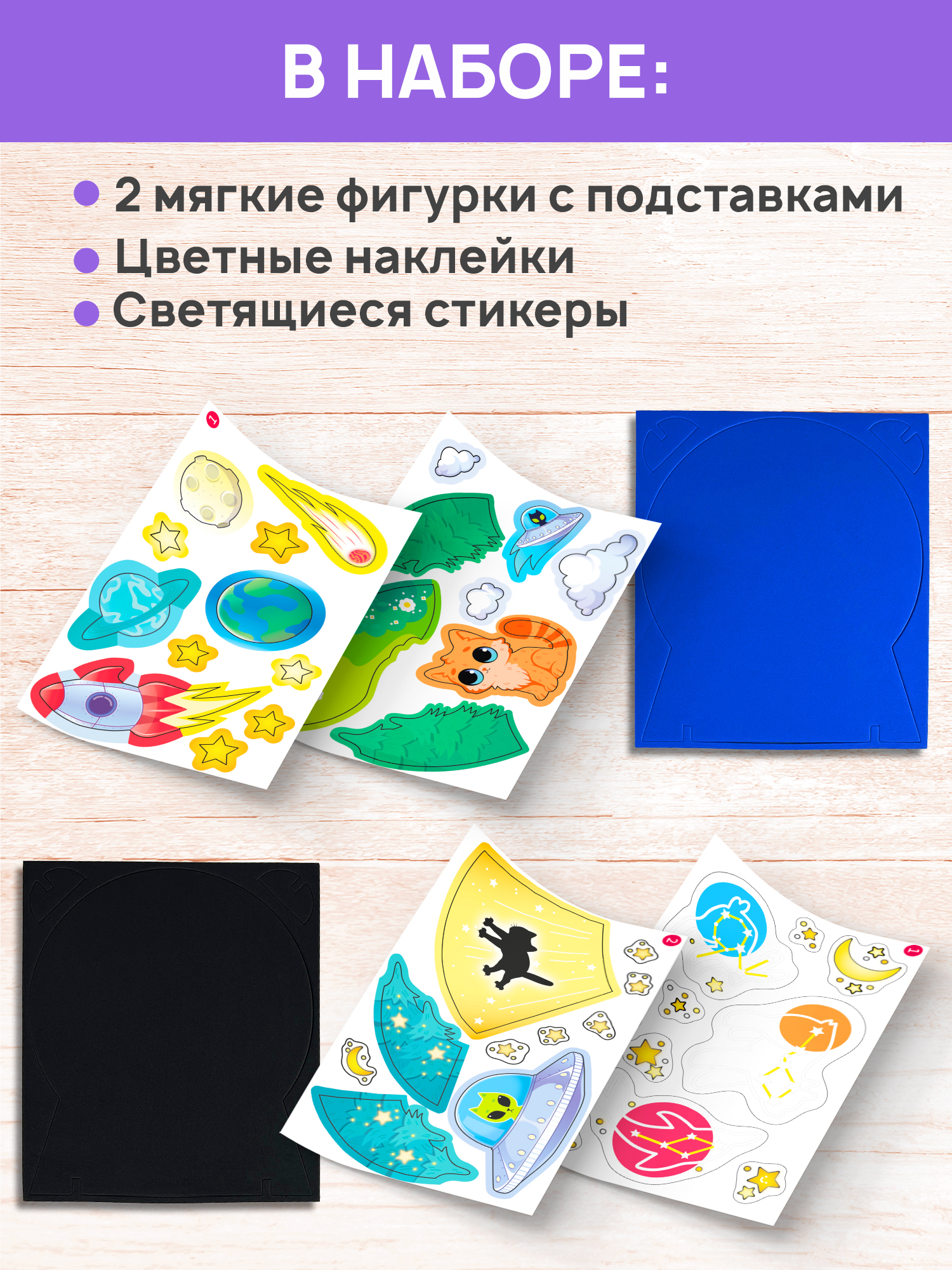 2 основы из мягкого пластика ЭВА с подставками, цветные наклейки, светящиеся стикеры.