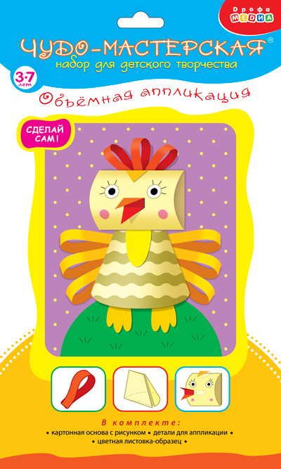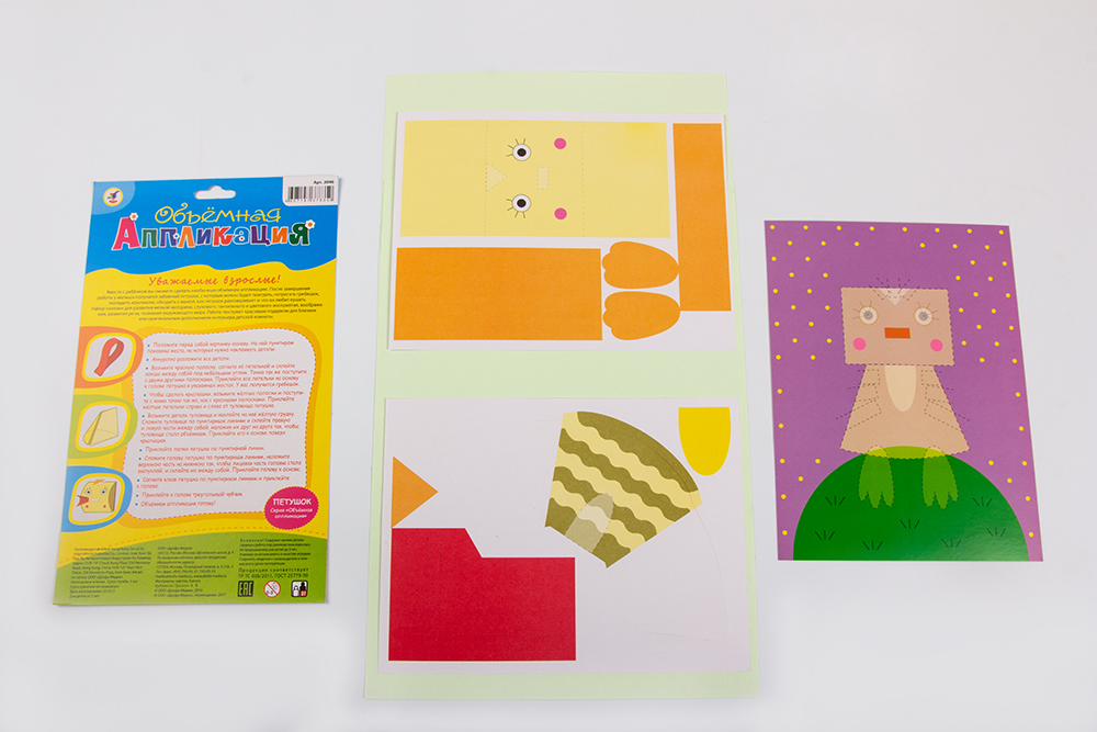 Бумагу, как известно, изобрели в Китае, а вот искусство аппликации появилось значительно раньше — на заре человеческой эпохи как способ украшения одежды и обуви. В настоящее время аппликация стала одним из первых видов искусства, который осваивают наши дети. С помощью набора для творчества «Объёмная аппликация» юный творец создаст красочную картинку с объёмными элементами. Поделка проста в исполнении — возьмите уже вырубленные детали картинки, с помощью инструкции сделайте некоторые из них выпуклыми или «плиссированными» и наклейте на картинку-основу. Готовую аппликацию можно не только повесить на стенку в качестве украшения, но и использовать во время игры.