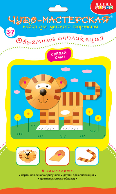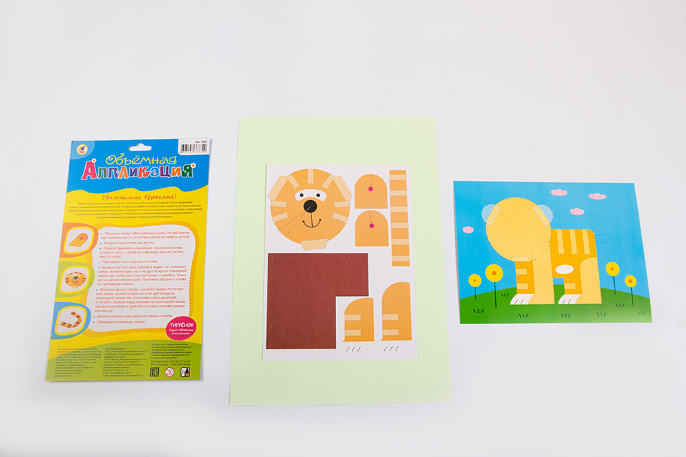 Бумагу, как известно, изобрели в Китае, а вот искусство аппликации появилось значительно раньше — на заре человеческой эпохи как способ украшения одежды и обуви. В настоящее время аппликация стала одним из первых видов искусства, который осваивают наши дети. С помощью набора для творчества «Объёмная аппликация» юный творец создаст красочную картинку с объёмными элементами. Поделка проста в исполнении — возьмите уже вырубленные детали картинки, с помощью инструкции сделайте некоторые из них выпуклыми или «плиссированными» и наклейте на картинку-основу. Готовую аппликацию можно не только повесить на стенку в качестве украшения, но и использовать во время игры.