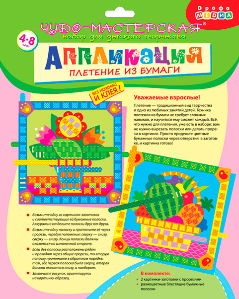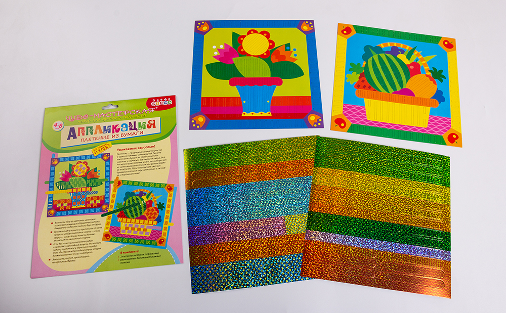Набор понравился дочке (4 года). Наклейки, пластилин уже поднадоели, а здесь что-то новое - плетение из бумаги. Занятие интересное, но нужно осторожно с полосками - могут порваться. Инструкция есть на упаковке.