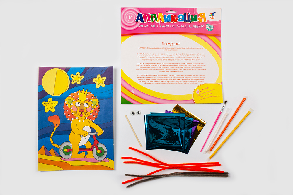 Эта необычная аппликация заинтересует детей, которые уже мастерили поделки из разных материалов и хотят попробовать что-то новенькое. Для украшения картинки в нашем наборе используются три разных материала: блестящая фольга, шероховатый песок и пушистые палочки (синельная проволока). Всем, конечно, интересно, а что же из этого может получиться? Попробуйте — и вам понравится! Яркая и весёлая картинка приобретает ощутимый объём, фактурность и мерцающий блеск.